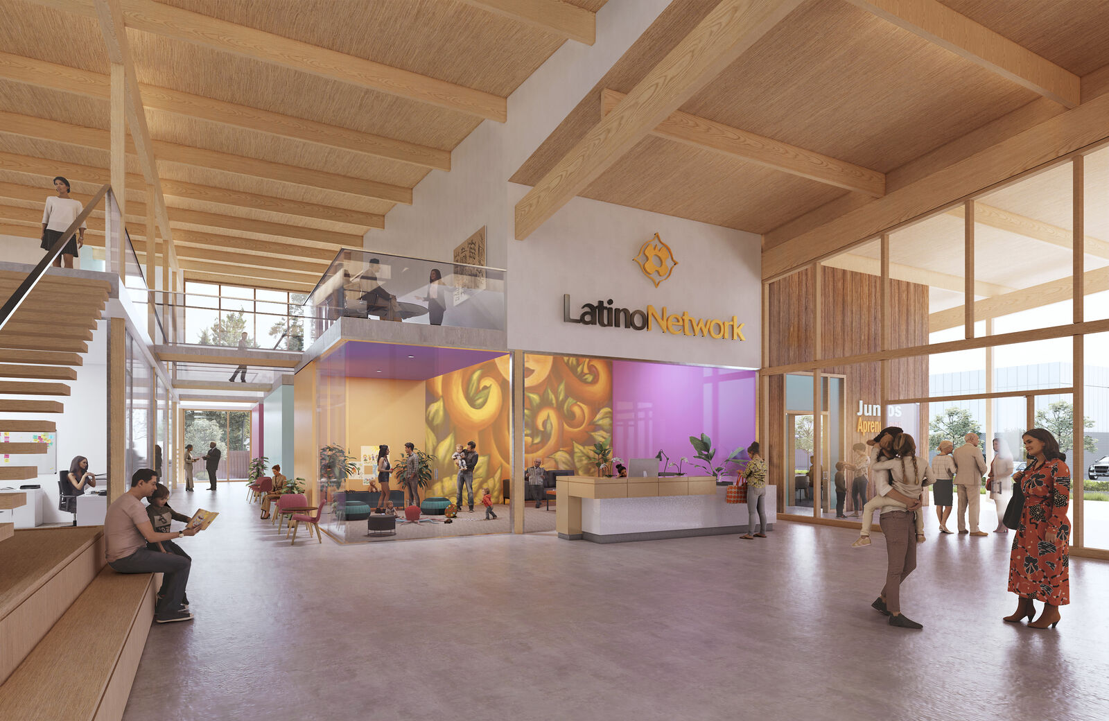 The entryway doors open to a main hall where the nonprofit’s primary services are connected by a mixed-use lounge that conveys the importance of multigenerational living to the Latino community.