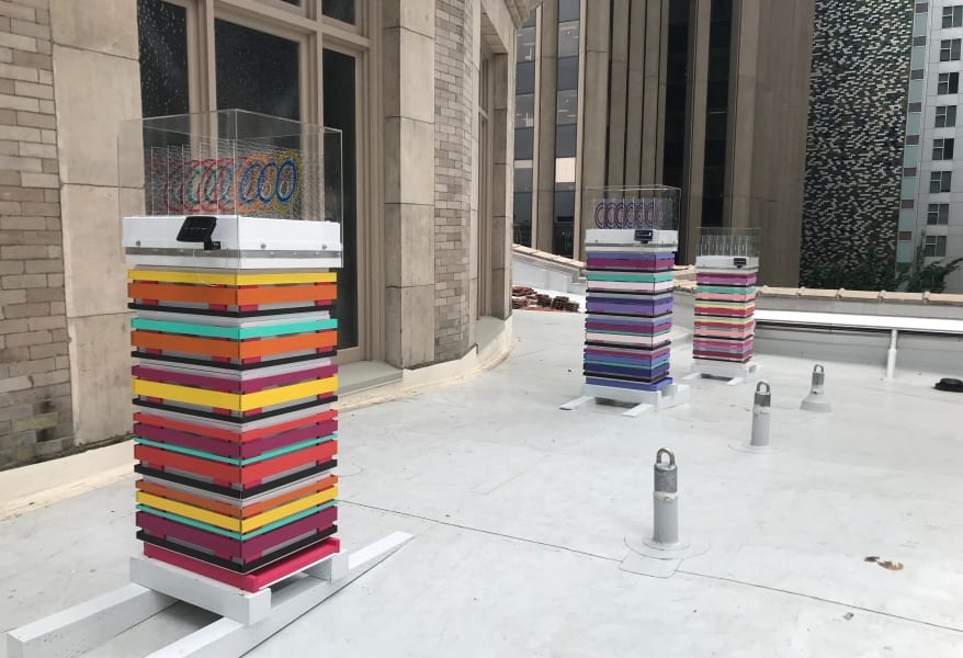 - Color: Any surfaces that bees come into contact with need to be left untreated, so the team funneled their creative energies toward the design of the painted exteriors. The final colors were sampled from regional pollinator-preferred flower species, like bright orange nasturtiums, yellow black-eyed susans, purple borage and pink marguerite daisies.