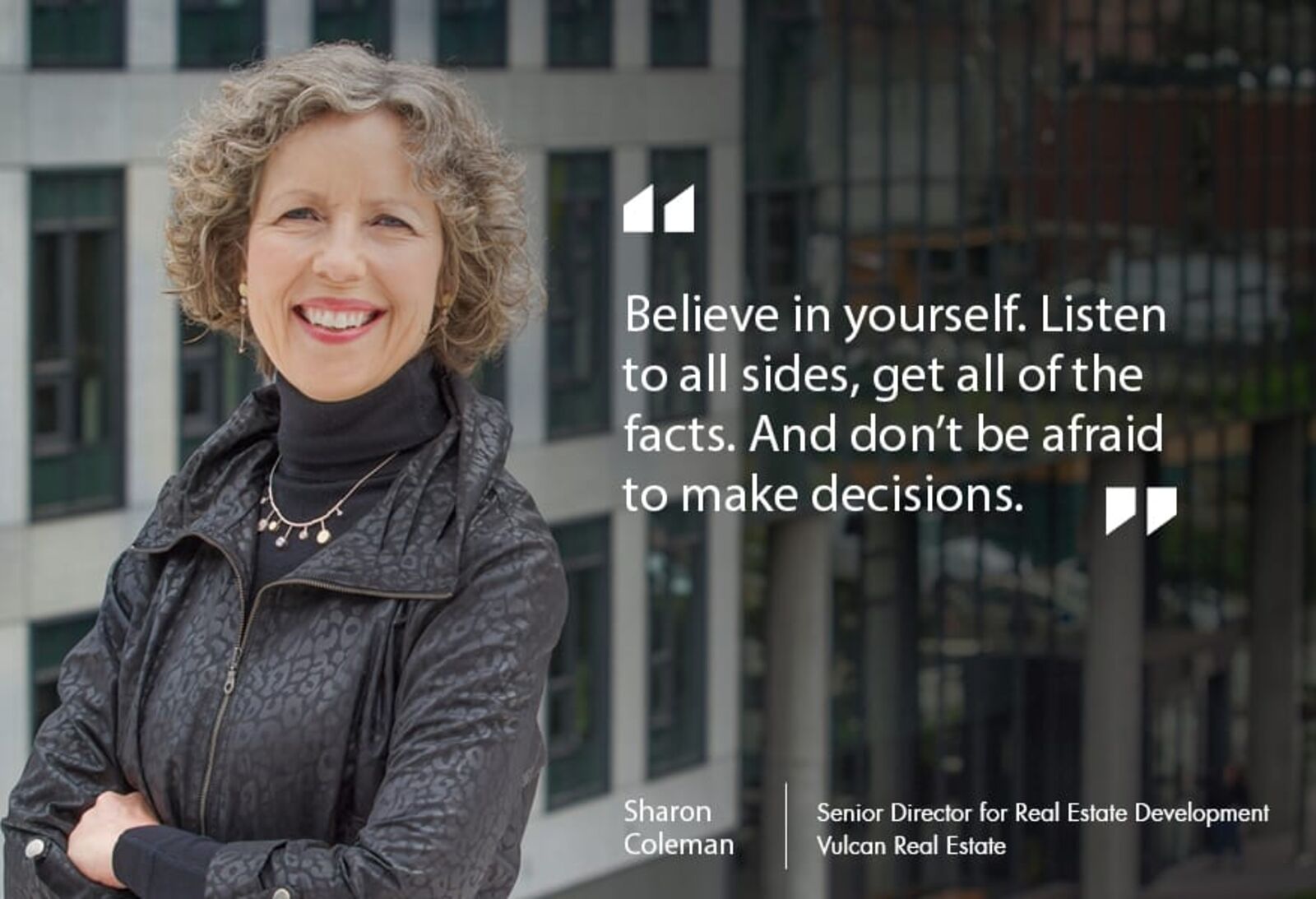 Sharon’s journey would lead her to a different calling: initially to architecture, and eventually to Vulcan Real Estate as one of its first employees. As the senior director for real estate development, Sharon is among the visionaries behind the transformation of downtown Seattle’s South Lake Union neighborhood into of an innovation hub.