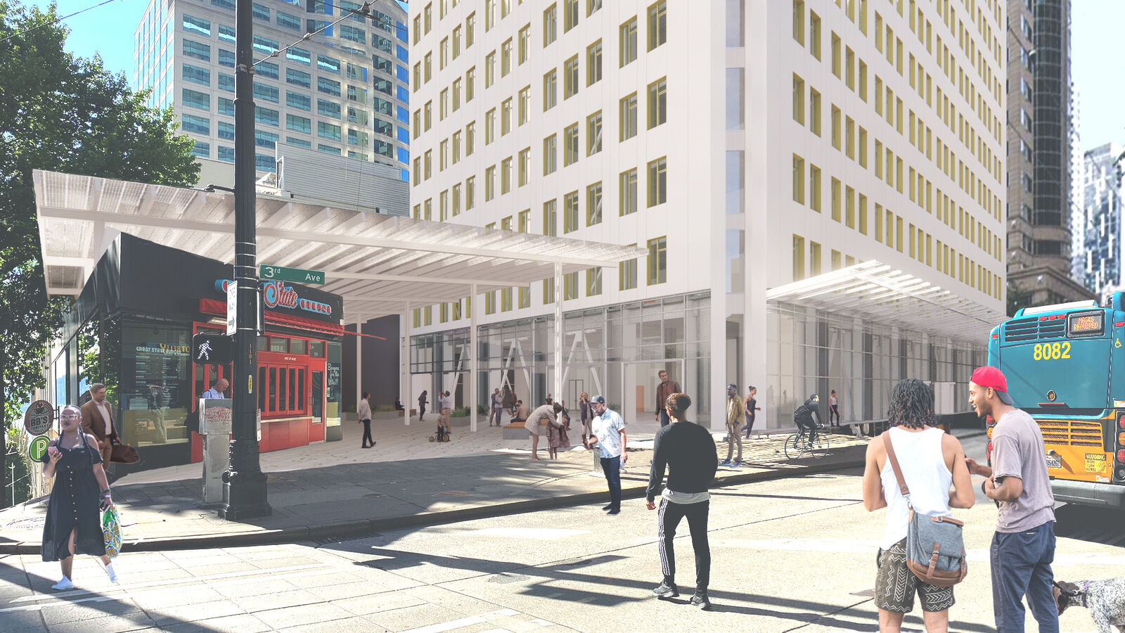 Perhaps most impressive, the proposed concept would reduce the 1111 Third Avenue Building’s overall carbon footprint by 75%—with transportation playing a key role. Given that Seattle’s electrical grid is already the greenest in the nation, we looked holistically at other sources. The District Carbon team leveraged the fact that downtown Seattle residents already have the lowest carbon footprint of any zip code in the region, with their higher rate of public transit, biking, and walking. By introducing residential in the building program mix, carbon emissions specifically from commuting to and from downtown for work and/or leisure could be reduced by nearly 78%.