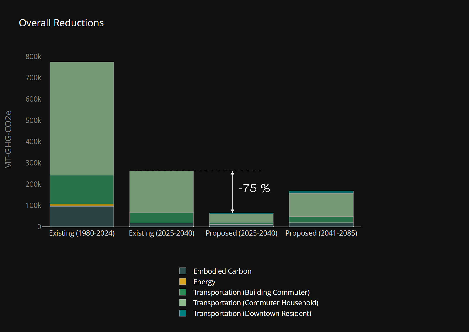 A series of time horizons show cumulative district carbon (operational, embodied, and transportation) impacts for Existing vs. Proposed. The proposed concept 2025-2040 has 75% lower carbon emissions, largely due to less transportation and some embodied carbon reductions. In both cases, operational carbon (energy) is net zero, illustrating the increasing focus on low carbon transit and supply chains.