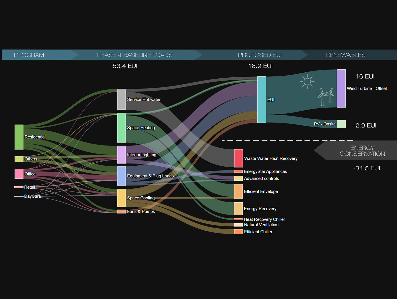 The Sankey diagram illustrates the split of energy loads at the left. The proposed energy conservation strategies would reduce the building’s EUI by 65%. The remaining energy can be offset through renewables such as onsite solar and offsite wind power.