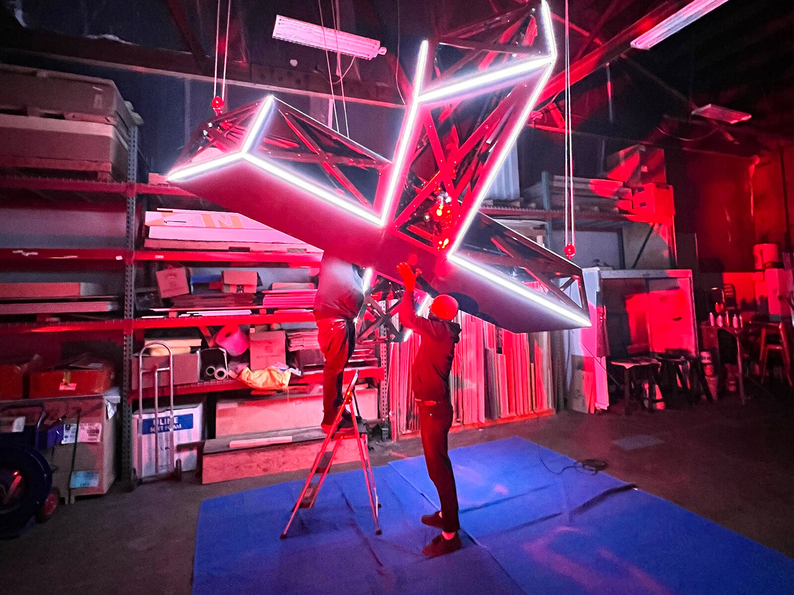 The musicians teamed with Bryant Place, a Portland, Oregon-based director, and approached ZGF with a challenge—to build a large-scale and complex yet portable X (representing the Roman numeral Ten in reference to the duo’s anniversary) that would fly out over the crowd as the centerpiece of their live shows and ensure it could be broken down and easily shipped during the duo’s world tour. The X required technology and surface materials that allowed for phase changes with different lighting experiences as it, along with the entire stage and visuals engage with the audience throughout the concert. The nearly 9-foot-tall X breaks down into 4 identical crates for air and road shipping.