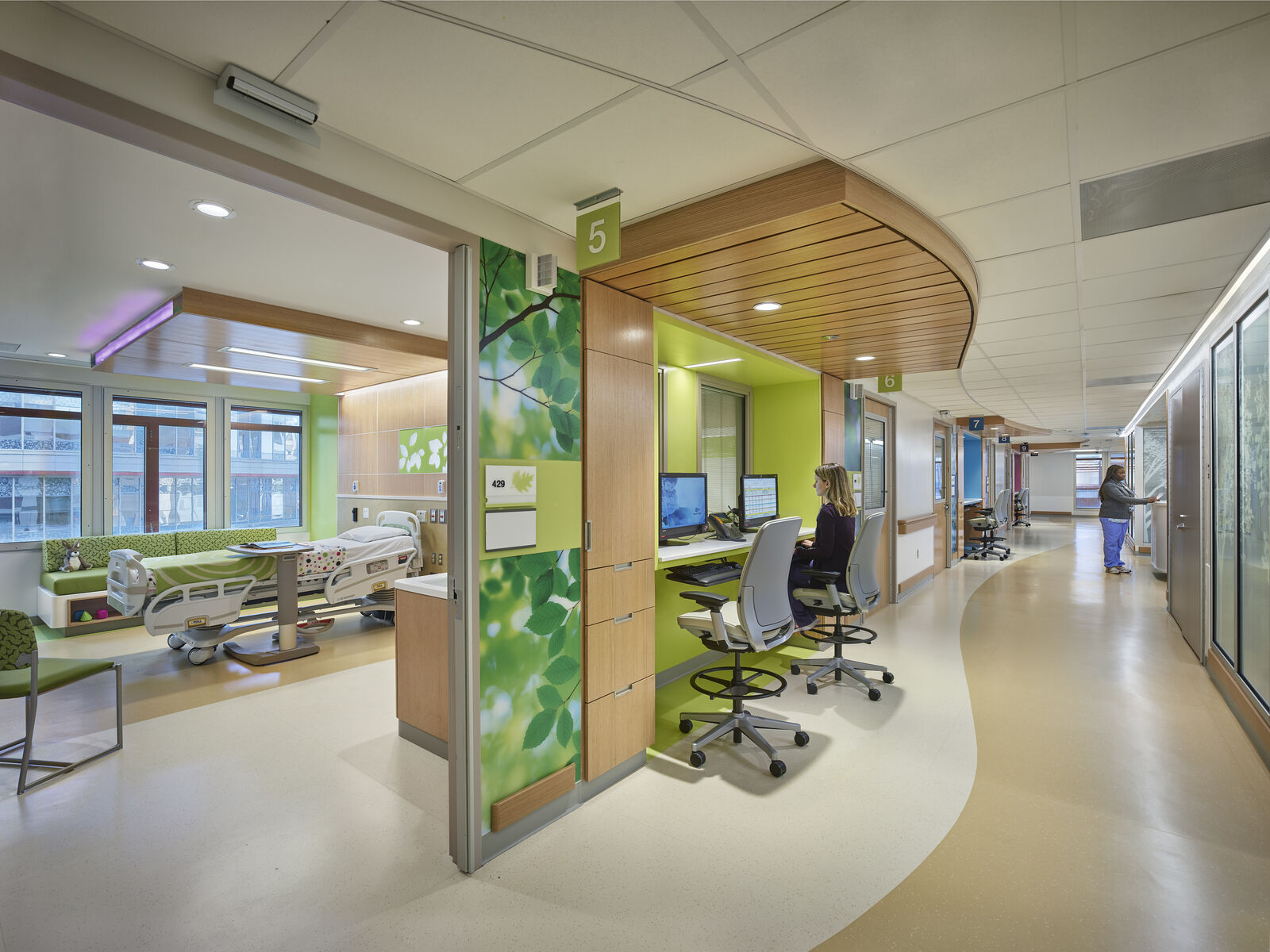 Inside Cincinnati Children’s newly expanded emergency department, the behavioral health treatment area features fully enclosed care team space (left) and open team space in the medical treatment area (right).