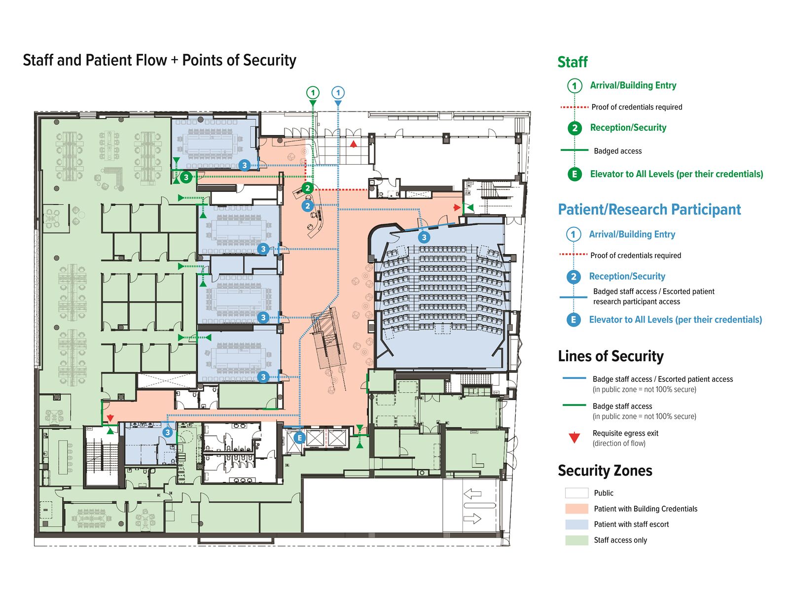 With the overarching goal of destigmatizing mental healthcare, the USCF Nancy Friend Pritzker Psychiatry Building program establishes clear access zones without overt security barriers. The pink and blue patient zones require building credentials or a staff escort, while the green zone is limited to researchers, faculty, and staff only.