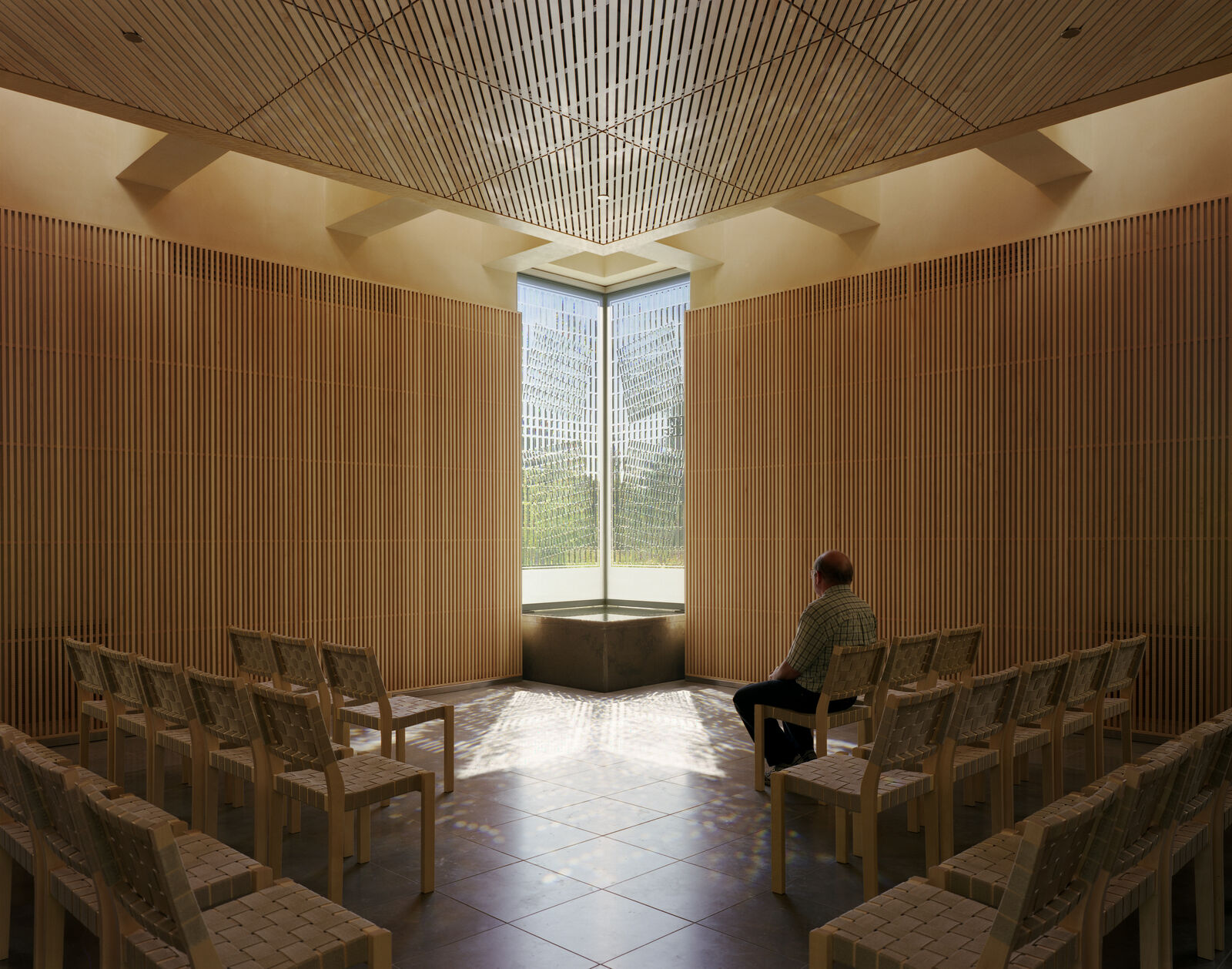 Access to outdoor spaces, food services, spiritual reflection or meditation spaces, and other amenities allow families, visitors, and staff to step outside the clinical environment to care for themselves, eat a meal, take a breath, and regroup. For patients and visitors with post-traumatic stress disorder (PTSD) from trauma, military service, inpatient psychiatric care, or other life events, walking into a warm and welcoming environment can help deter feelings of being threatened or trapped that may trigger violence.