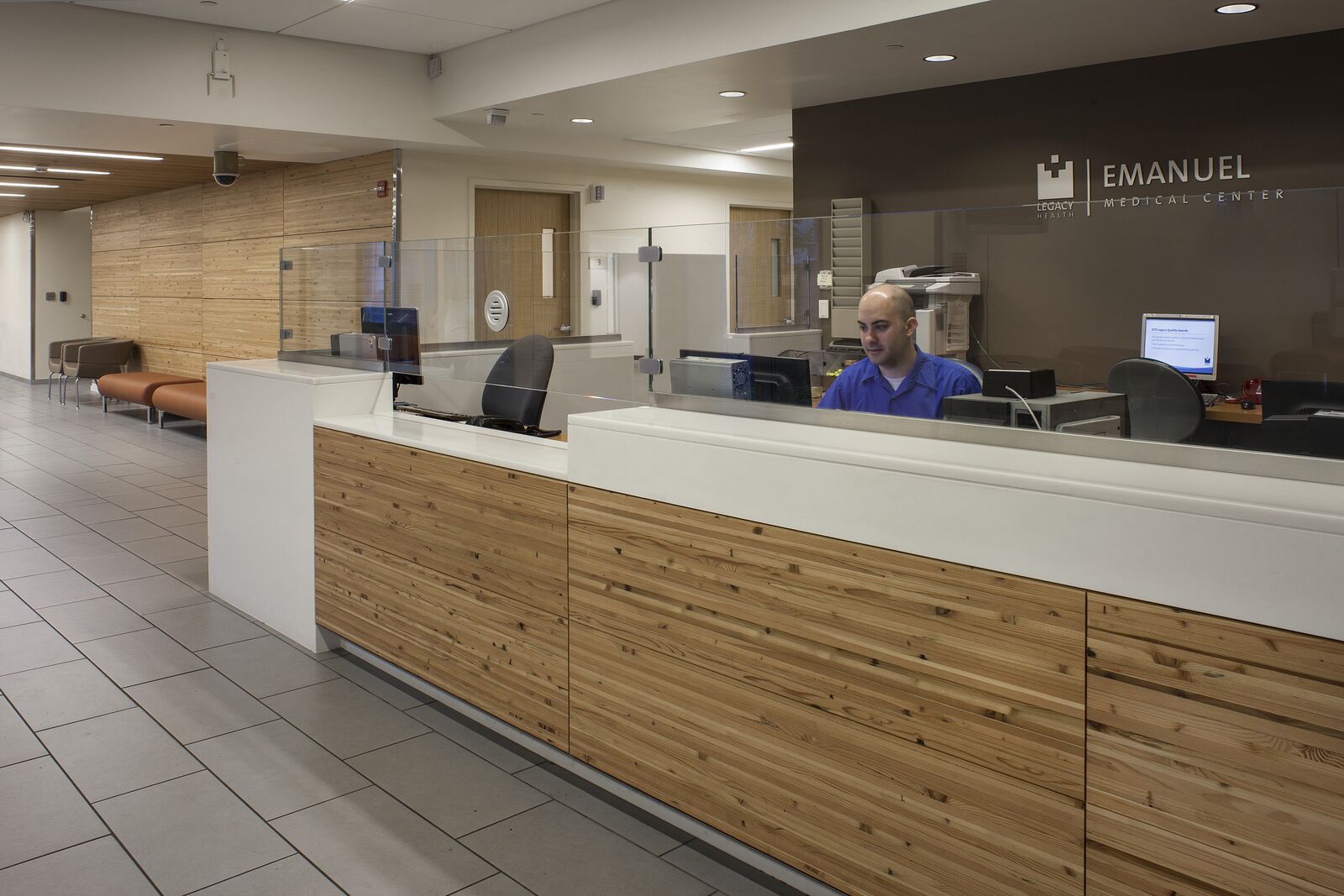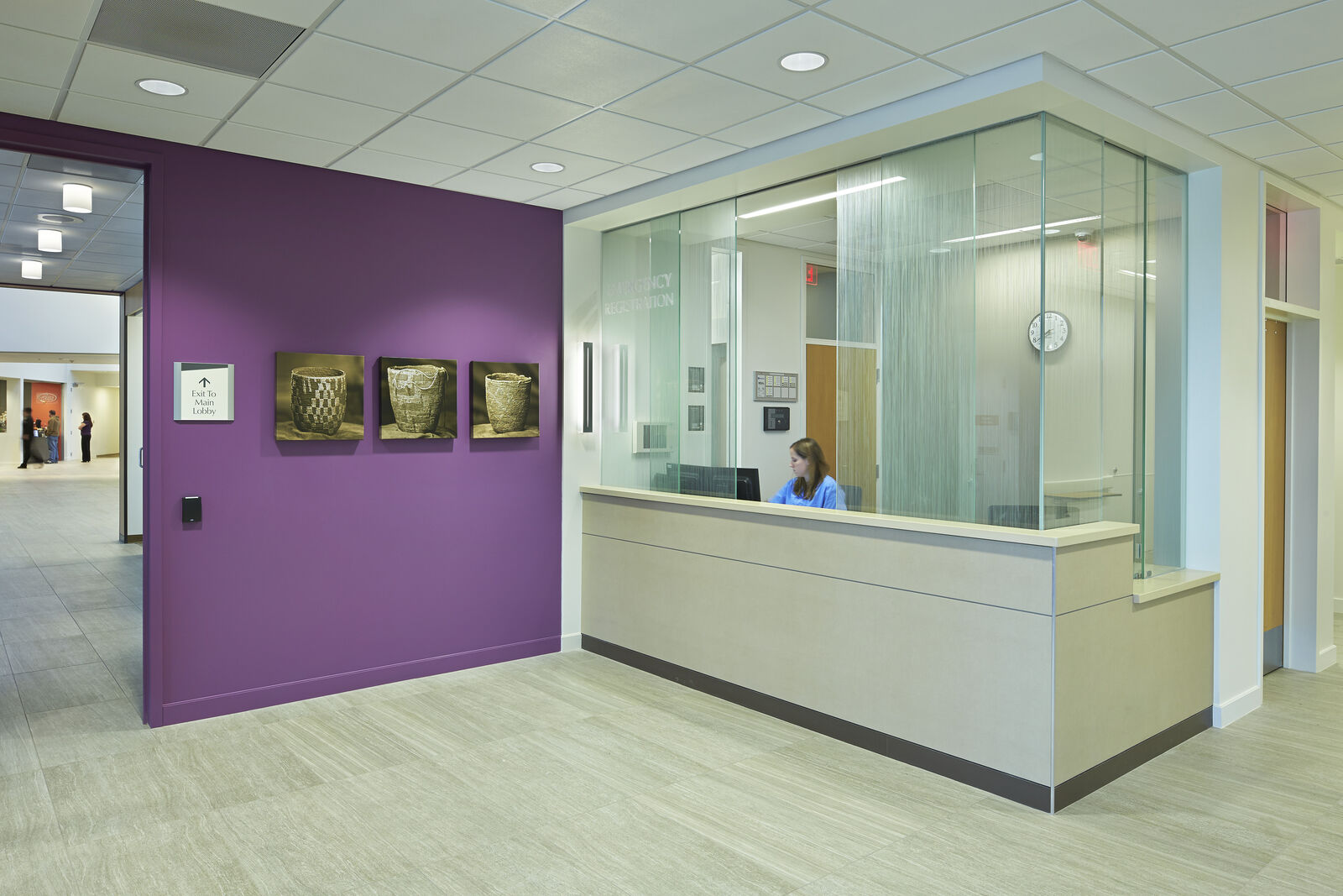 Many planning and design strategies that enhance visibility can also help deter violence—through adjacencies, sightlines, flow, lighting, and transparent doors and windows. In an emergency department, for example, staff and security personnel need clear sightlines to the Emergency Department front door and waiting areas so they can observe who is entering the department, including monitoring body language. Registration desks may be enclosed or semi-enclosed with glass, or completely open with “back door” access to a secure area. The enclosed and semi-enclosed design approach provides some safety for the care team while maintaining visibility; however, it creates a different patient and family experience that may be perceived as less friendly.