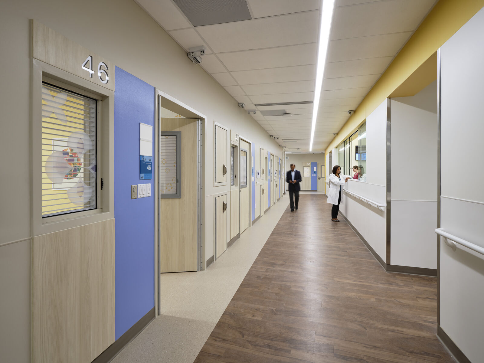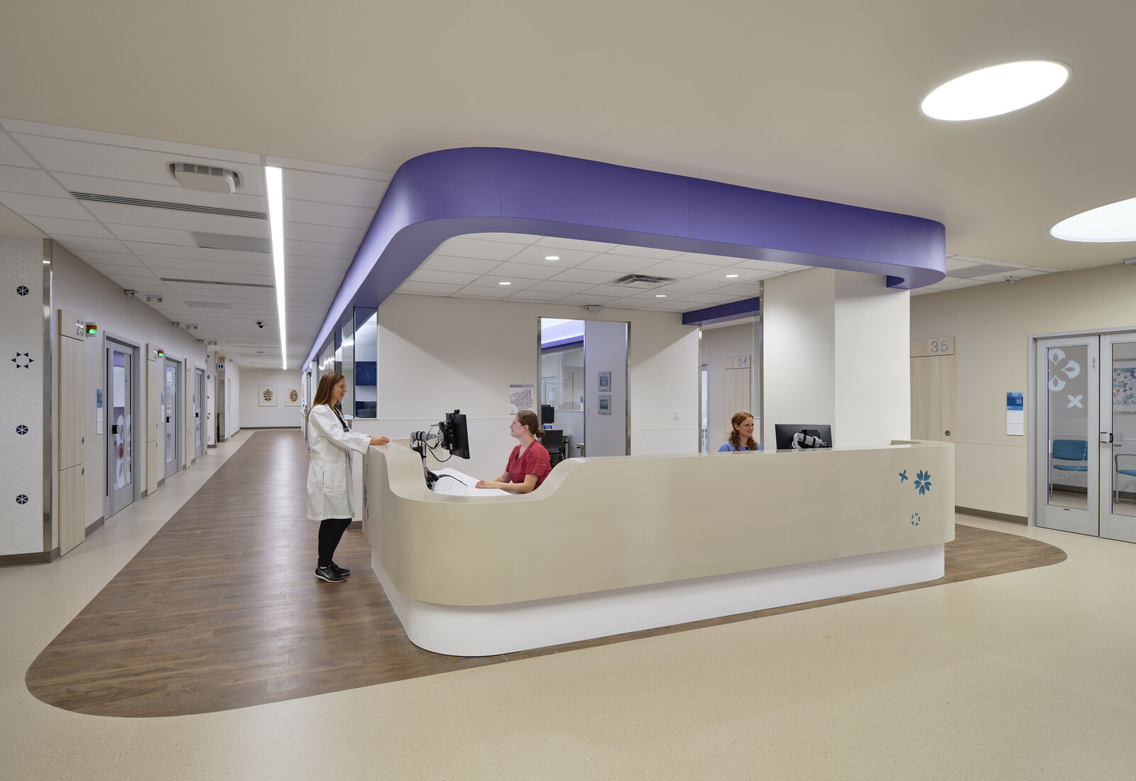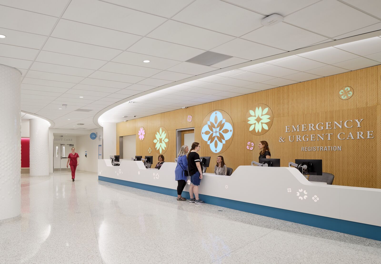 Healthcare facilities are stressful places. It’s no wonder that people feel a wide range of emotions—from joy and relief, to frustration and grief. Our role as designers is to create uplifting, nurturing healing environments that support their journey at every step. It can be as simple as providing windows for daylight and connection to nature; positive distractions through artwork, color, lighting, environmental graphics, and architectural details; and care team respite spaces to decompress and recharge. Basic design principles that we incorporate into every project can help mitigate violence by reducing stress and supporting mental health and wellbeing.