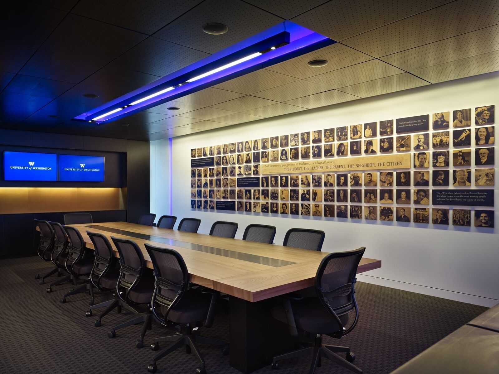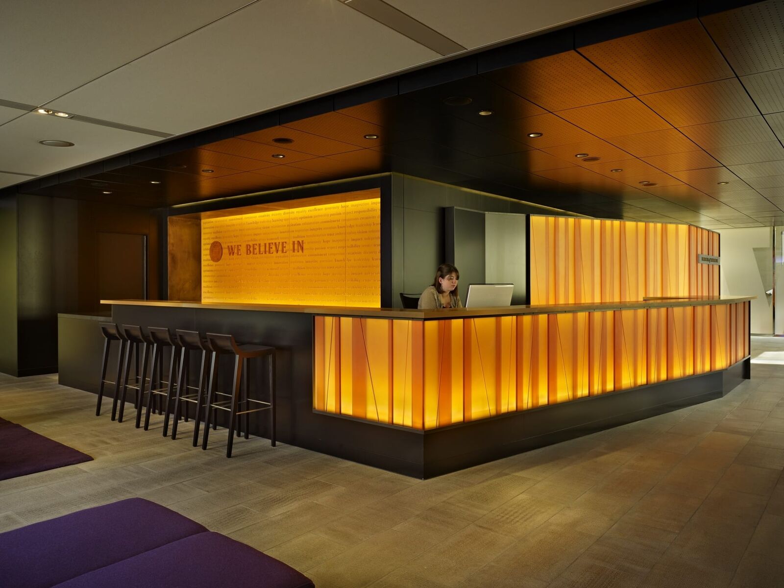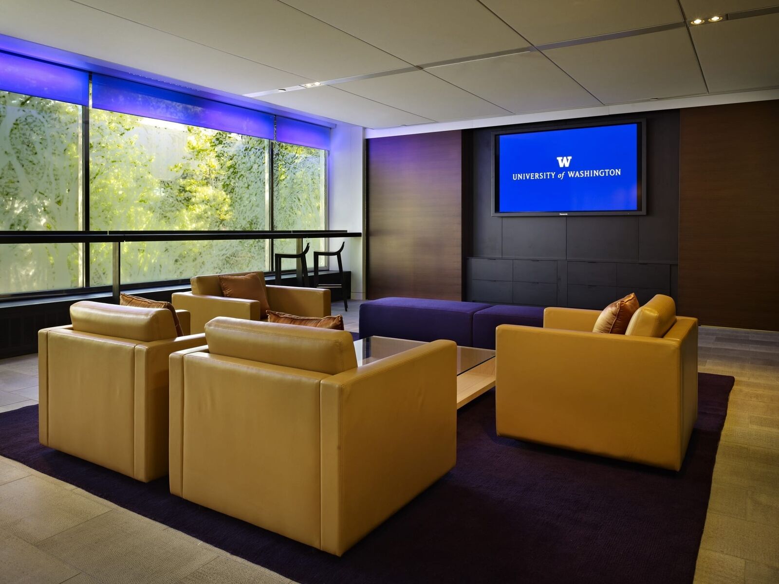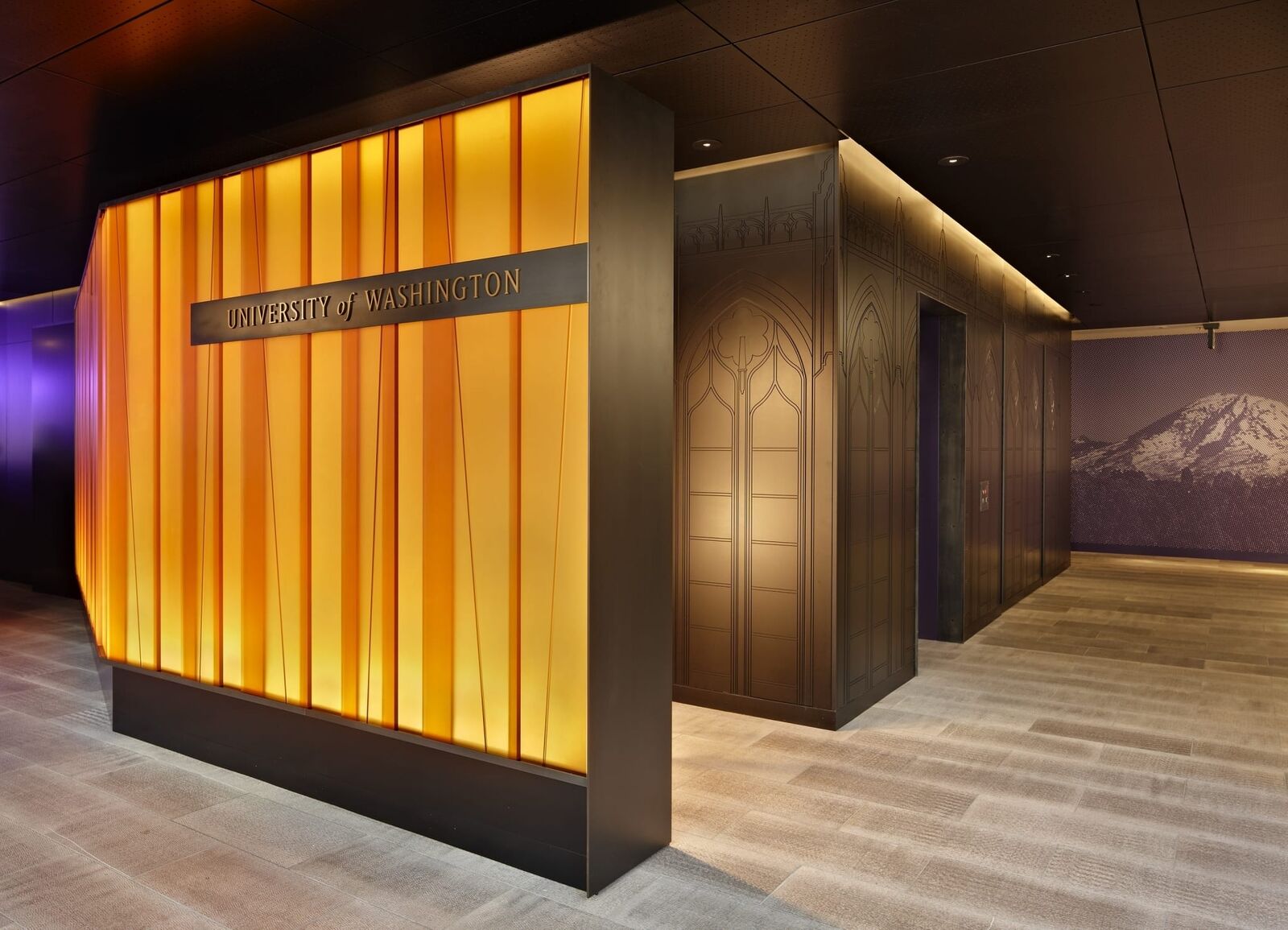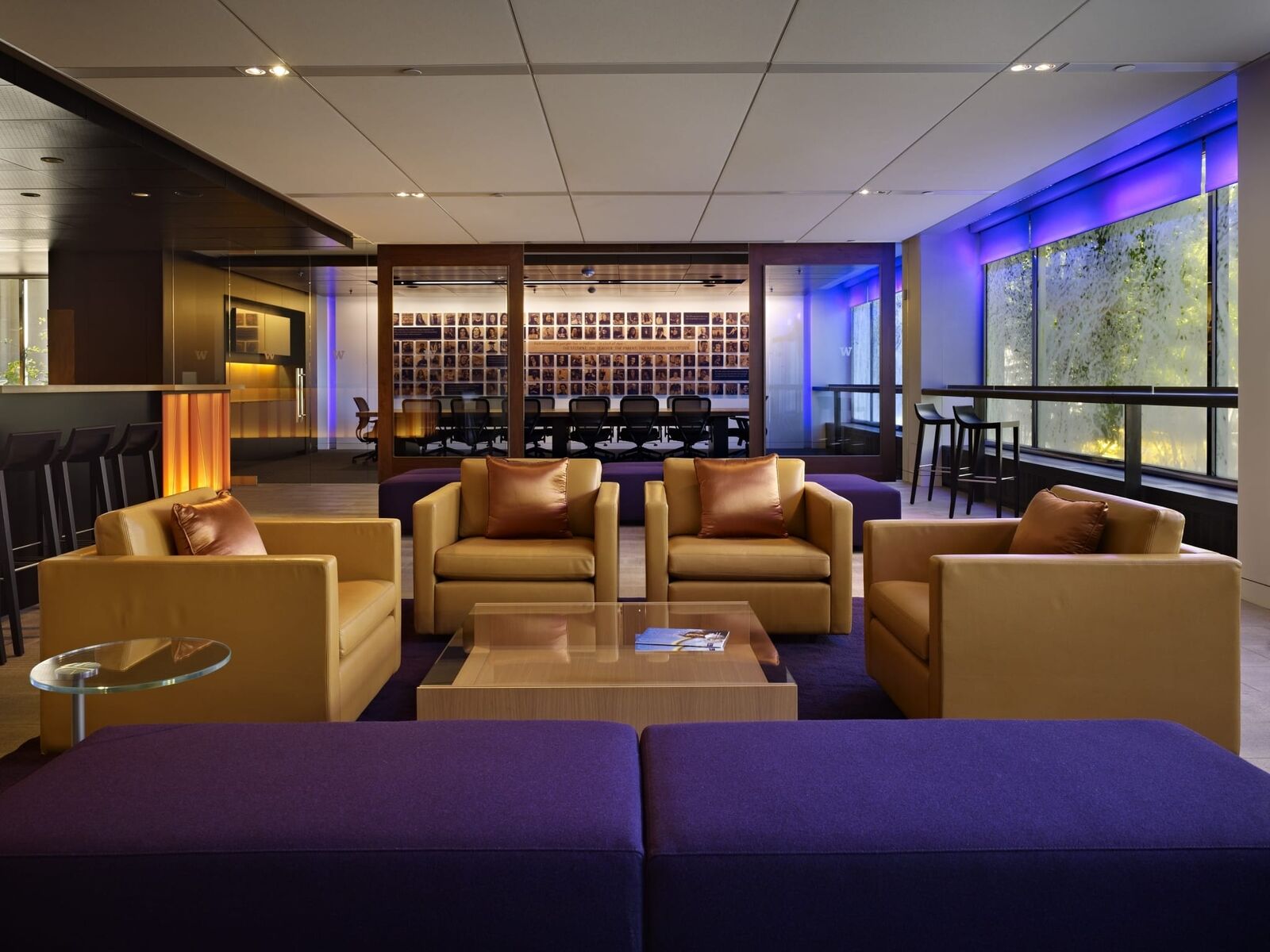 ZGF designed the commons—the new home for the Office of Advancement and the Alumni Association—to provide a welcoming, hospitable and memorable environment that conveys the spirit and rich history of the university. The 4,000 SF space includes reception, a living room style main gathering space, and a large conference room supported by a catering kitchen to host fundraising events and alumni gatherings. In working with the university to develop the vision for the space, identify commonalities between mission and program of both groups and to interpret the campus’ history, legacy and image a number of themes emerged that were embraced in the design including concepts of permanence, legacy, timelessness, transformation, and purpose. To evoke these themes gold and purple materials, finishes and lighting—traditional UW colors—were used generously throughout, elements such as the gothic relief and lit panel at the entry recall the historic Suzzallo Library form and stained glass windows at the heart of the campus, and the main board room includes a graphic composition of alumni celebrating the legacy of the institution.