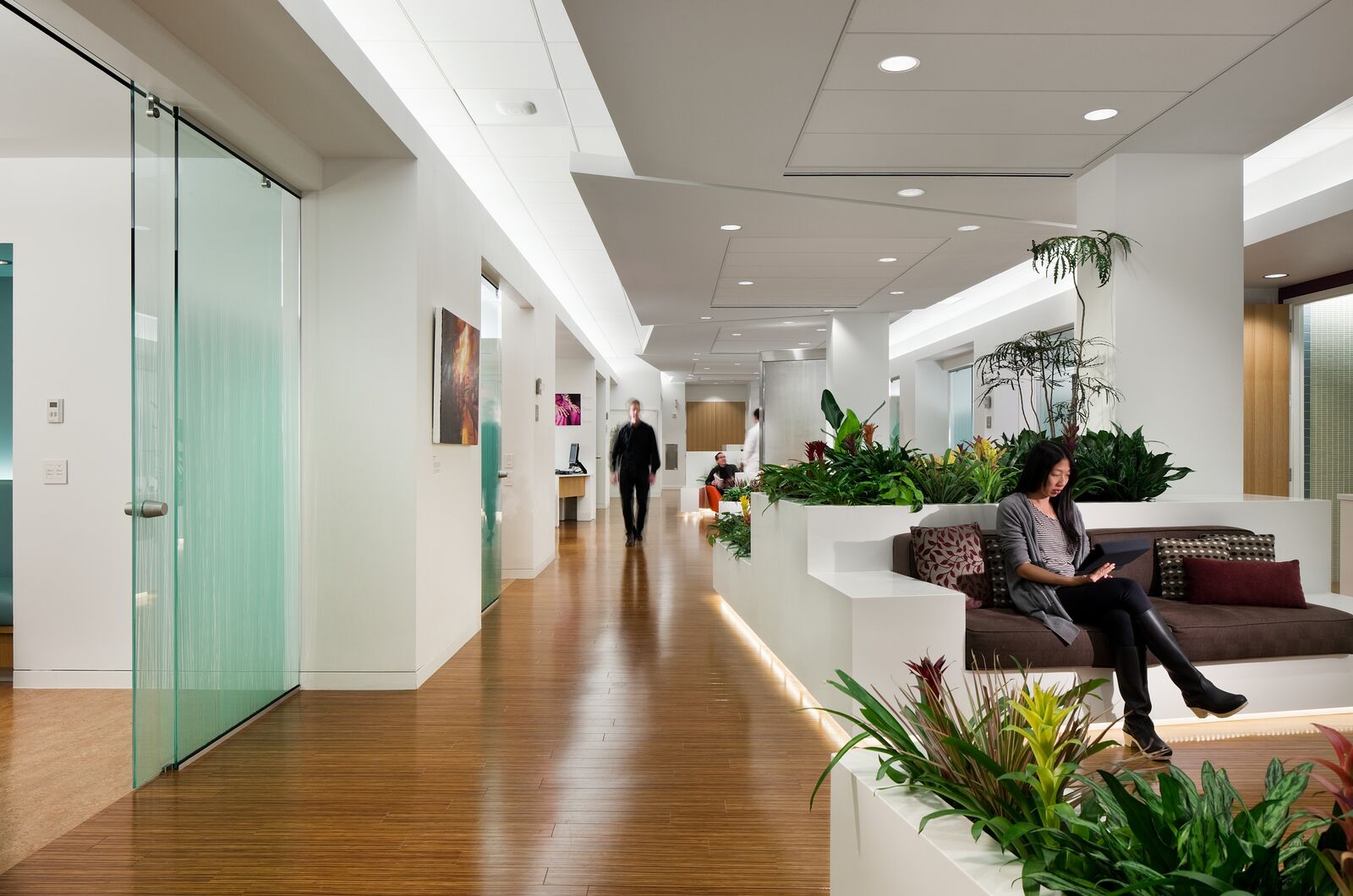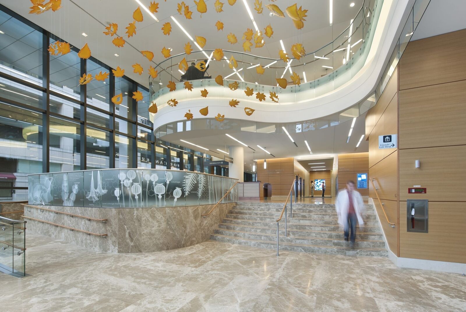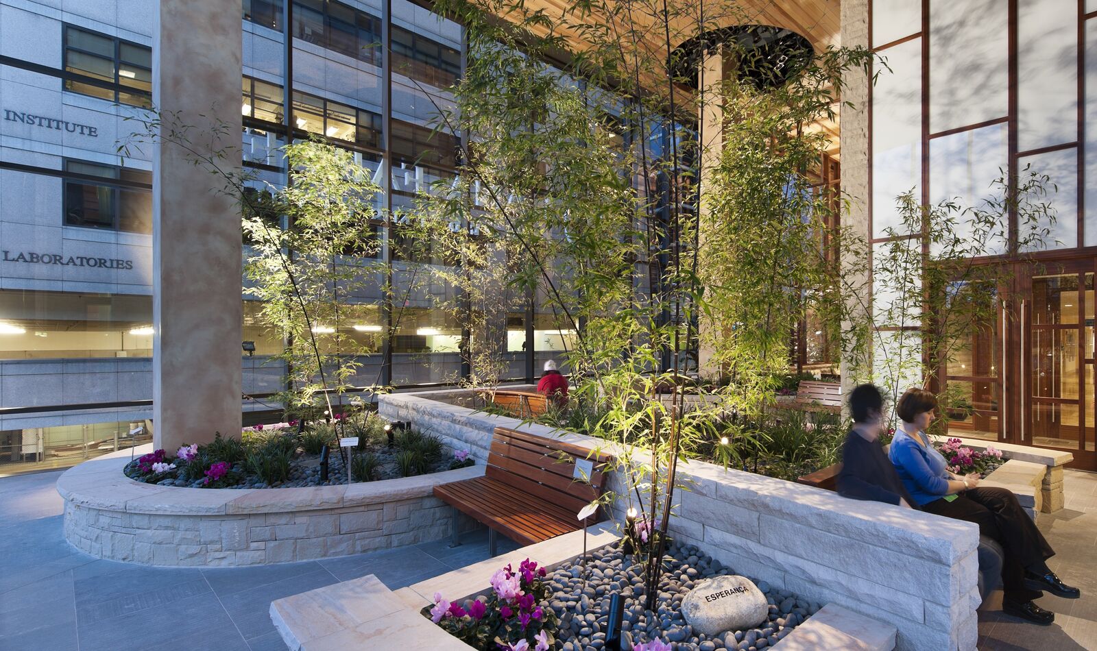 A project goal was not only to design a healing environment but also to bring nature back into what is a dense high-rise neighborhood. To achieve a park-like setting in an urban, multi-story building, green roofs are located on multiple levels. Each includes native and adaptive plants to mitigate stormwater runoff and provide a habitat for local fauna.