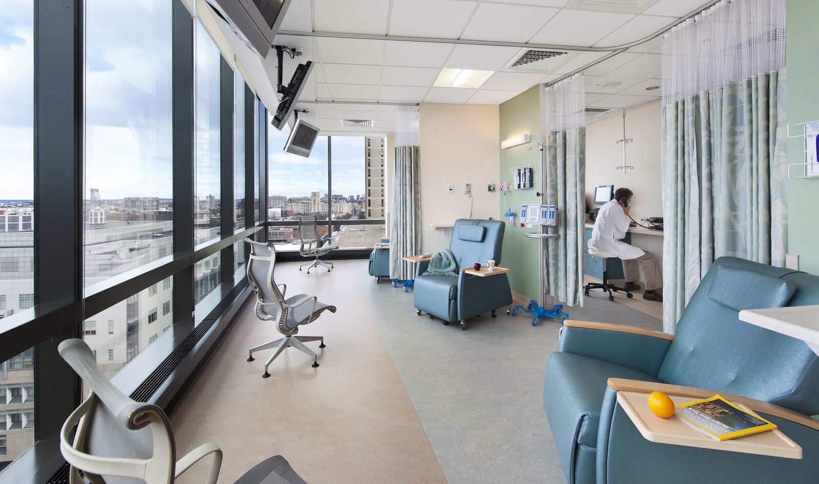 Collaboration between the design team and Dana-Farber’s Patient and Family Advisory Councils resulted in a healing environment that maximizes patient safety and comfort. Two key clinical services—laboratory services for phlebotomy and patient registration—are centralized, streamlining the process for infusion patients. Throughout the building, waiting areas, open infusion rooms, and consultation rooms are located along the perimeter to take advantage of natural daylight and extensive city views.