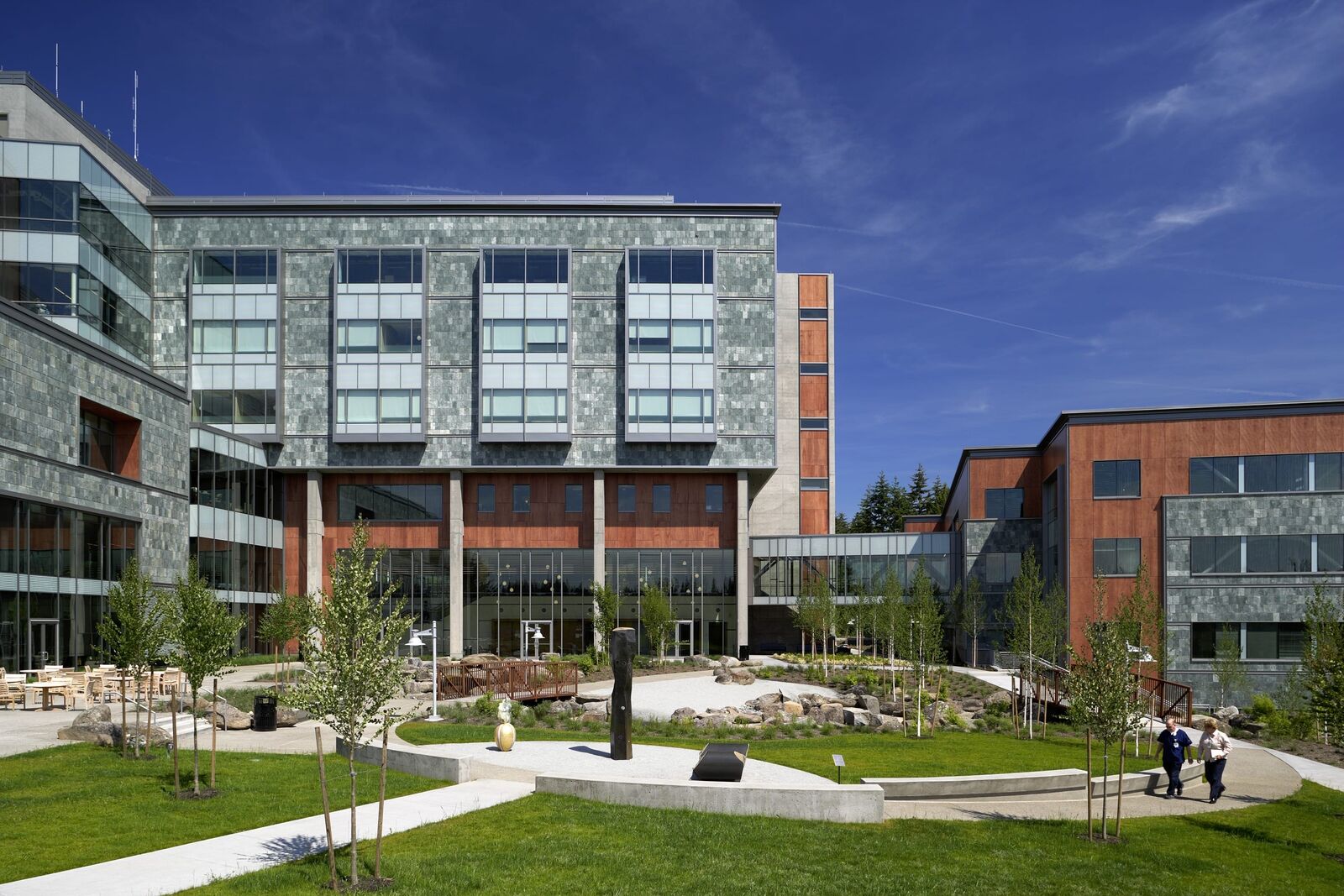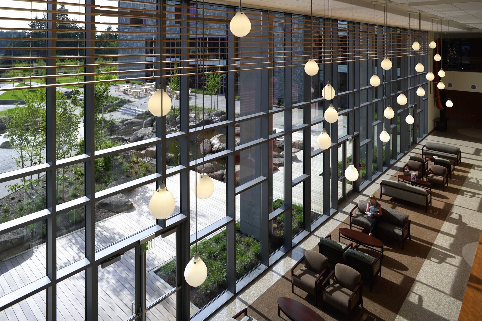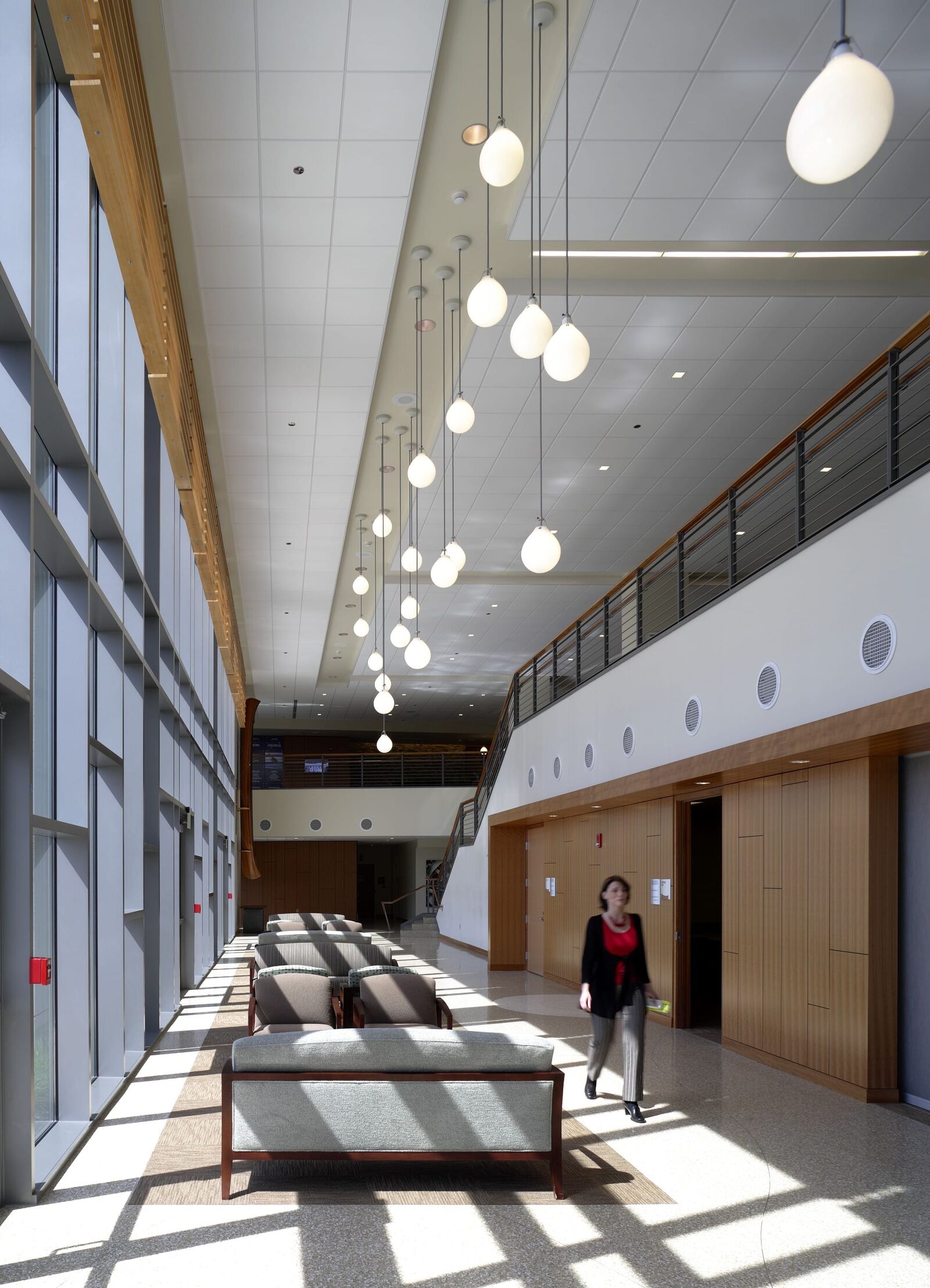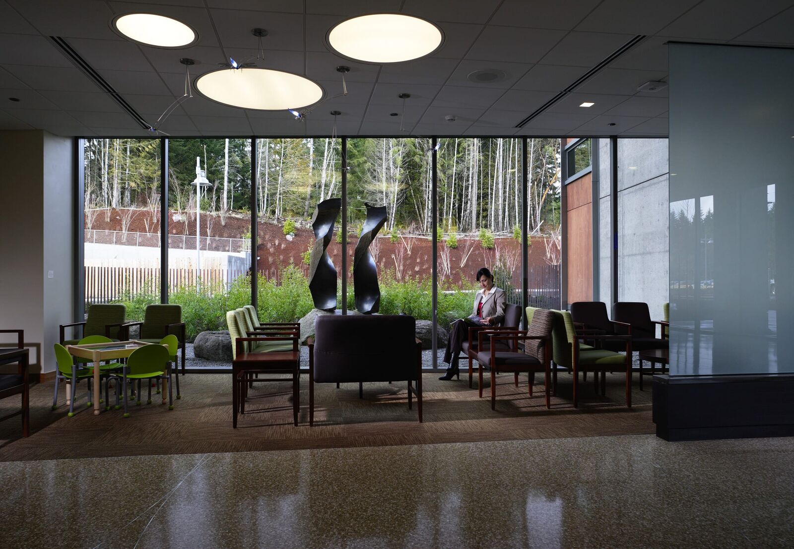ZGF programmed and designed the 256,000 SF, 80-bed acute-care hospital on a 30-acre site. Through Integrated Design Events with hospital staff and leadership, the project team analyzed areas of waste and implemented a Lean, cross-functional approach to minimize waste and enhance patient-centered care. The process resulted in increased operational efficiency; an example includes a split-flow process for triaging emergency room patients that has reduced the average wait time to approximately 10 minutes. The hospital includes a 24-hour emergency department; medical, surgical, and critical care units; inpatient and outpatient surgery; a heart catheterization laboratory; diagnostic services; physical, occupational, and speech therapies; and a 600 SF chapel. Outside the hospital, walking paths and nature trails throughout the wooded campus adjoin with an existing public pedestrian path and park-and-ride, enabling alternative transportation options for hospital employees, patients, and visitors.