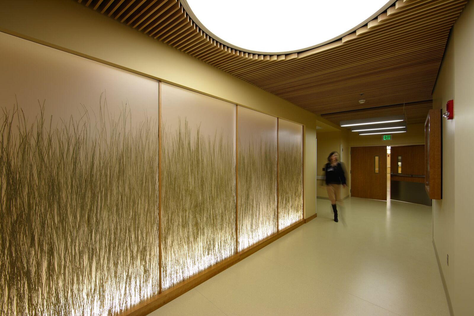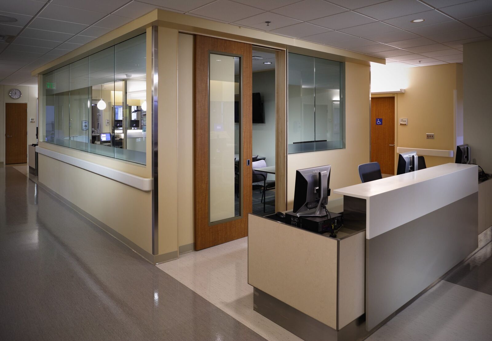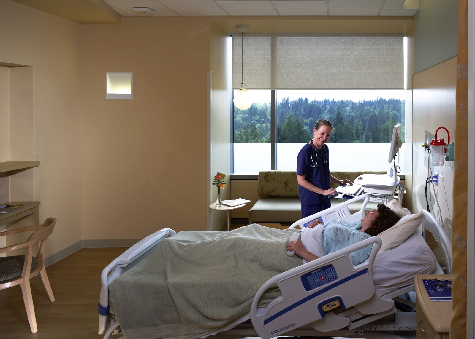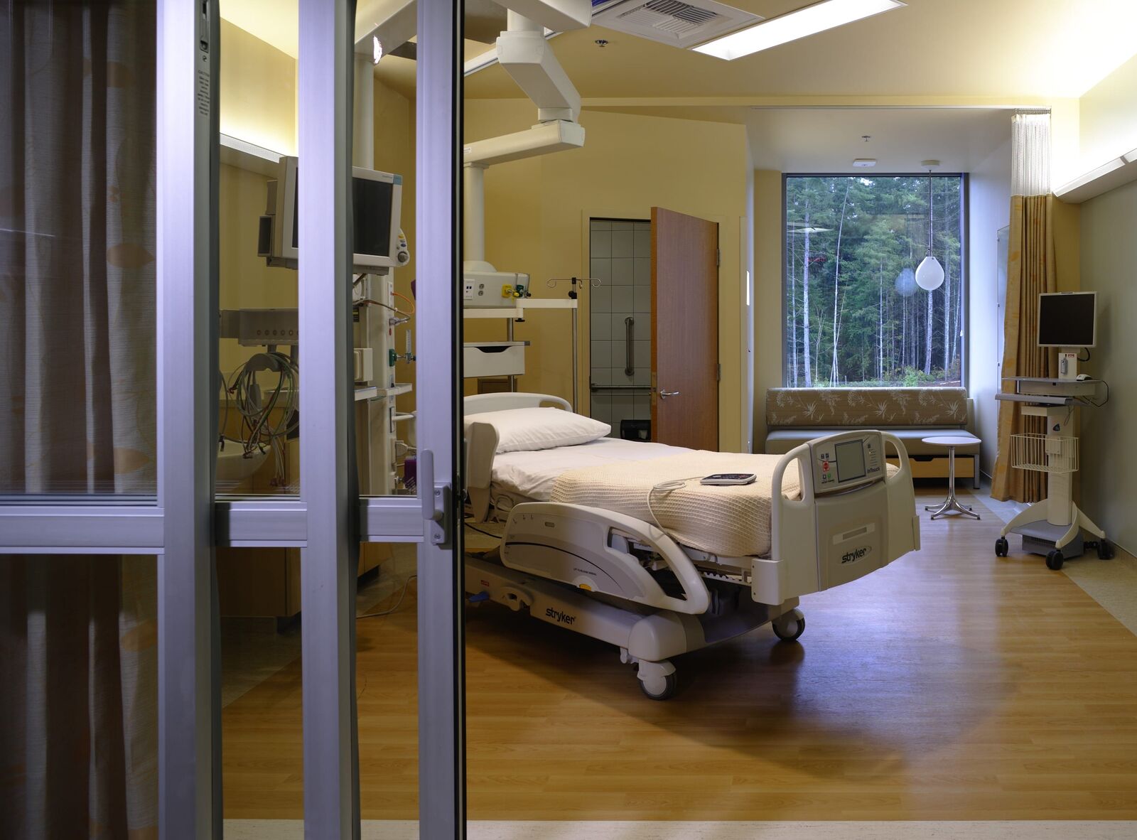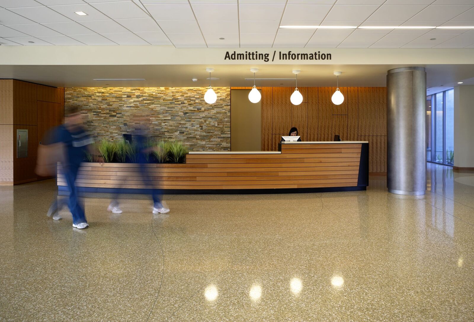 ZGF programmed and designed the 256,000 SF, 80-bed acute-care hospital on a 30-acre site. Through Integrated Design Events with hospital staff and leadership, the project team analyzed areas of waste and implemented a Lean, cross-functional approach to minimize waste and enhance patient-centered care. The process resulted in increased operational efficiency; an example includes a split-flow process for triaging emergency room patients that has reduced the average wait time to approximately 10 minutes. The hospital includes a 24-hour emergency department; medical, surgical, and critical care units; inpatient and outpatient surgery; a heart catheterization laboratory; diagnostic services; physical, occupational, and speech therapies; and a 600 SF chapel. Outside the hospital, walking paths and nature trails throughout the wooded campus adjoin with an existing public pedestrian path and park-and-ride, enabling alternative transportation options for hospital employees, patients, and visitors.