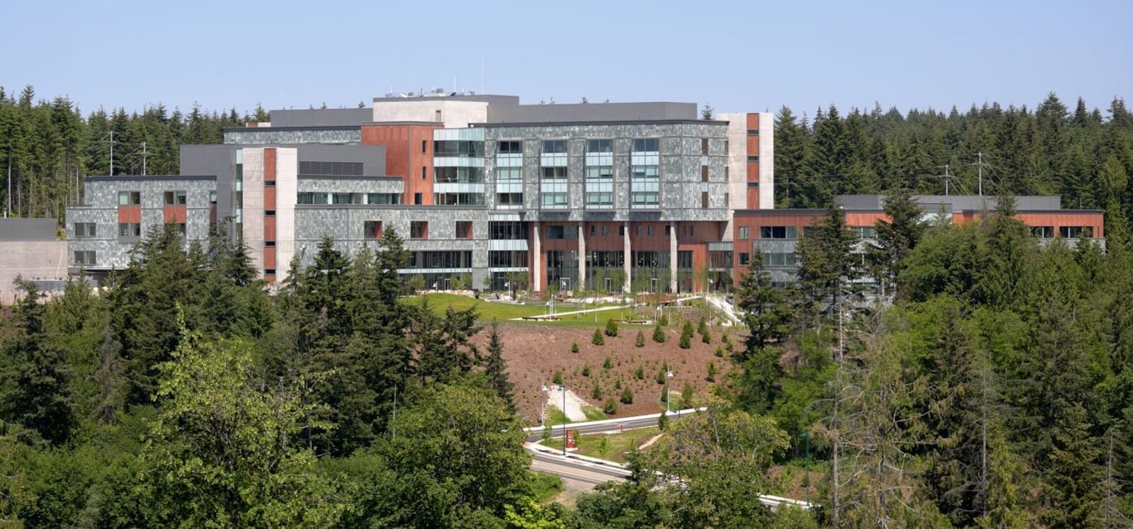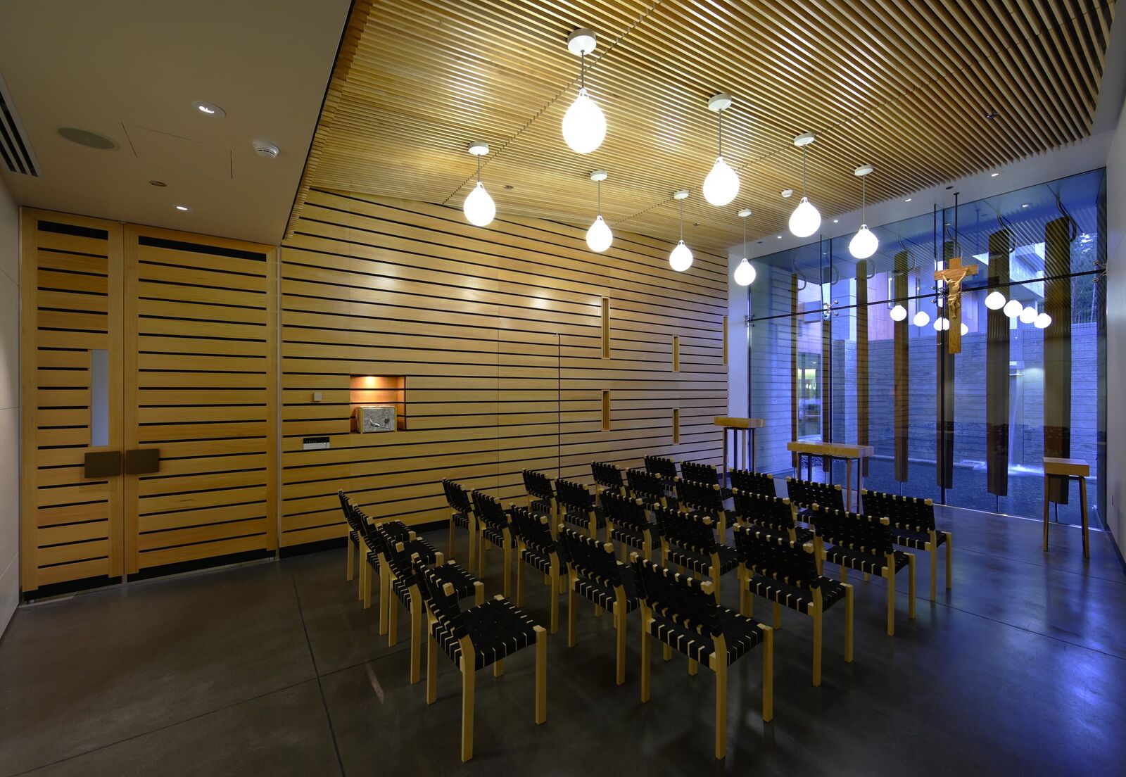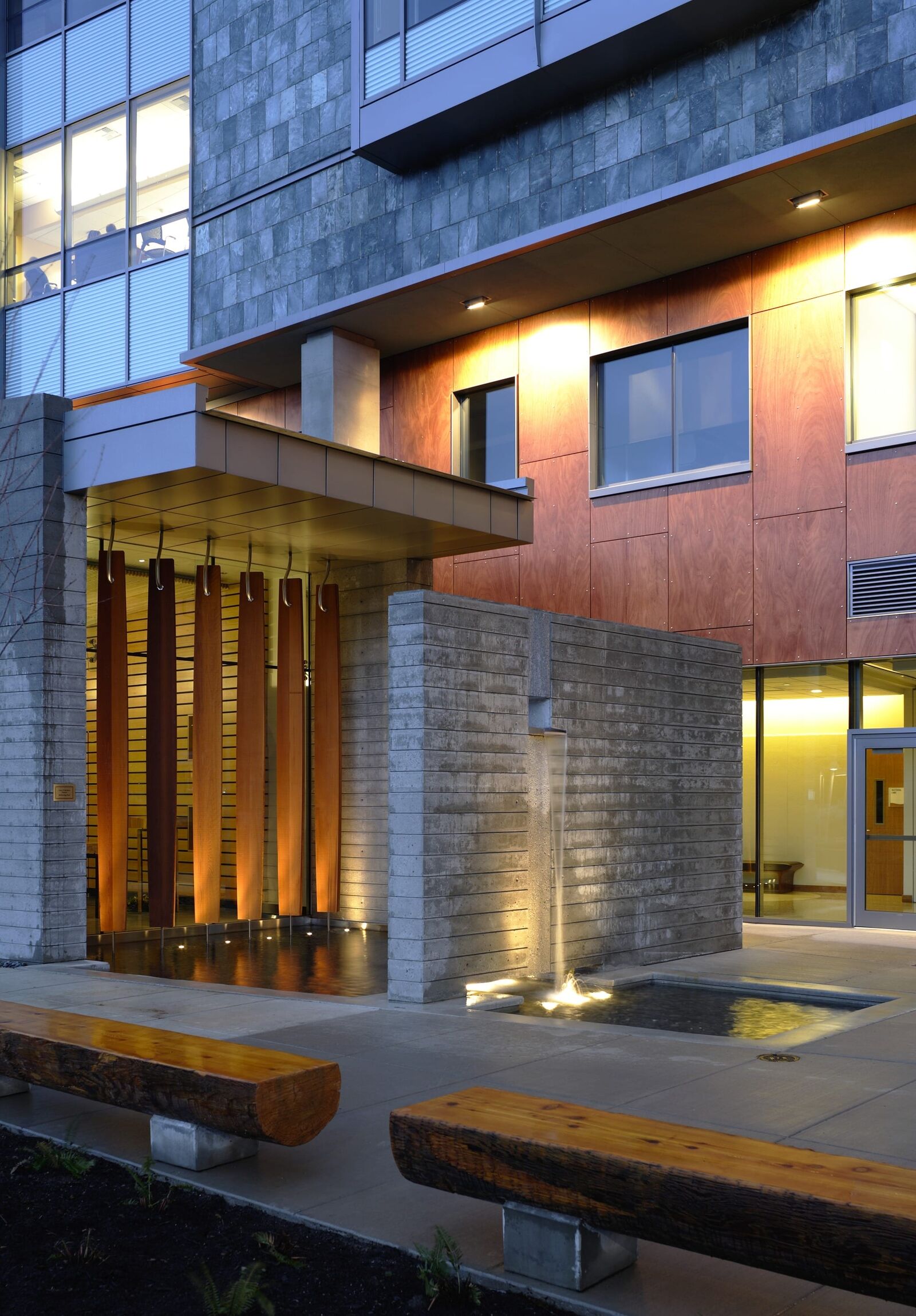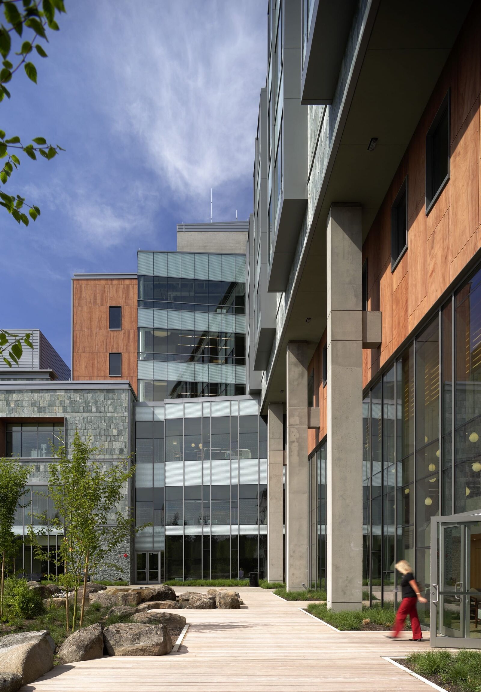 ZGF programmed and designed the 256,000 SF, 80-bed acute-care hospital on a 30-acre site. Through Integrated Design Events with hospital staff and leadership, the project team analyzed areas of waste and implemented a Lean, cross-functional approach to minimize waste and enhance patient-centered care. The process resulted in increased operational efficiency; an example includes a split-flow process for triaging emergency room patients that has reduced the average wait time to approximately 10 minutes. The hospital includes a 24-hour emergency department; medical, surgical, and critical care units; inpatient and outpatient surgery; a heart catheterization laboratory; diagnostic services; physical, occupational, and speech therapies; and a 600 SF chapel. Outside the hospital, walking paths and nature trails throughout the wooded campus adjoin with an existing public pedestrian path and park-and-ride, enabling alternative transportation options for hospital employees, patients, and visitors.