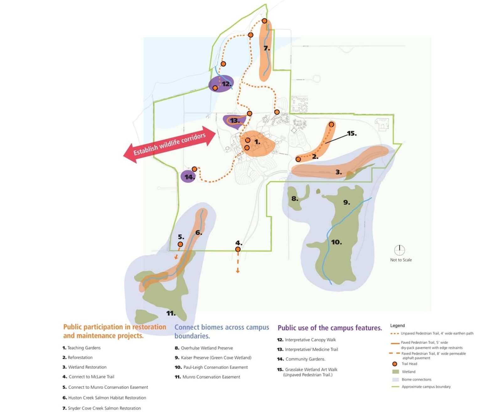 ZGF completed a comprehensive long-term plan for The Evergreen State College to guide development and identify strategies to meet the college’s goal of becoming carbon neutral by 2020. This public liberal arts and sciences college located on 1,000 acres in Olympia is committed to raising ecological consciousness and using the campus as a laboratory for sustainability related to land-use planning, operations, curriculum, and quality of life. The overall objective of the master plan was to translate strategic goals into a physical plan that identified where the College should be focusing its resources to meet future demands on its facilities and land resources. At the heart of the process was a focus on meeting expressed sustainable design goals, including the incorporation of green commuting, green / alternate energy, increased on-campus population, off-campus learning centers, reuse and recycling, on-site storm and wastewater management, and resource stewardship.
