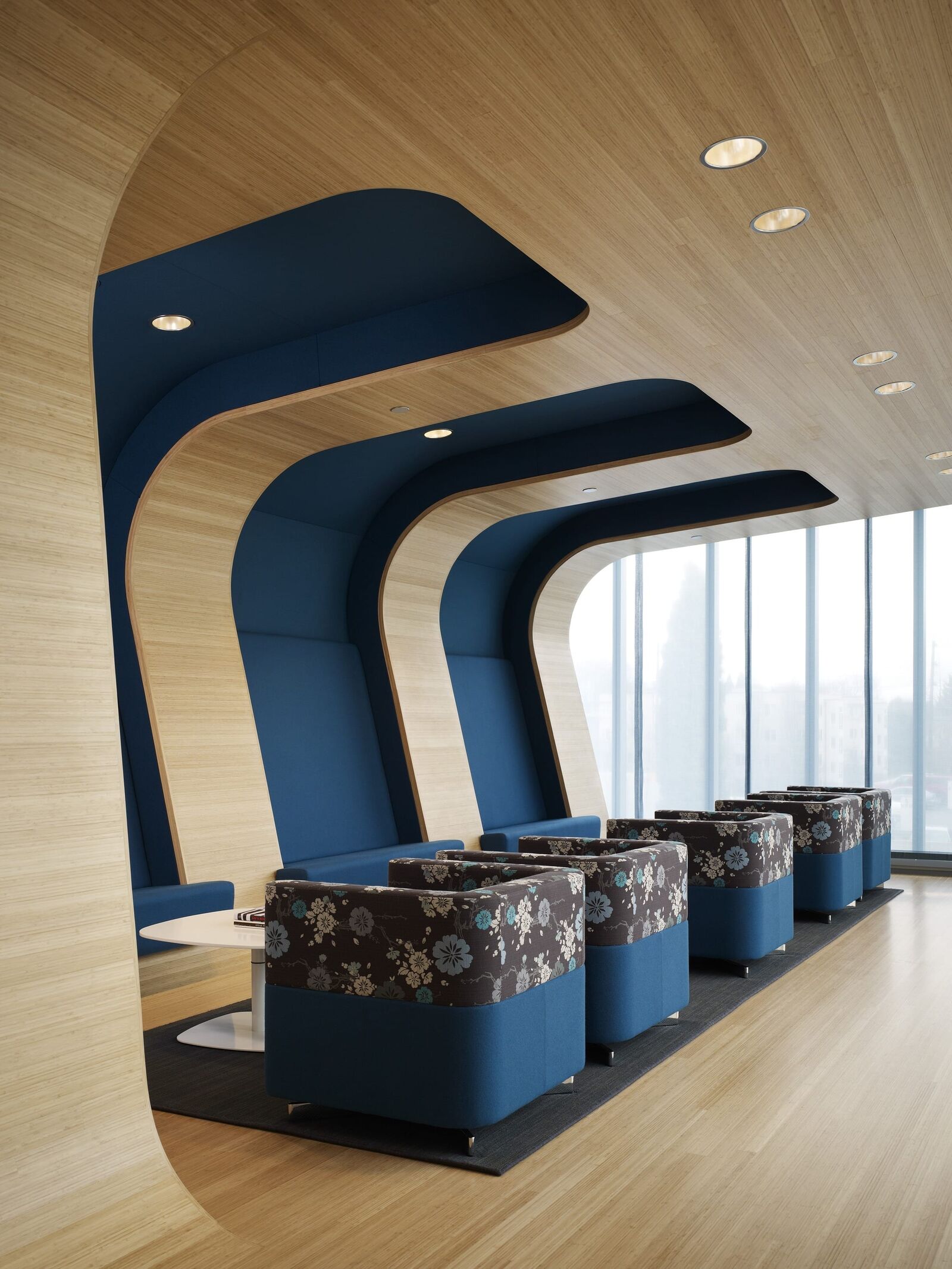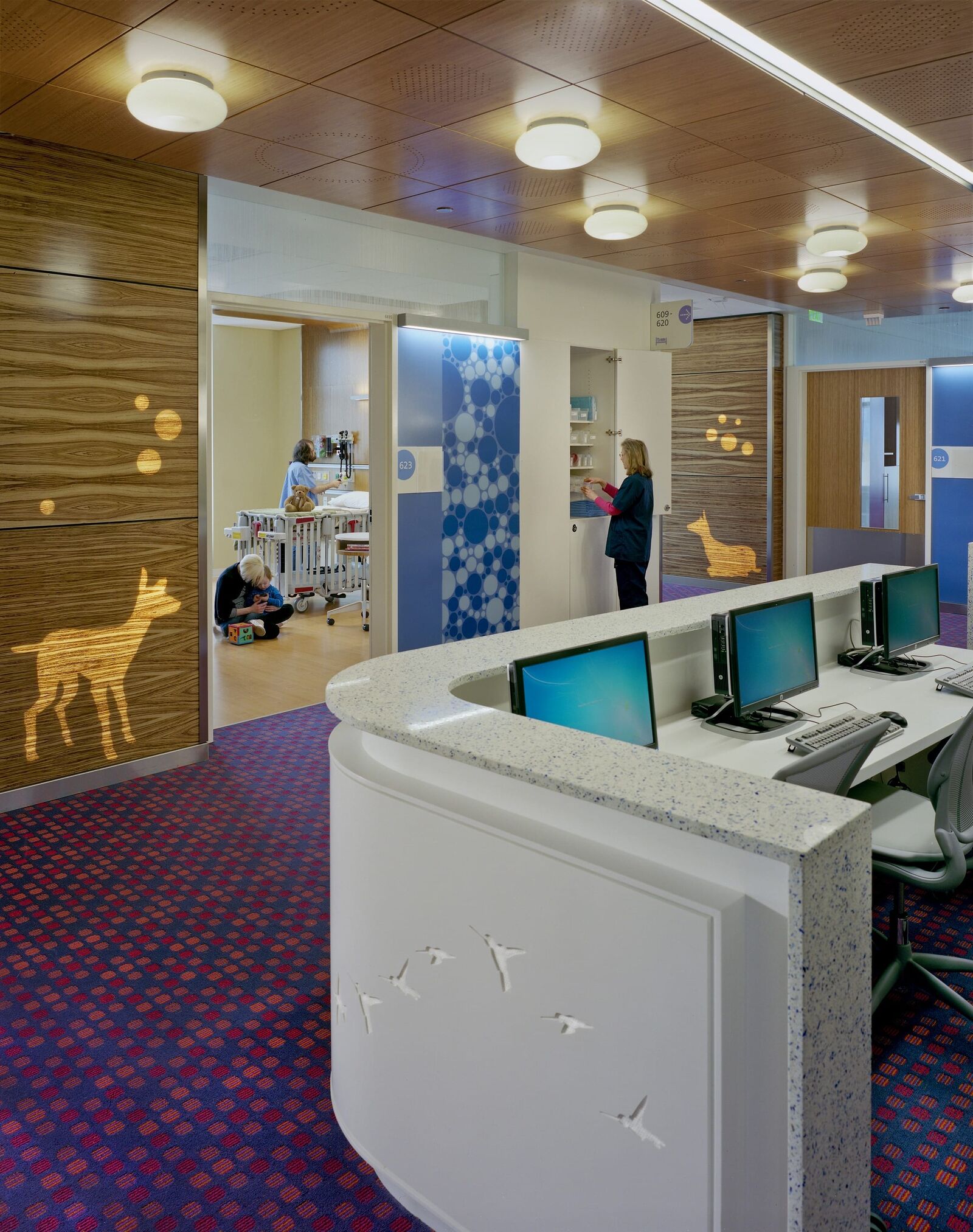 A key design objective was to integrate soft curving forms throughout the interior design of the hospital. The interiors also celebrate four uplifting color palettes and animal motifs representing the geographic regions served by the hospital: the Willamette Valley, the Cascade Mountain Range, the Oregon Coast, and the desert. Commissioned art, environmental graphics, and art created by patients are also integrated throughout the hospital to provide positive distractions and enliven spaces.