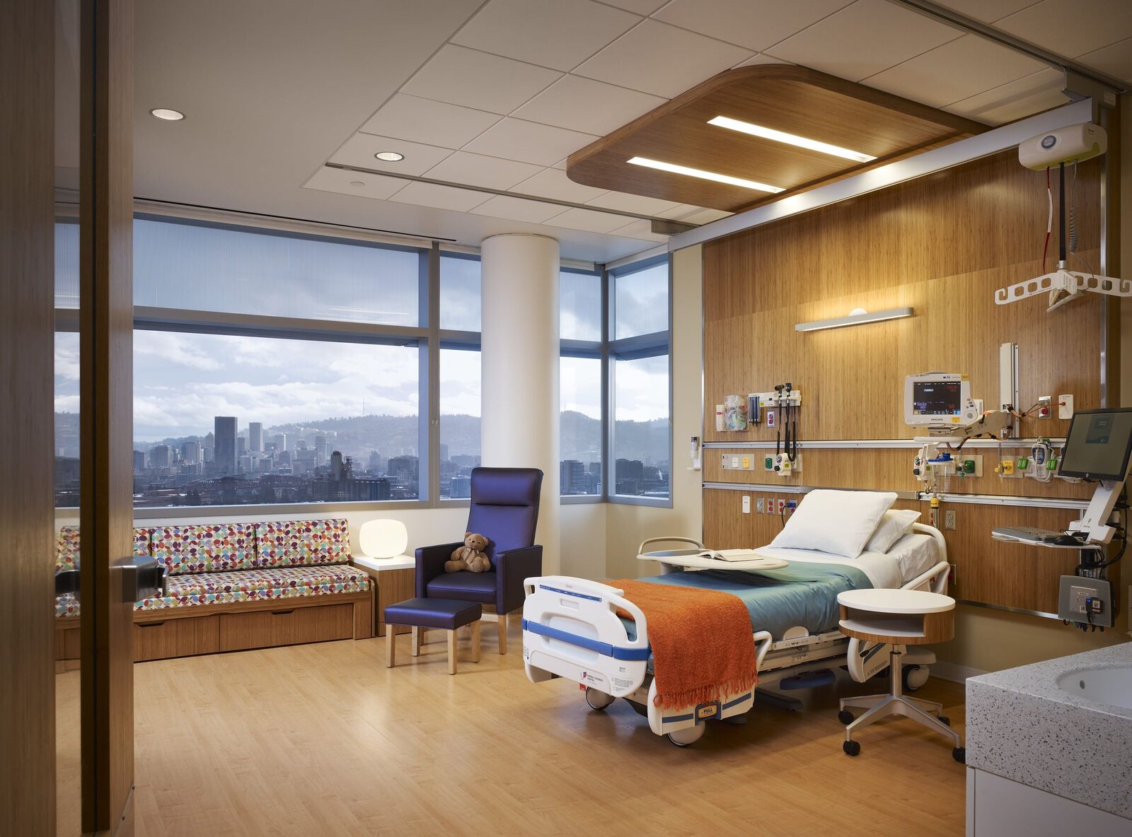 The nine-story Randall Children’s Hospital, designed by ZGF, consolidates pediatric services in a family-centered care environment and creates a new identity for the children’s hospital, as well as a new front door to the Legacy Emanuel Medical Center campus. This facility houses 165 inpatient beds in single rooms for acute care, neonatal intensive care, and pediatric intensive care. It also includes a new pediatric emergency department, a short-stay unit, the Children’s Cancer and Blood Disorder Unit, a pharmacy, and a rehabilitation gym.