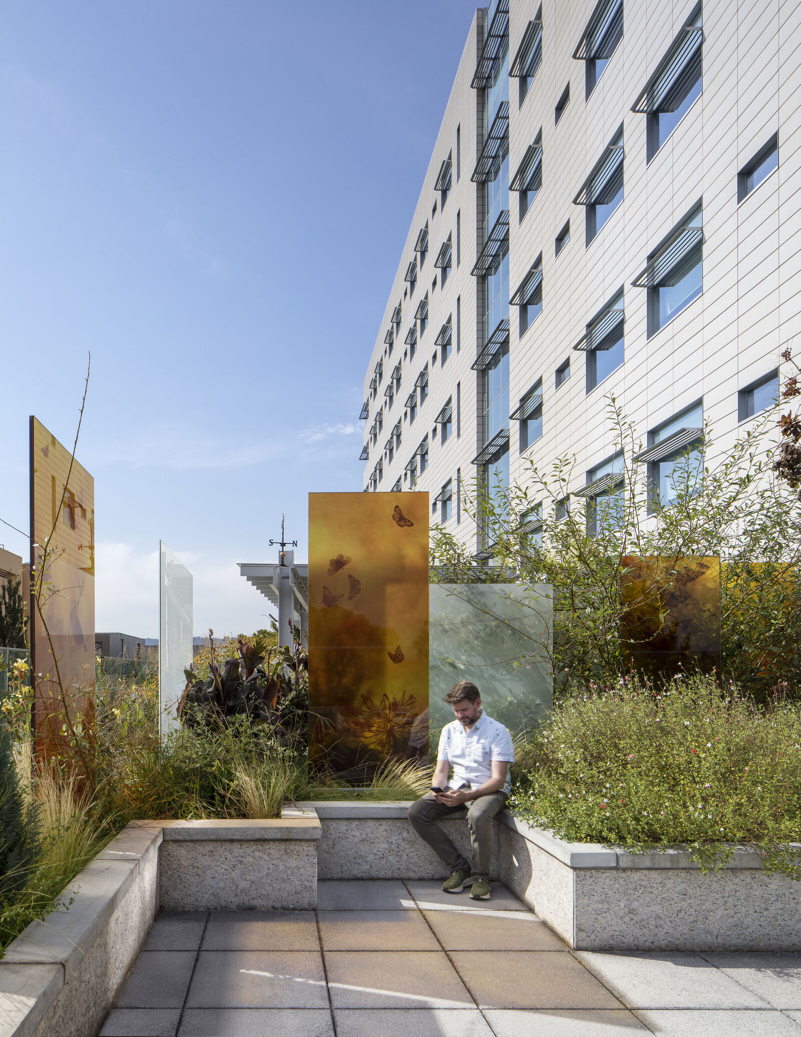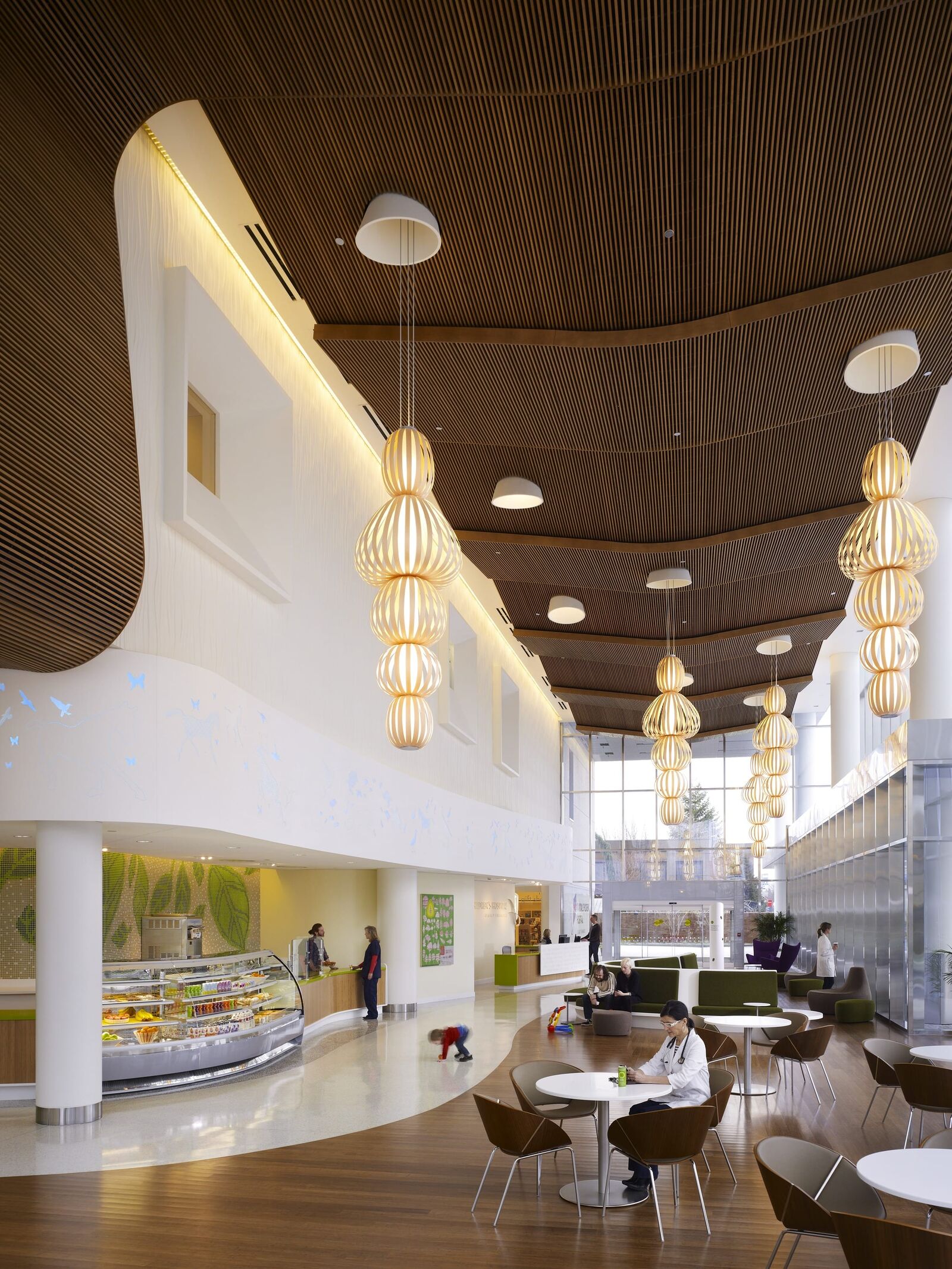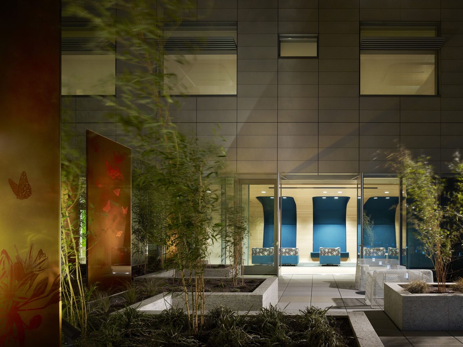 A new garden off the first floor lobby adds an open space to the garden culture well-established on the campus. A terrace garden on the third floor is designed to provide a variety of environments, including areas for play, conversation, and contemplation. The hospital features a number of amenity spaces for patients, families, and staff, including two-story family lounges, a dedicated art studio and movie theater, a teen center, a workout facility, staff break rooms, and lounges.