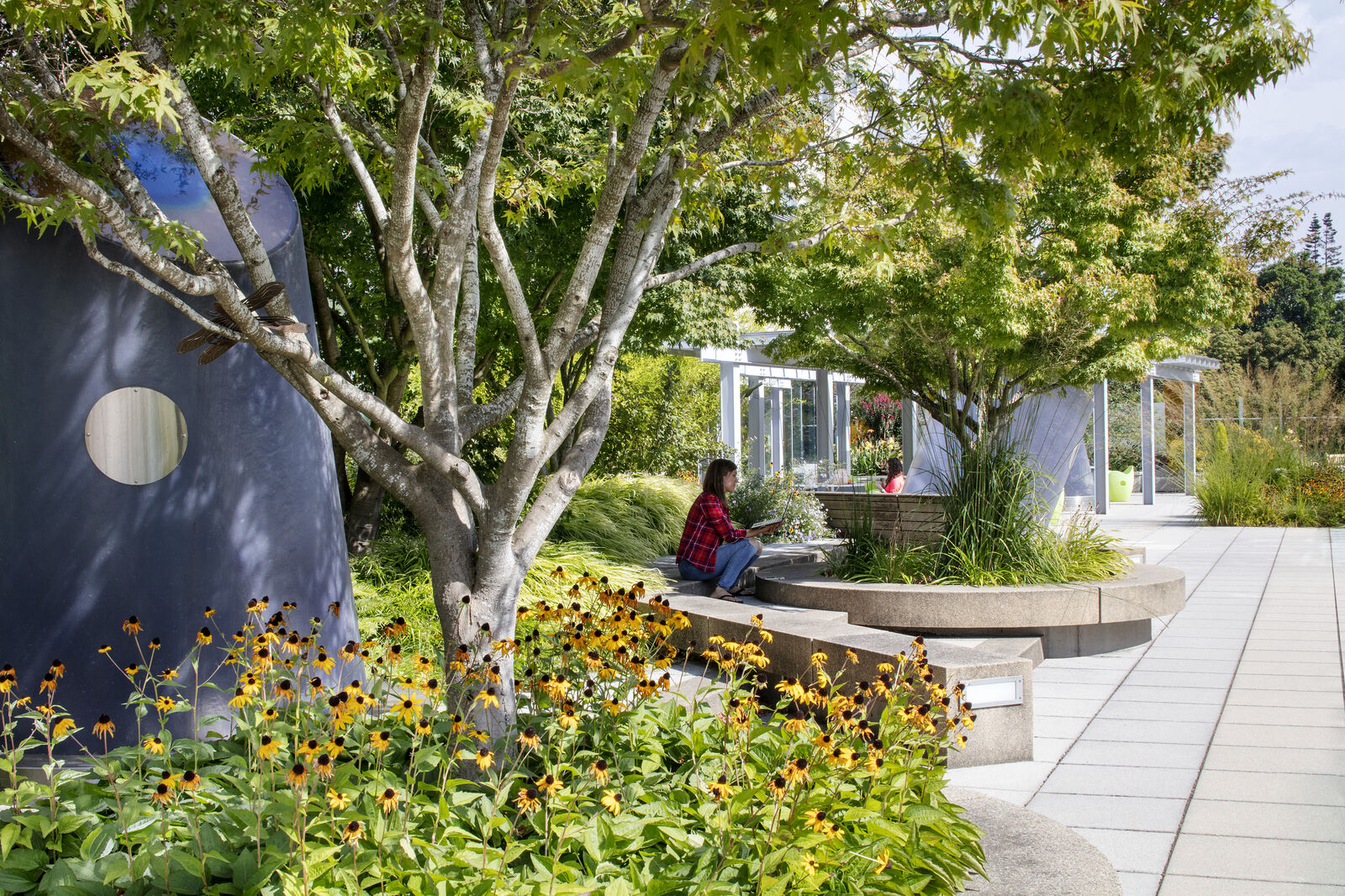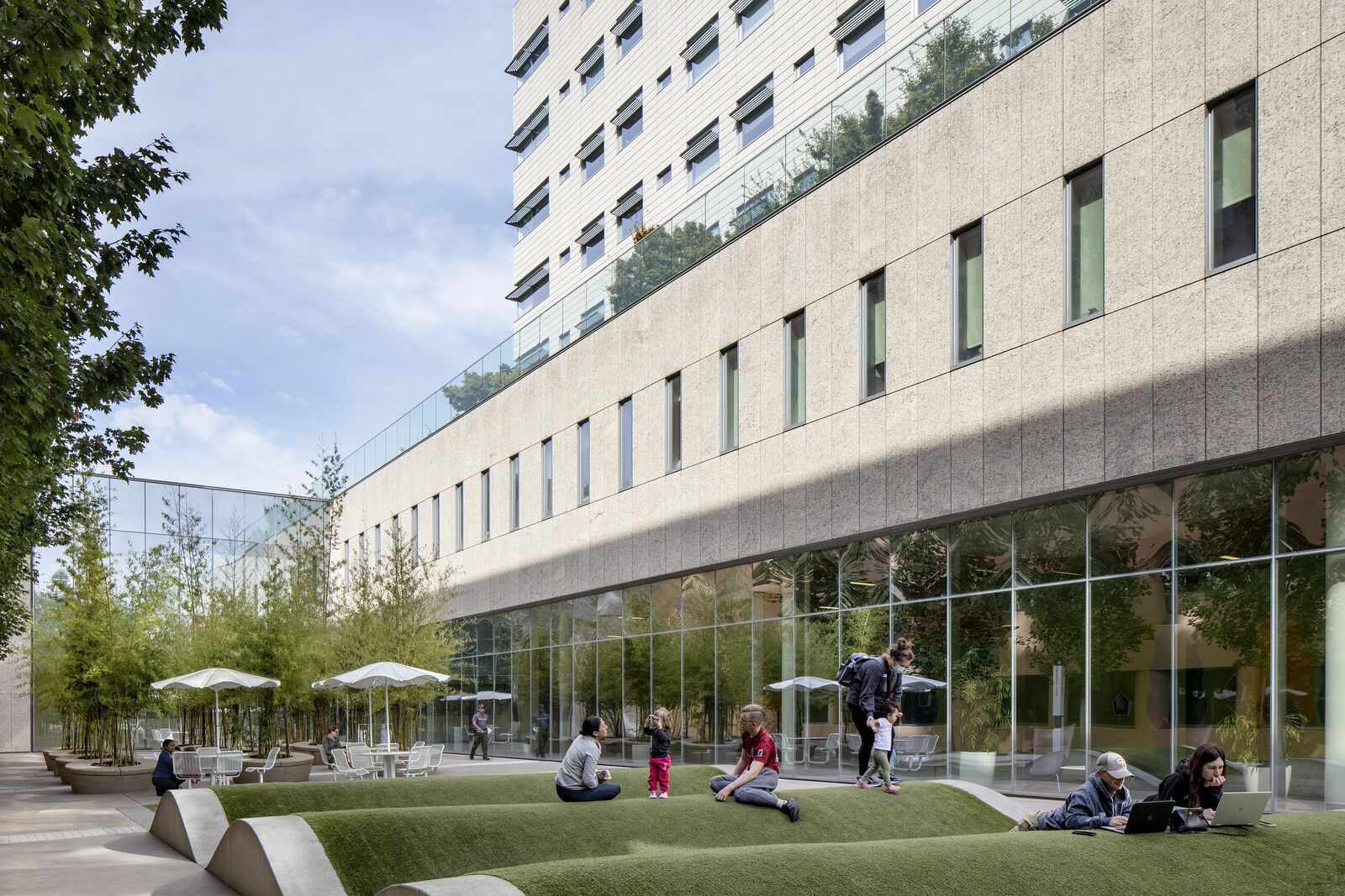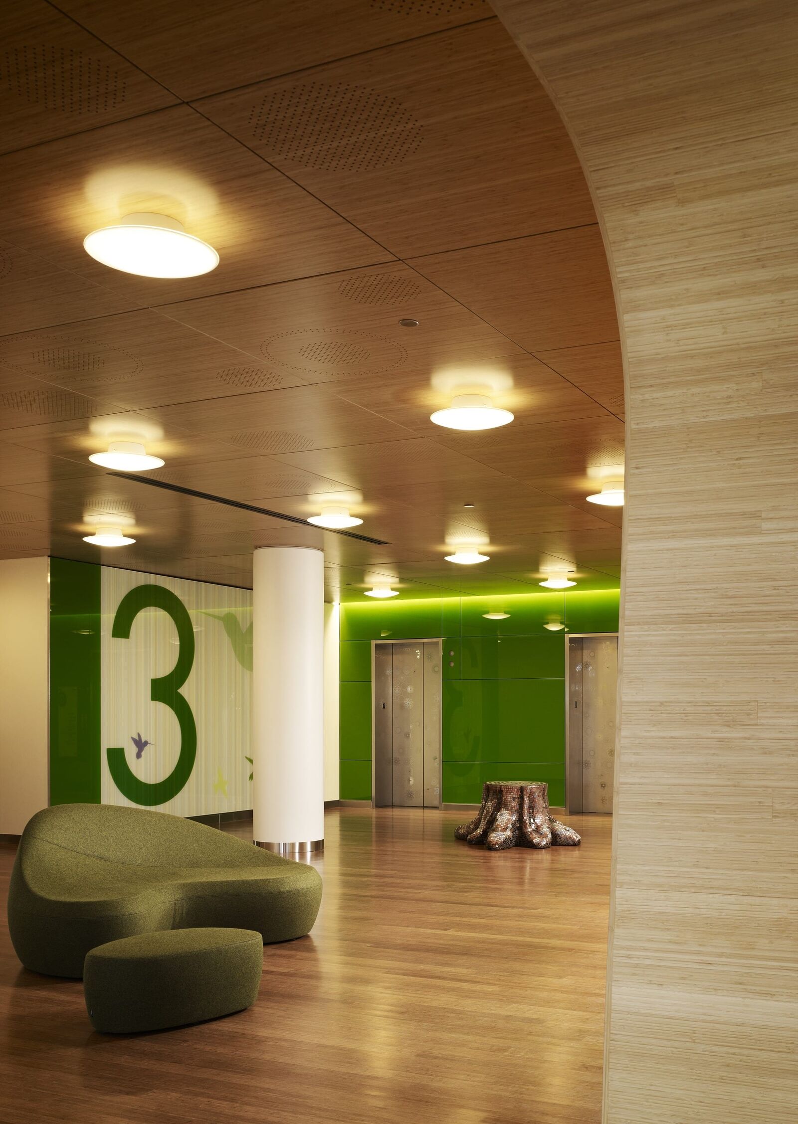 A new garden off the first floor lobby adds an open space to the garden culture well-established on the campus. A terrace garden on the third floor is designed to provide a variety of environments, including areas for play, conversation, and contemplation. The hospital features a number of amenity spaces for patients, families, and staff, including two-story family lounges, a dedicated art studio and movie theater, a teen center, a workout facility, staff break rooms, and lounges.