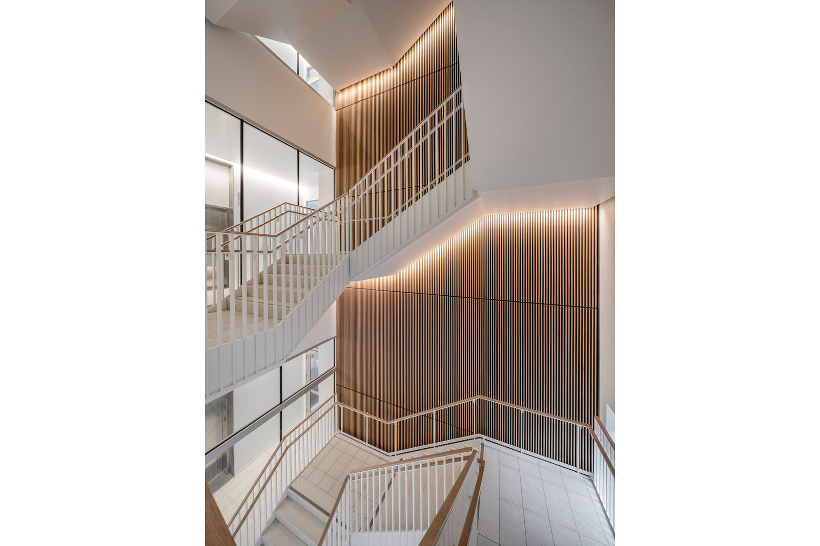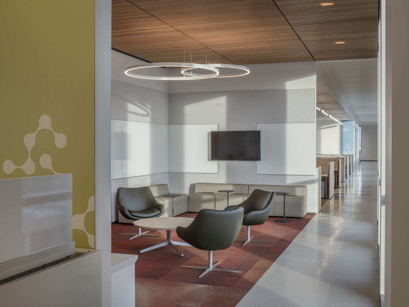 The innovative “arcade” approach on the exterior reflects interior programming. Inside, 27 lab units spread over five levels – four stories above-grade and one full lower level – are organized to enhance connection and circulation. Offices are located around the edges of the building with labs in the center, encouraging collisions and interaction at the heart of the building. Rather than a single central atrium or two isolated collaboration hubs, the building creates a series of nodes distributed across floors with distinct color palettes. The nodes are bookended with lounges and outdoor terraces at the edges of the building. Communicating stairs, transparency via glass that puts science on display, and vertical connections encourages interaction between the floors.