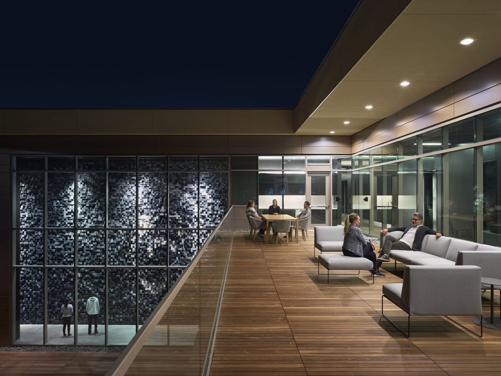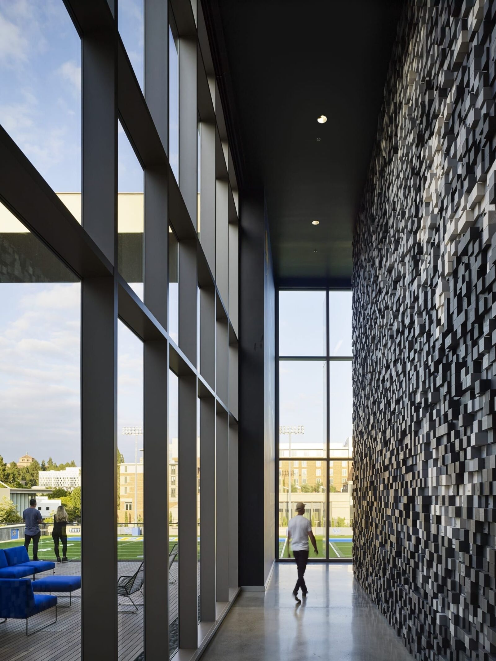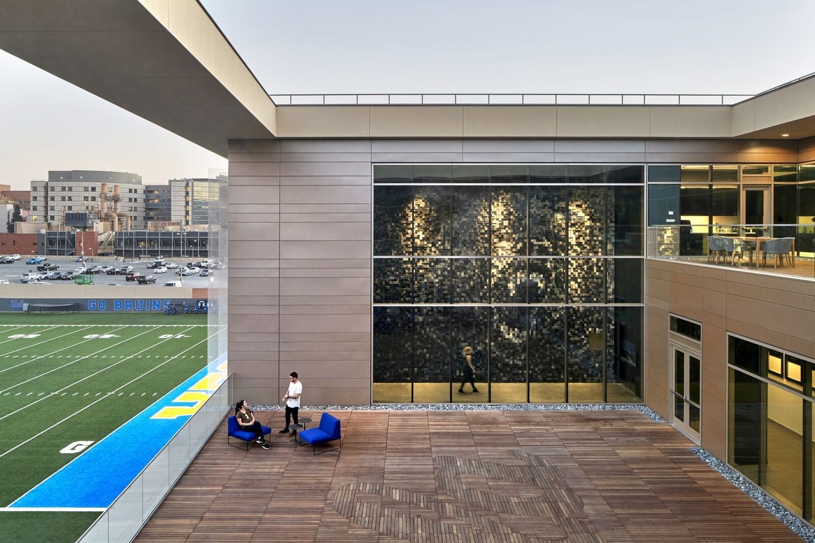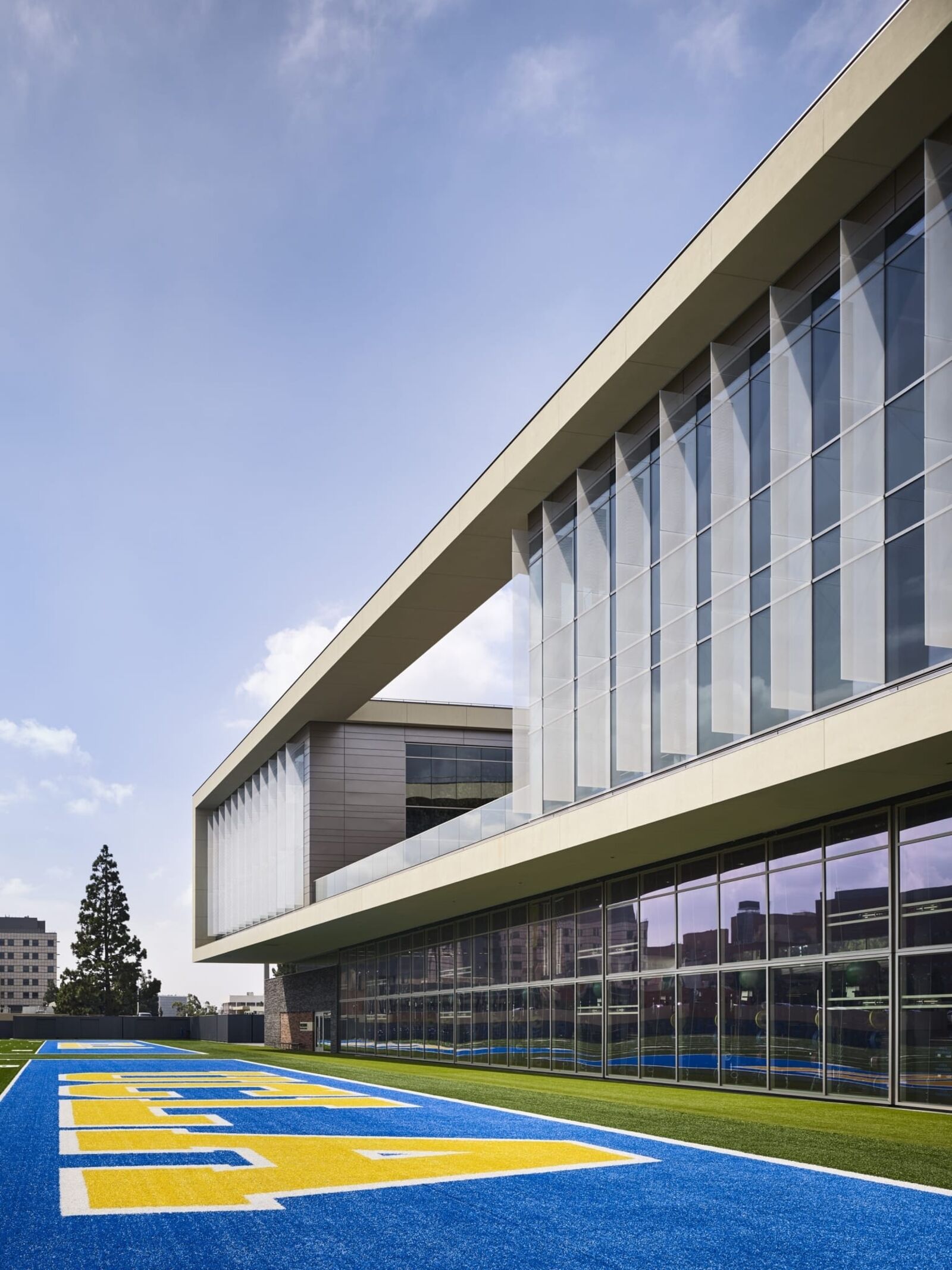 The new football center also offers direct access to Spaulding Field and reinforces the urban fabric of the campus, transforming an existing service area into a new outdoor plaza shared with the existing Los Angeles Tennis Center, Pauley Pavilion, the Acosta Athletic Complex, and the new Mo Ostin Basketball Center.