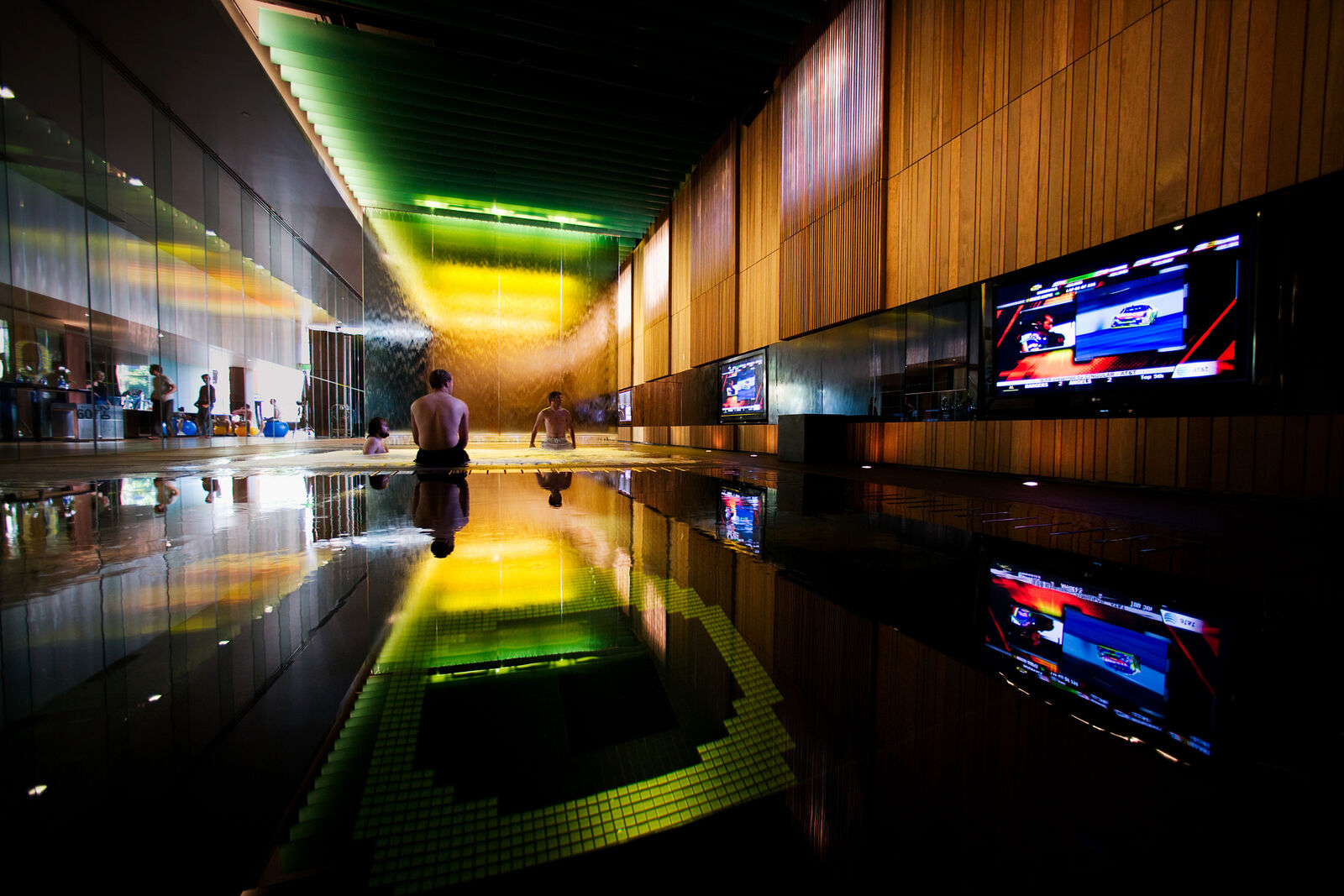 The LEED Platinum® facility incorporates sustainable features, such as exterior solar shades; daylighting; LED lighting with sensors for unoccupied rooms; rooftop solar thermal water heaters to help meet the high demand of hot water for locker room showers; a connection to the campus’s cogeneration plant to supply the building with chilled water and steam for a more efficient / inexpensive supply for mechanical uses; a displacement ventilation system to supply air at low velocity, using less electricity and air pressure to send cooler air to lower levels naturally; and vertical bi-fold doors in the weight room and cardio mezzanine that open to the outside, utilizing fans to push the air inside, providing a more comfortable, air condition-free environment.