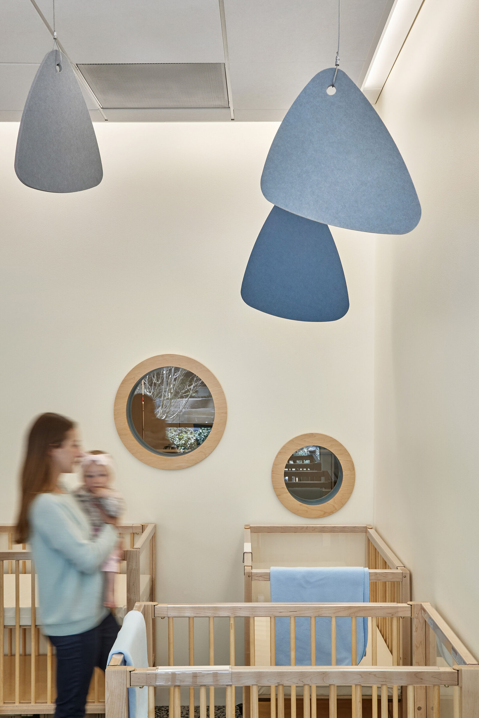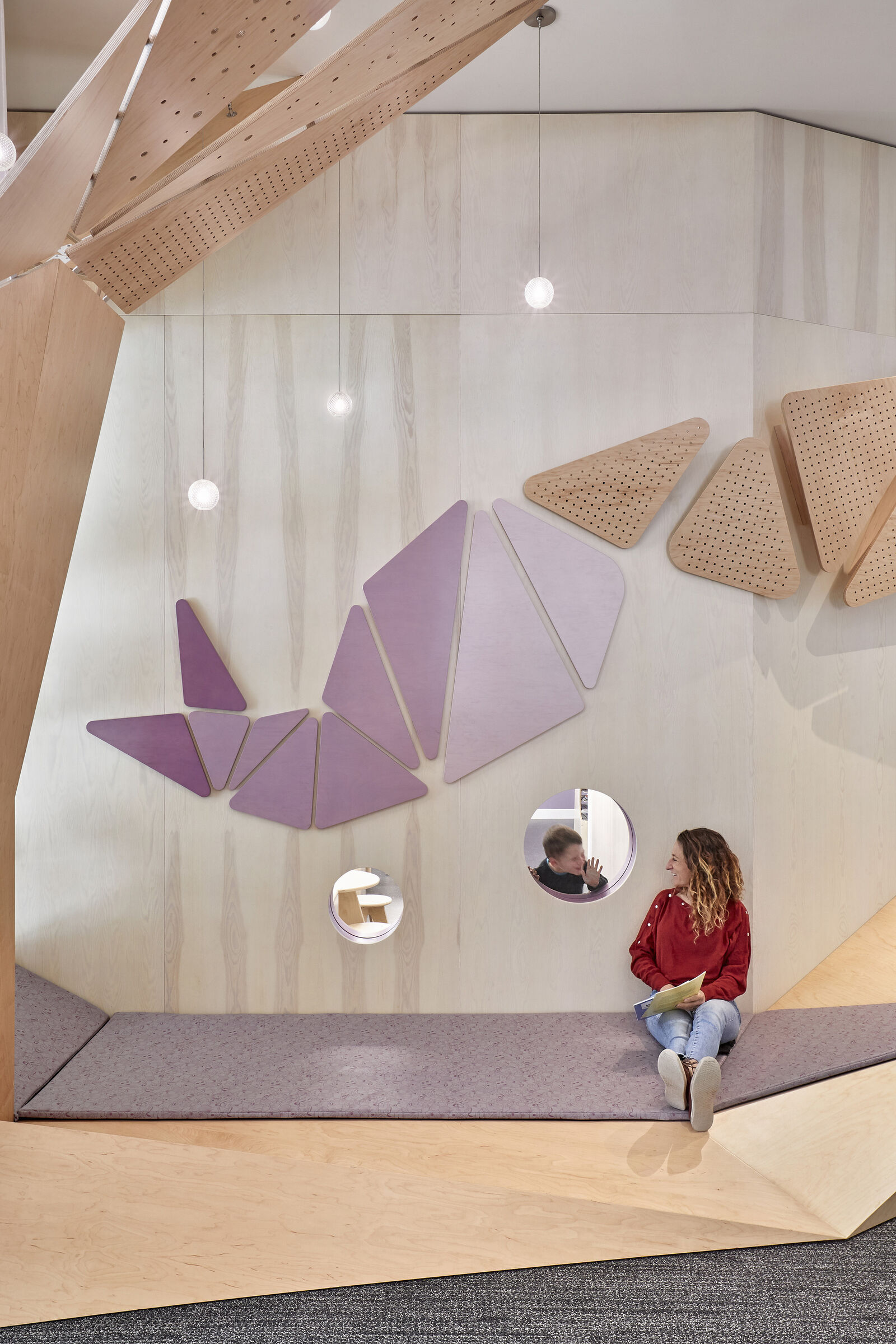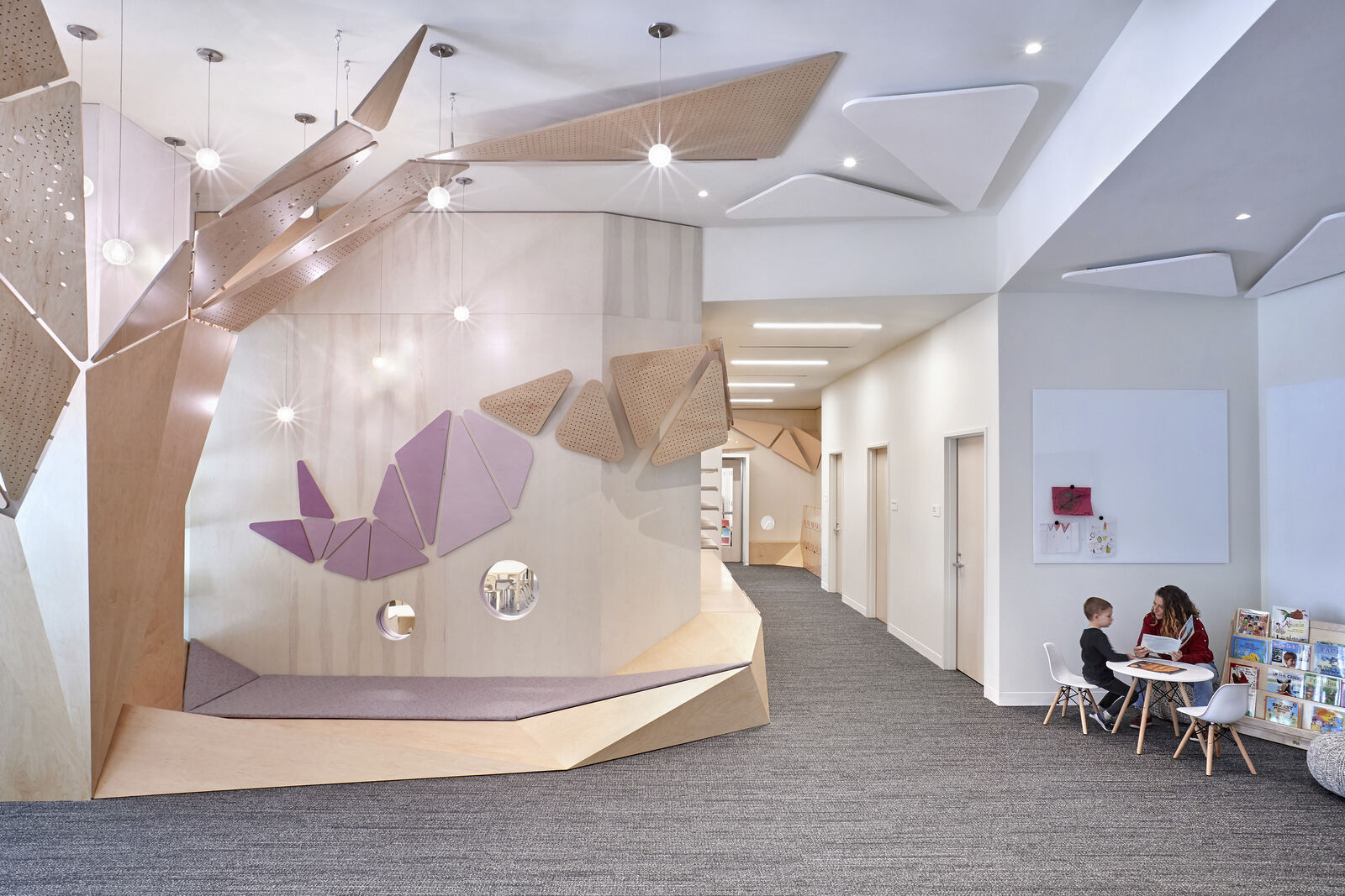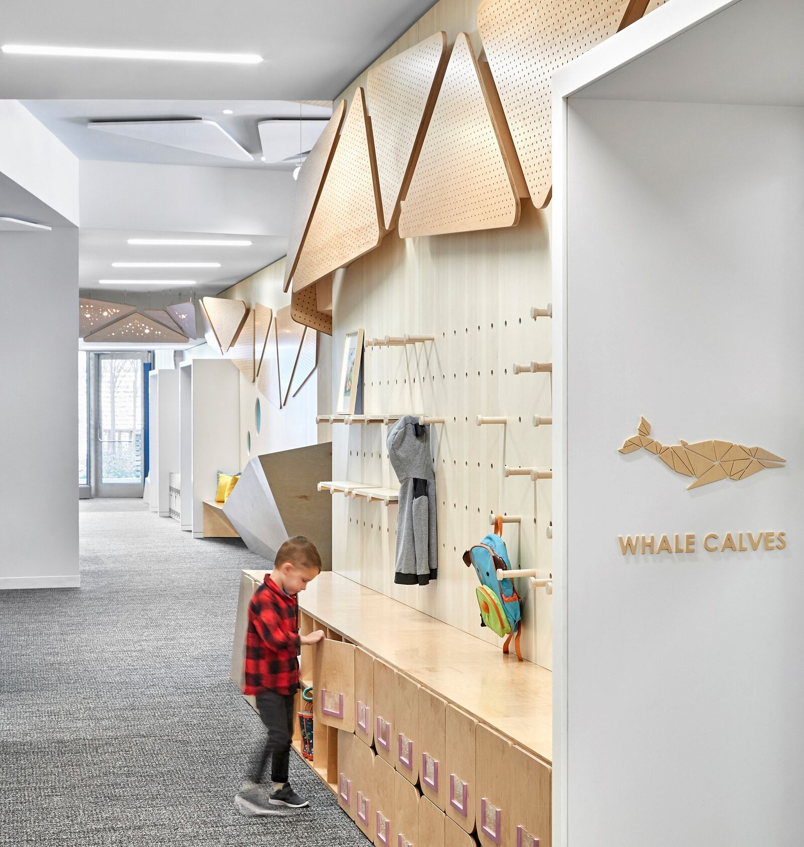 A custom millwork installation in the public entryway addresses multiple needs—providing acoustics, supporting lighting, and supplying additional storage while integrating subtle elements of discovery and play.