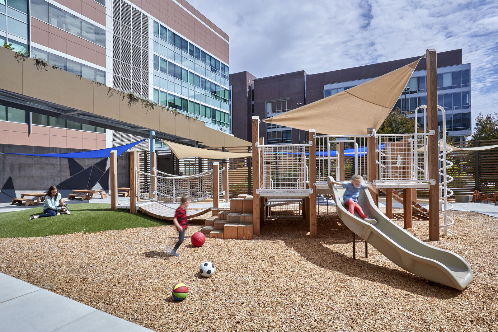 The childcare center’s urban setting also required a new approach to connecting kids and teachers to the outdoors. The 4,300 SF outdoor play area provides separate, age-appropriate play areas for infants and toddlers and evokes the setting of San Francisco’s Wharf and marine architecture. The custom-designed wooden play structure highlights natural materials within a nautical theme.