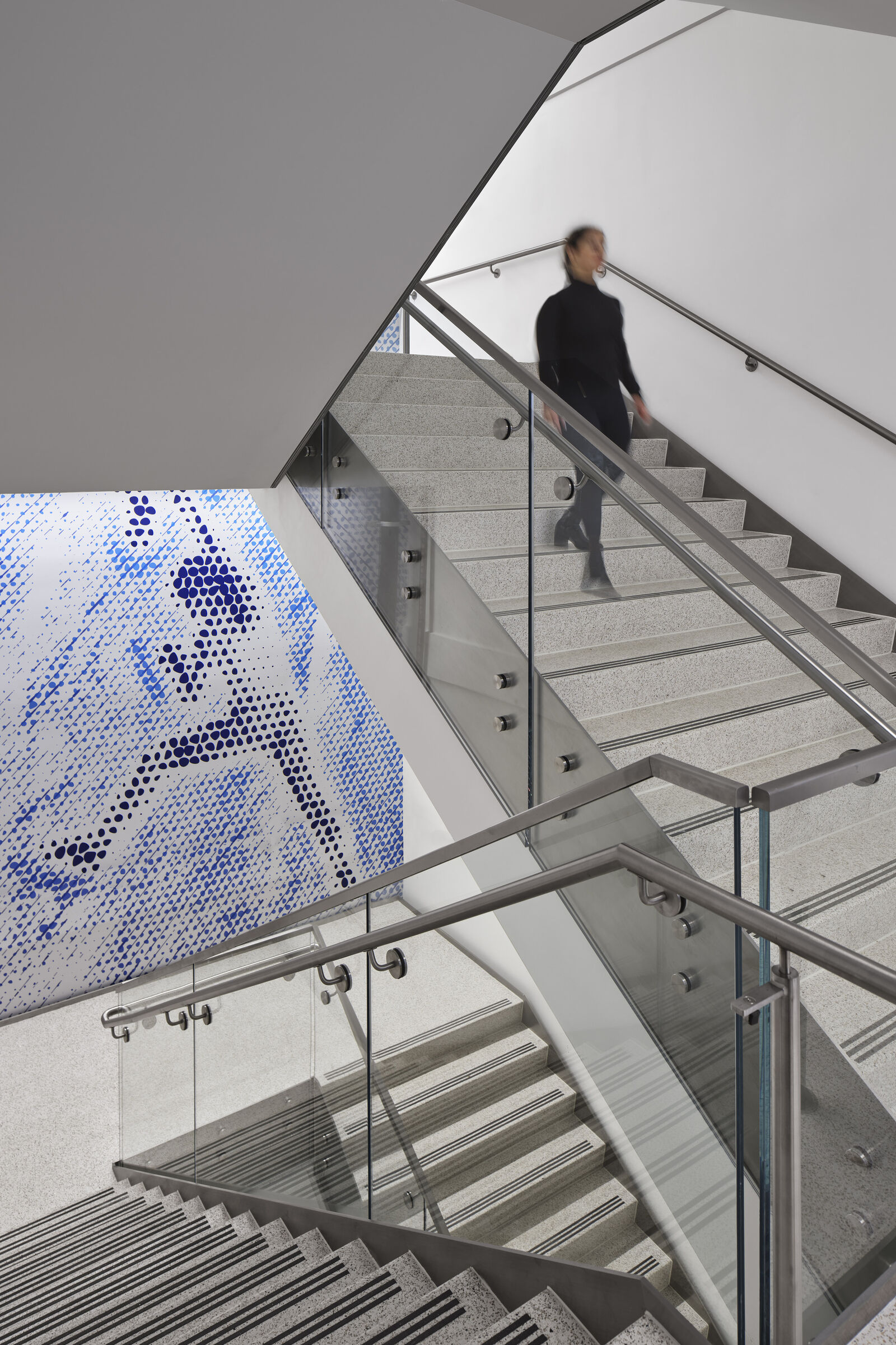 A sense of human movement is imbued throughout the design, with glass panels blurring movement, light fixtures mimicking body lines, and graphics portraying abstracted human forms.