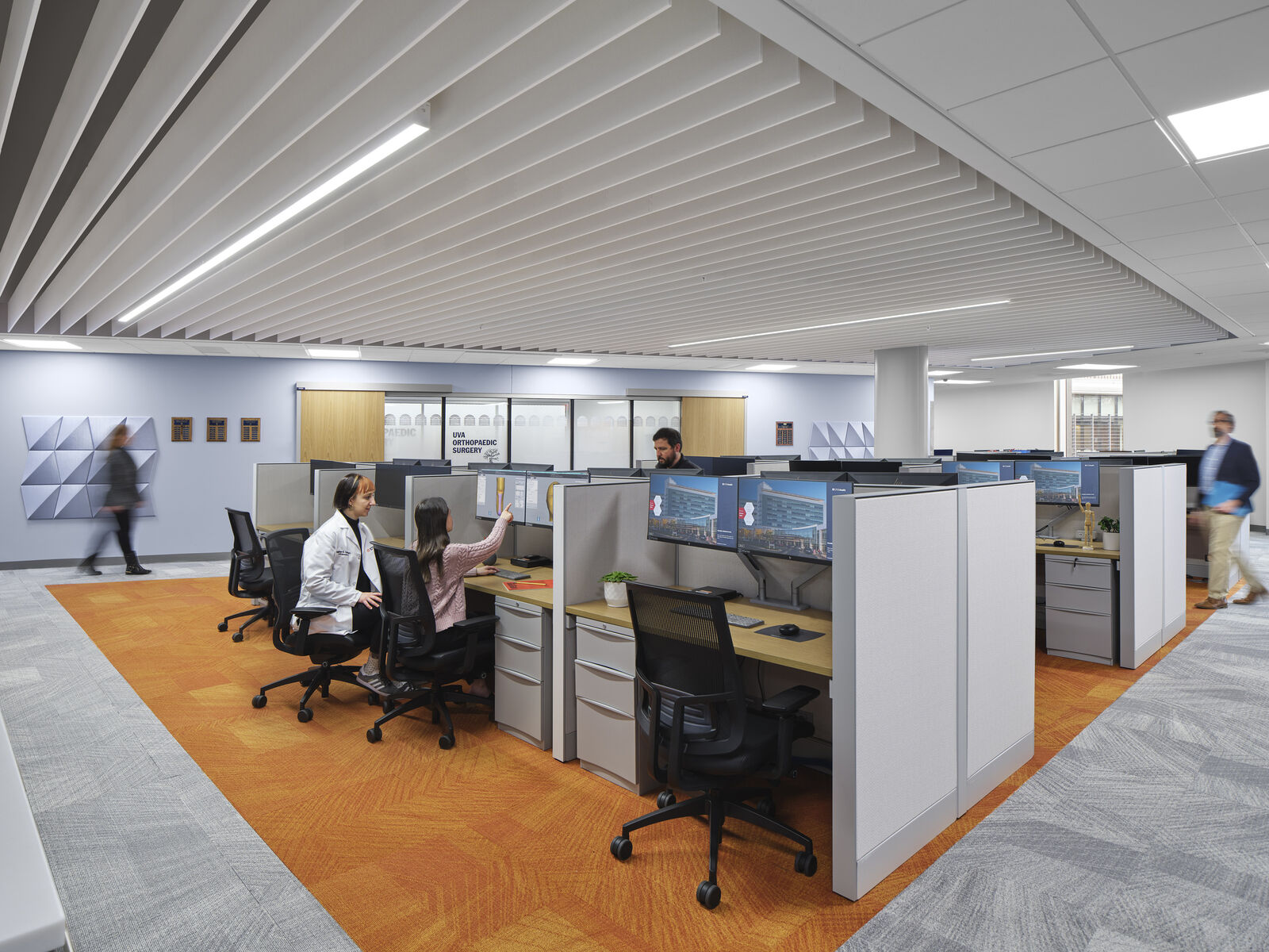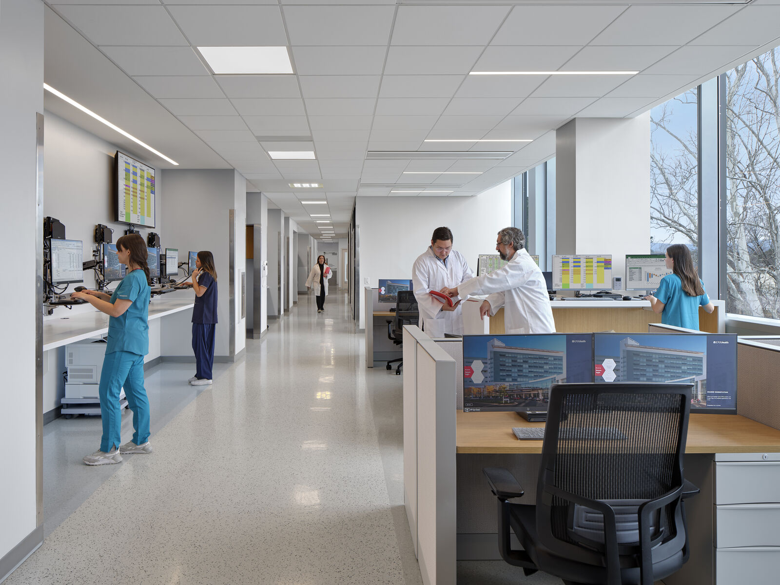 Located along the building perimeter, provider workstations support collaboration among care teams, provide easy access to exam rooms, and are naturally daylit with views to nature.