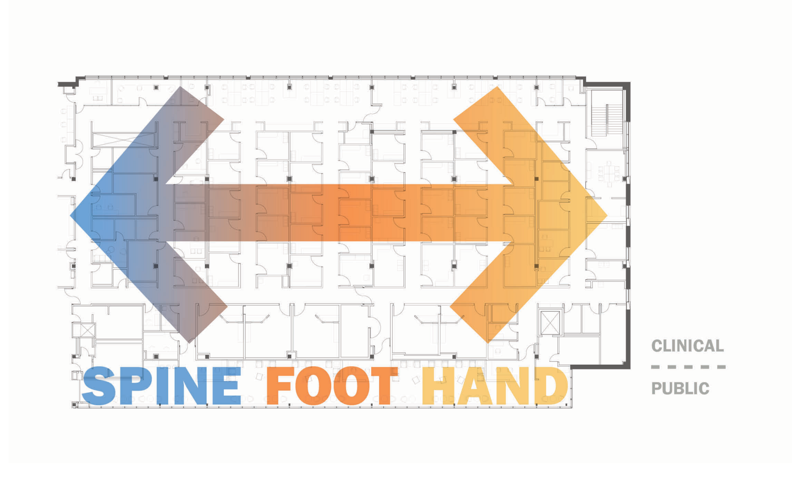 While each specialty clinic is distinctly branded within waiting areas, exam rooms are flexible to optimize the efficient sharing of space based on day of the week and patient volume.