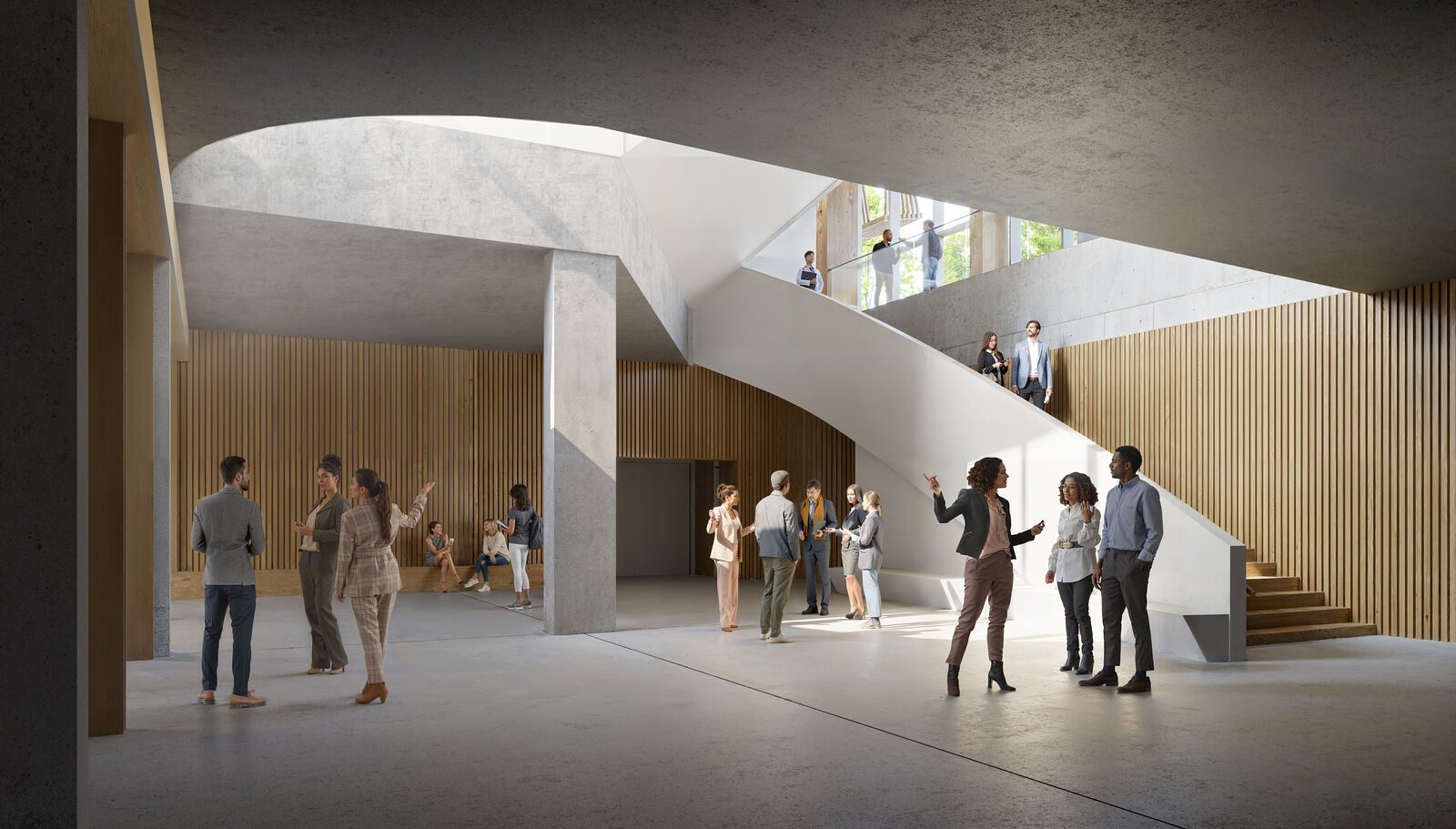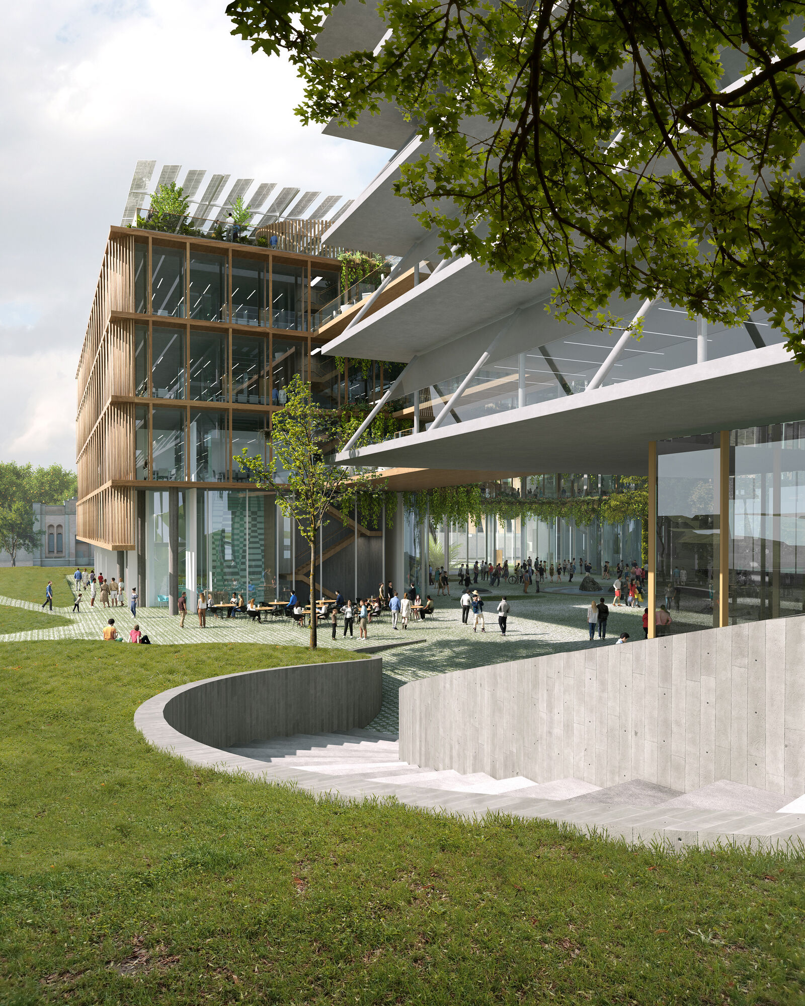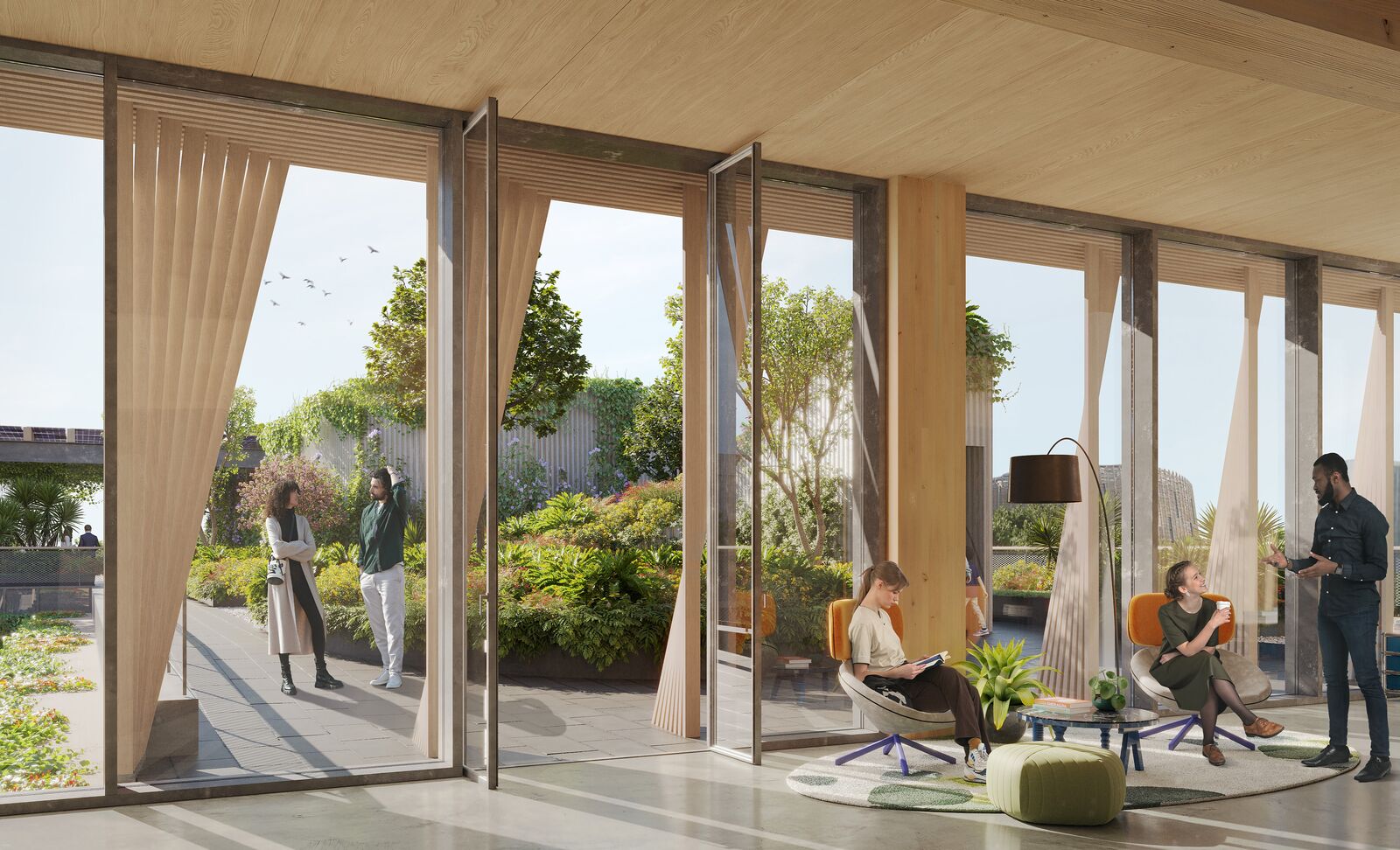 The high-performance mass timber building envelope and mechanical systems will significantly reduce both embodied and operational carbon. This reduces the amount of ventilation air required, and therefore energy demand, by over 60%. Temperature and ventilation will be controlled by MEP systems that utilize 100% outside air and hydronic heating and cooling. The building envelope also features operable windows in collaboration and office areas to provide natural ventilation. The exterior sunshades blunt the intensity of the Mediterranean sun while simultaneously harvesting daylight deep into the building. Inside the labs, zoned climate controls and chilled beams reduce energy loads while ensuring that research teams will conduct their work in comfort.