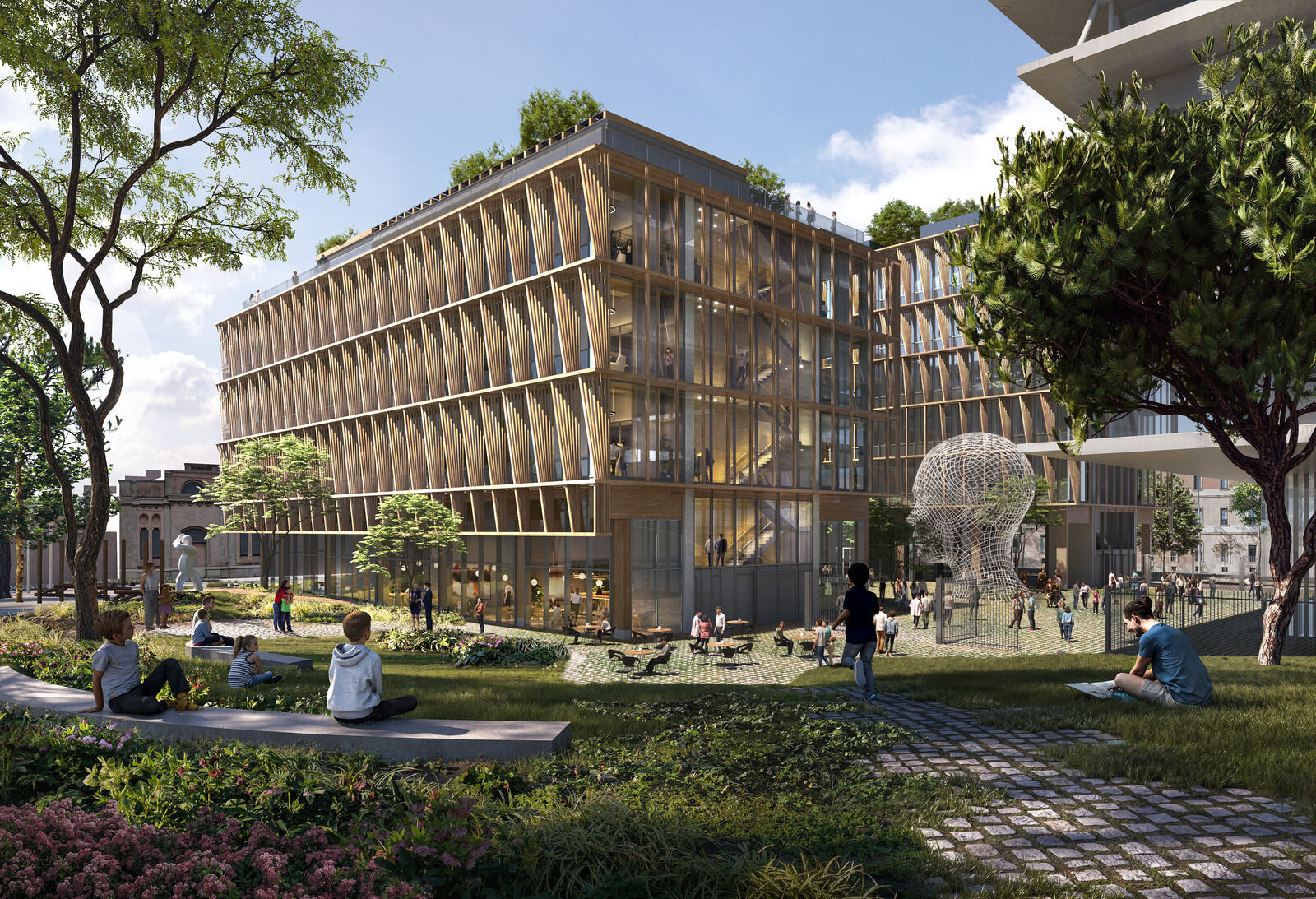 The Mercat del Peix Research Center in Barcelona comprises two connecting net-positive buildings, consolidating the research on evolution and biodiversity of the Institut de Biologia Evolutiva (IBE) in one building; and the Center for Research and Innovation in Planetary Wellbeing for the Universitat Pompeu Fabra (UPF) in the other. These two buildings join a third structure, the Barcelona Institute of Science & Technology (BIST) atop a subterranean parking podium, which also includes a 500-seat multipurpose conference center operated by the city; core labs, freezer farm, and support spaces for IBE; and space owned by Barcelona’s bicycle delivery service.