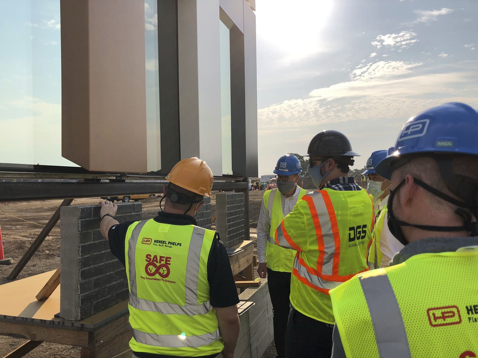 During the spring of 2020, the Design-Build team and representatives from the Department of General Services gathered outdoors and clad in PPE to collaborate on designing the curtain wall system.