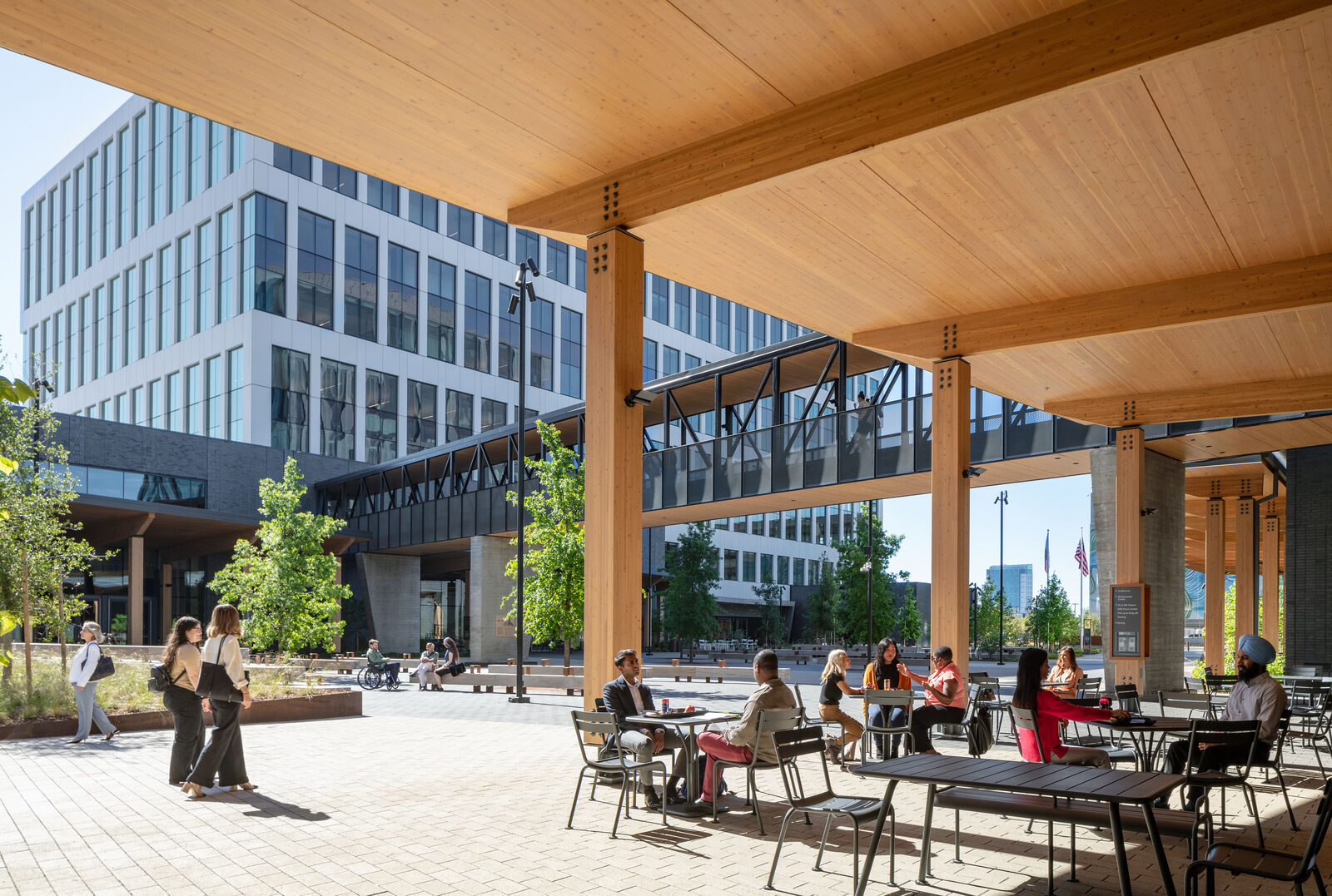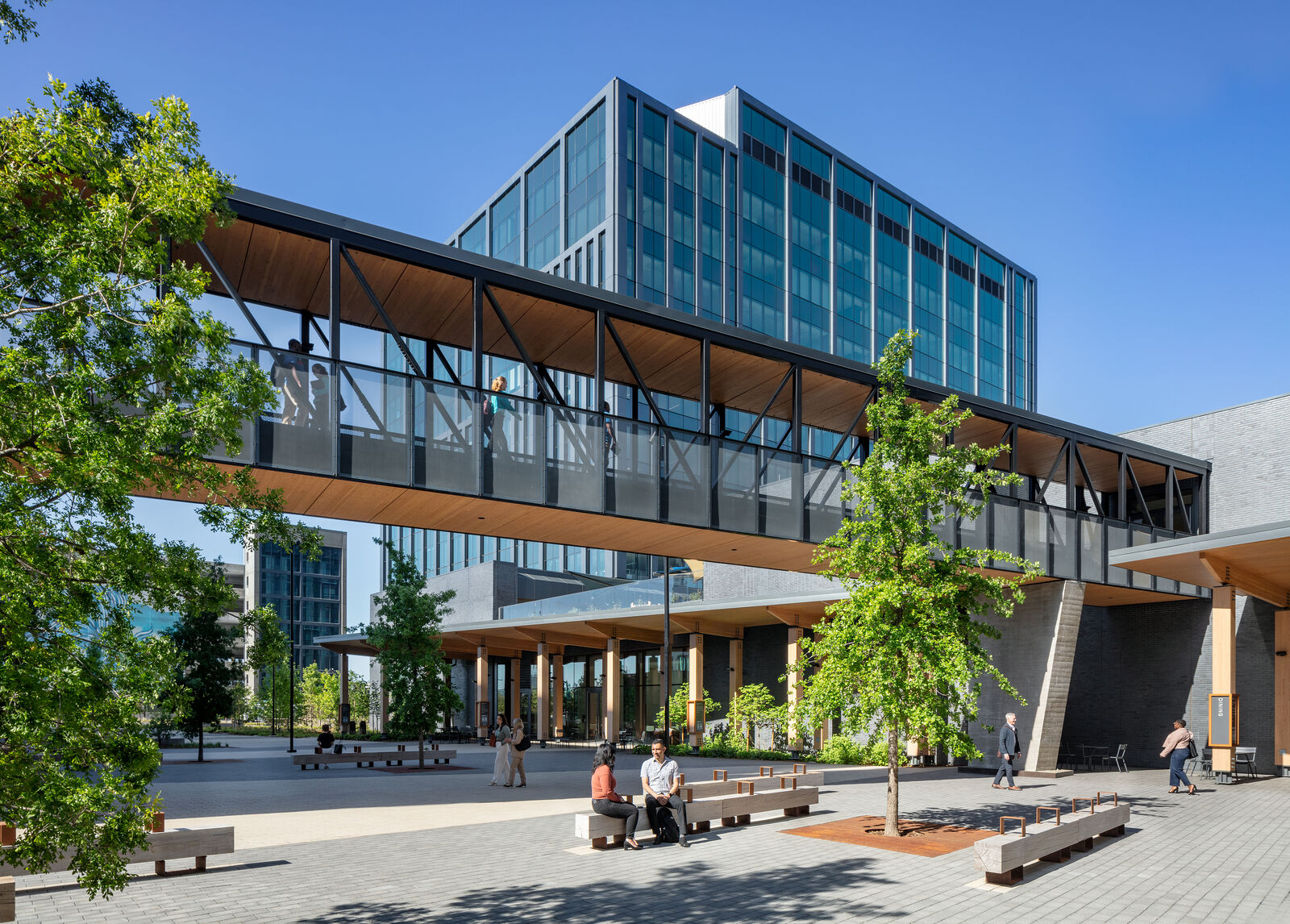 A three-story walkway links the northwest and northeast buildings. Its architectural identity is inspired by the connecting buildings to form a distinct, yet complementary character. The northwest tower lends its color and architectural language characterized by staggered metal panels and glazing, but its scale is refined to draw visual contrast. With the color of the northeast tower visible from the interior, the walkway blends with the neighboring structures while having a unique identity that celebrates the campus’s connectivity. Likewise, the southwest and southeast buildings are linked by a second level covered walkway across Town Square to provide a weather-protected passageway between the east and west program.