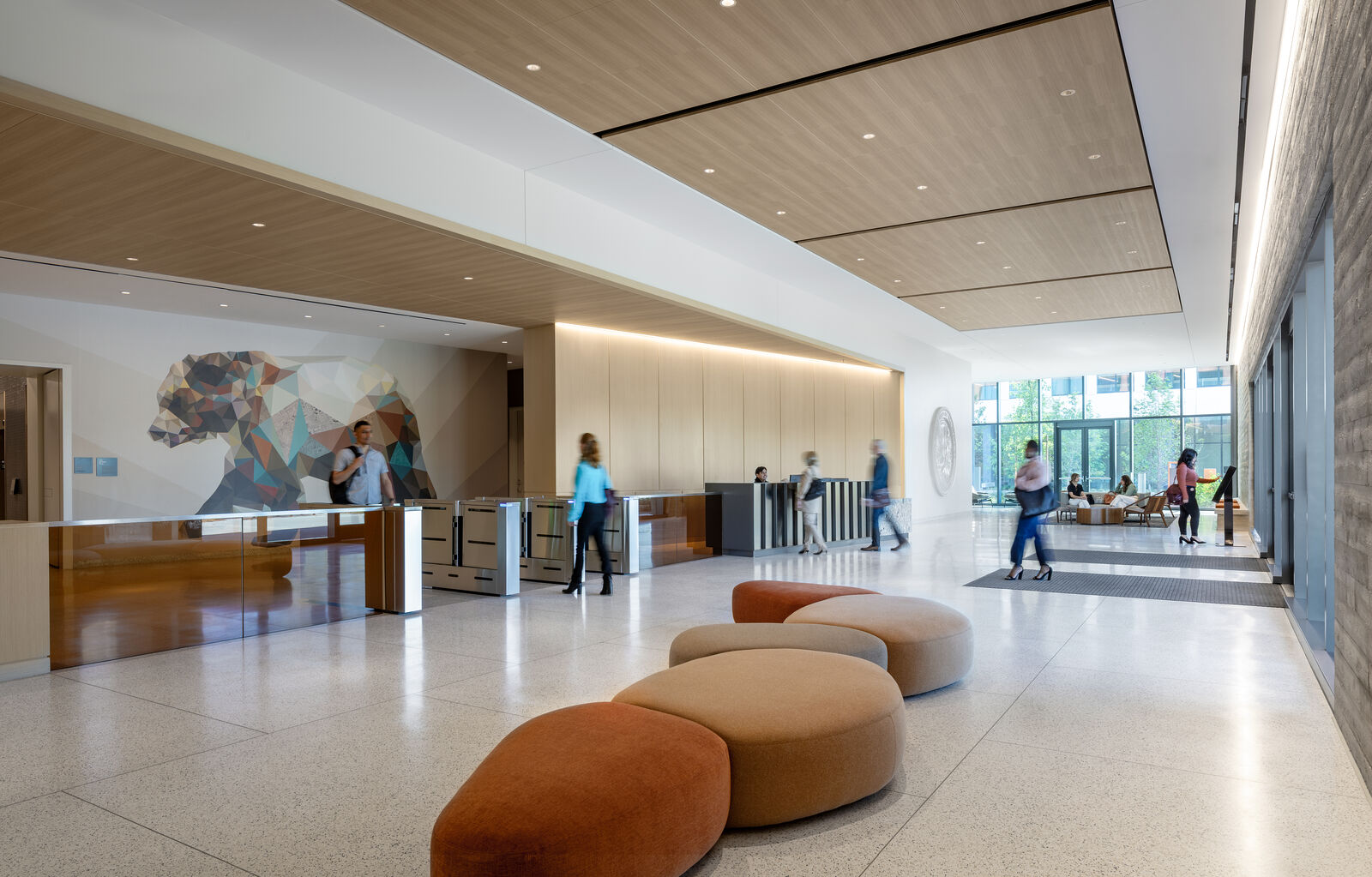 To enhance transparency, engage the community, and connect occupants to the vibrant plaza, the ground level public lobbies are located along the Green Pathway, which connects to the light rail station to the north and the parking garage to the south. Carrying the individuality of the buildings’ exterior design into the interior, each lobby features a distinct character expressed through unique colors, finishes, and furniture. Not only does this establish continuity in the design, but it provides wayfinding touchpoints to help users navigate campus and celebrate the identity of each tower.