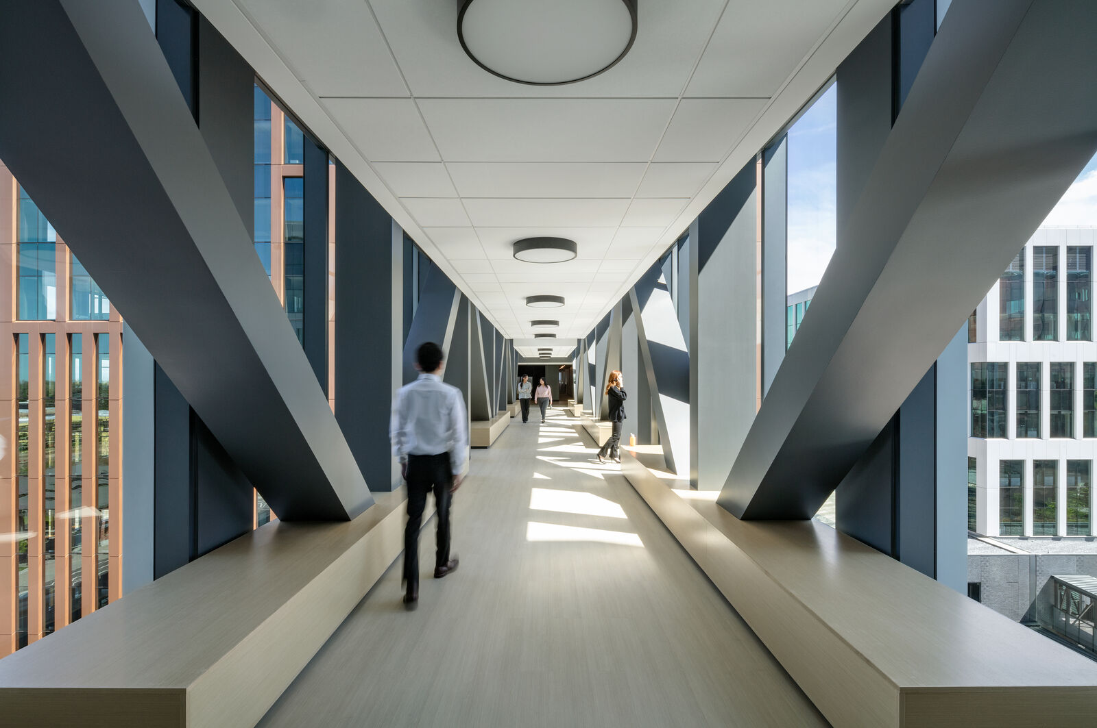 The pedestrian walkway connects the west-east podiums for easy circulation between amenity spaces on levels one and two, while the three-story bridge connects the northwest-northeast workplace towers to the northeast on levels four, five, and six.