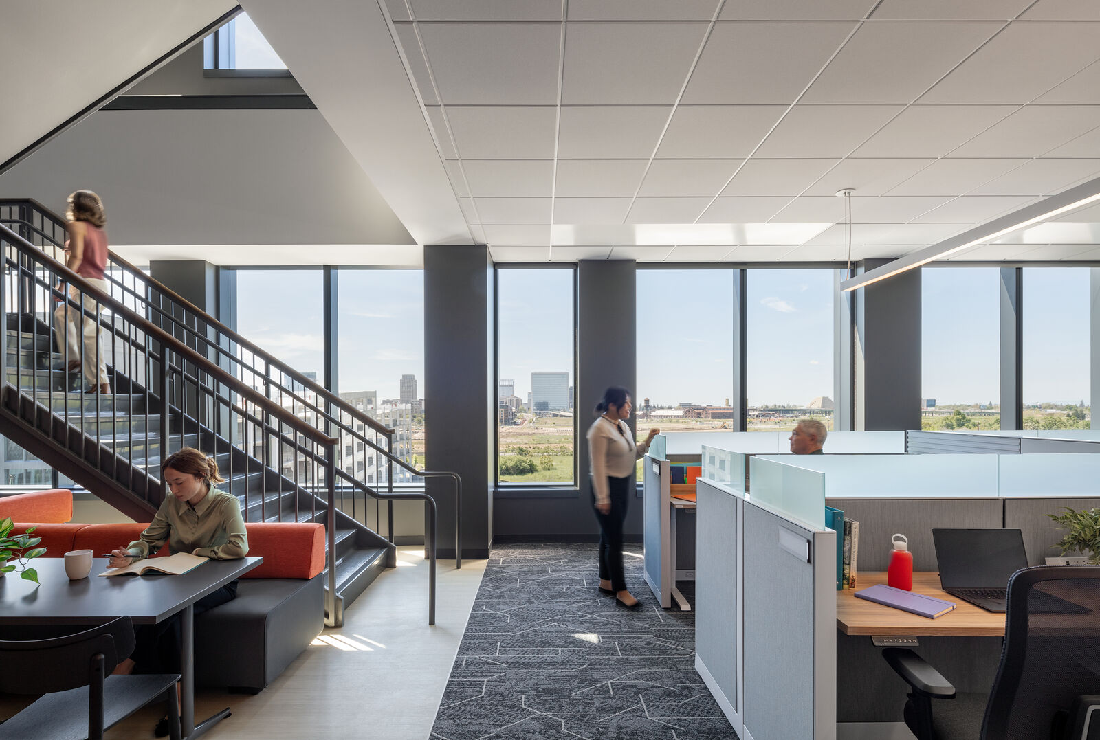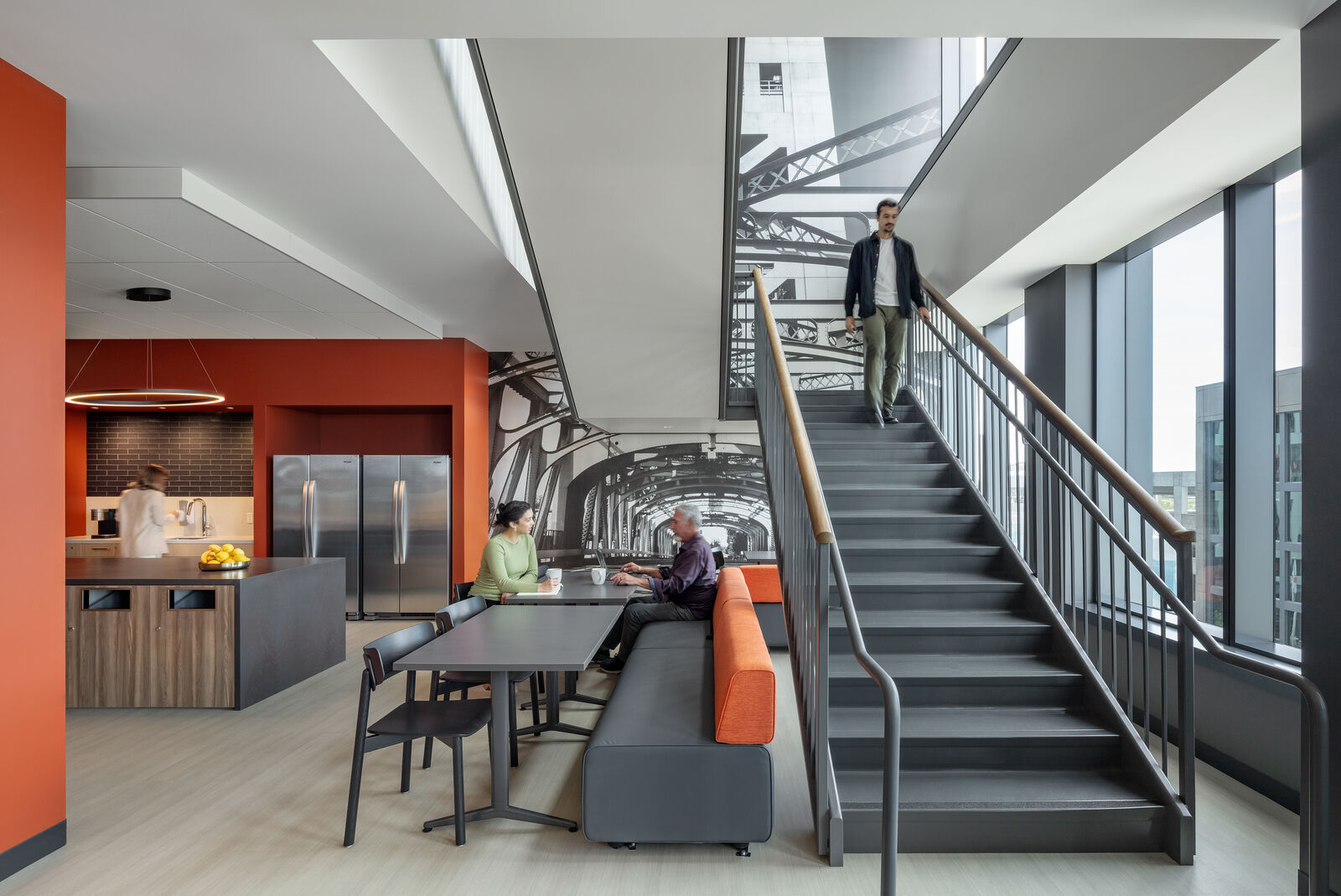 A critical element of a high-performing workplace is creating spaces that foster meaningful connections between colleagues. To support this interconnectivity, open stairs are provided for those departments that share multiple floors in each tower.