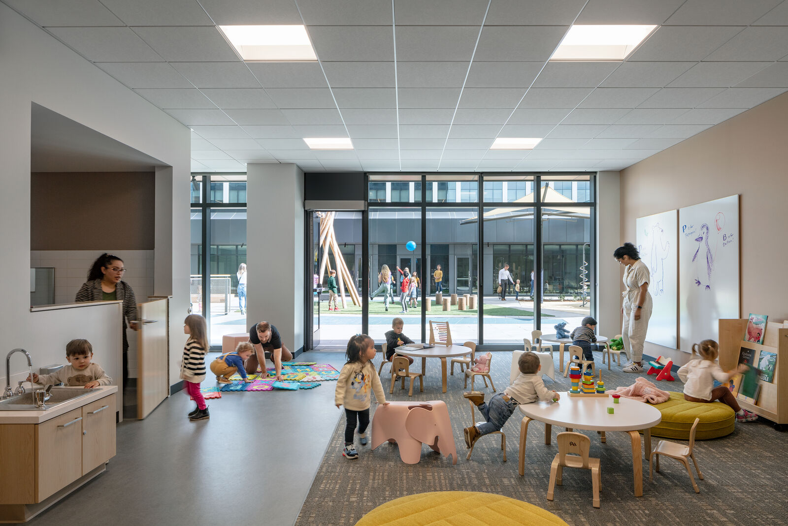 The Childcare Center playground is designed to be as lush and joyful as possible. To encourage nature play, exploration, and learning through look, touch, and feel, plant beds are immersive and interactive with informal paths traversing planted areas.