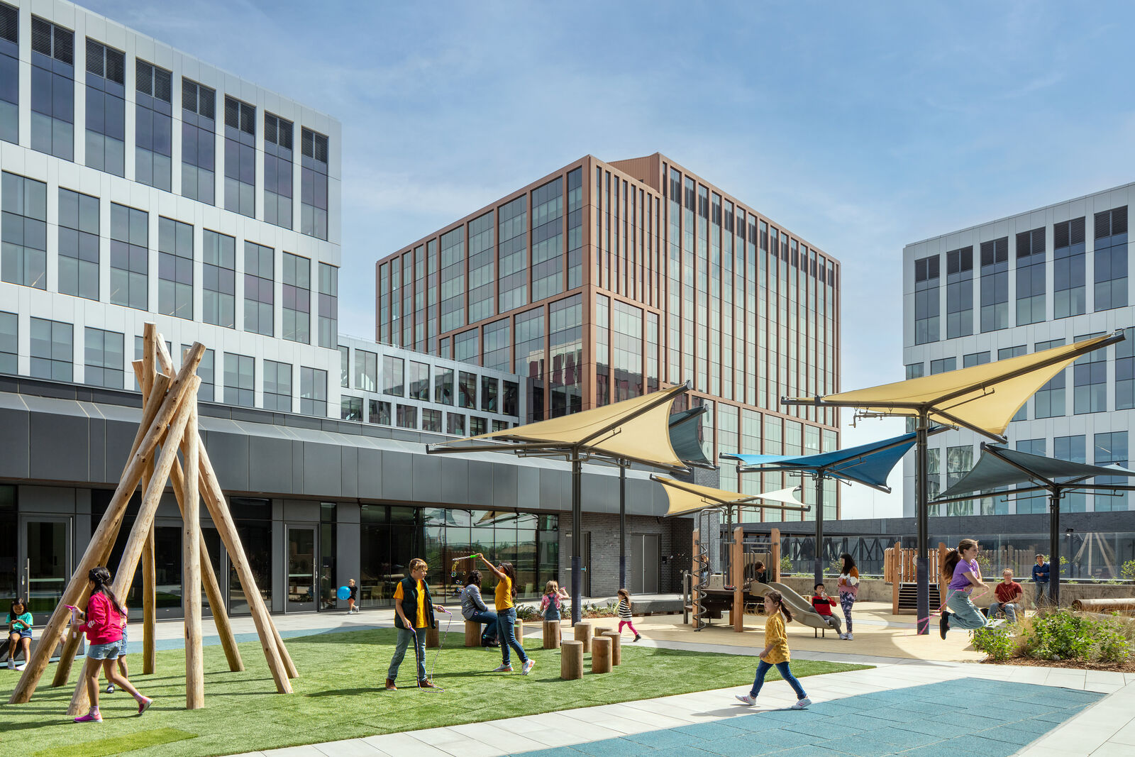 The three-parcel campus is sited on 17.5 acres at the key intersection of Richards Boulevard and North 7th Street. The River District revitalization plan defines this as the most prominent intersection in the growing neighborhood because of its access to North 7th Street, the conduit from the River District to downtown Sacramento, and its adjacencies to Interstate 5 and Highway 160 via Richards Boulevard. To activate the ground plane, an expansive landscaped courtyard is flanked by two amenity podiums that feature a dining hall, a multipurpose center with an auditorium, retail spaces, a fitness center, and a childcare center. This supports the city’s vision to extend the downtown street grid into the district, laying the groundwork for a mixed-use neighborhood.