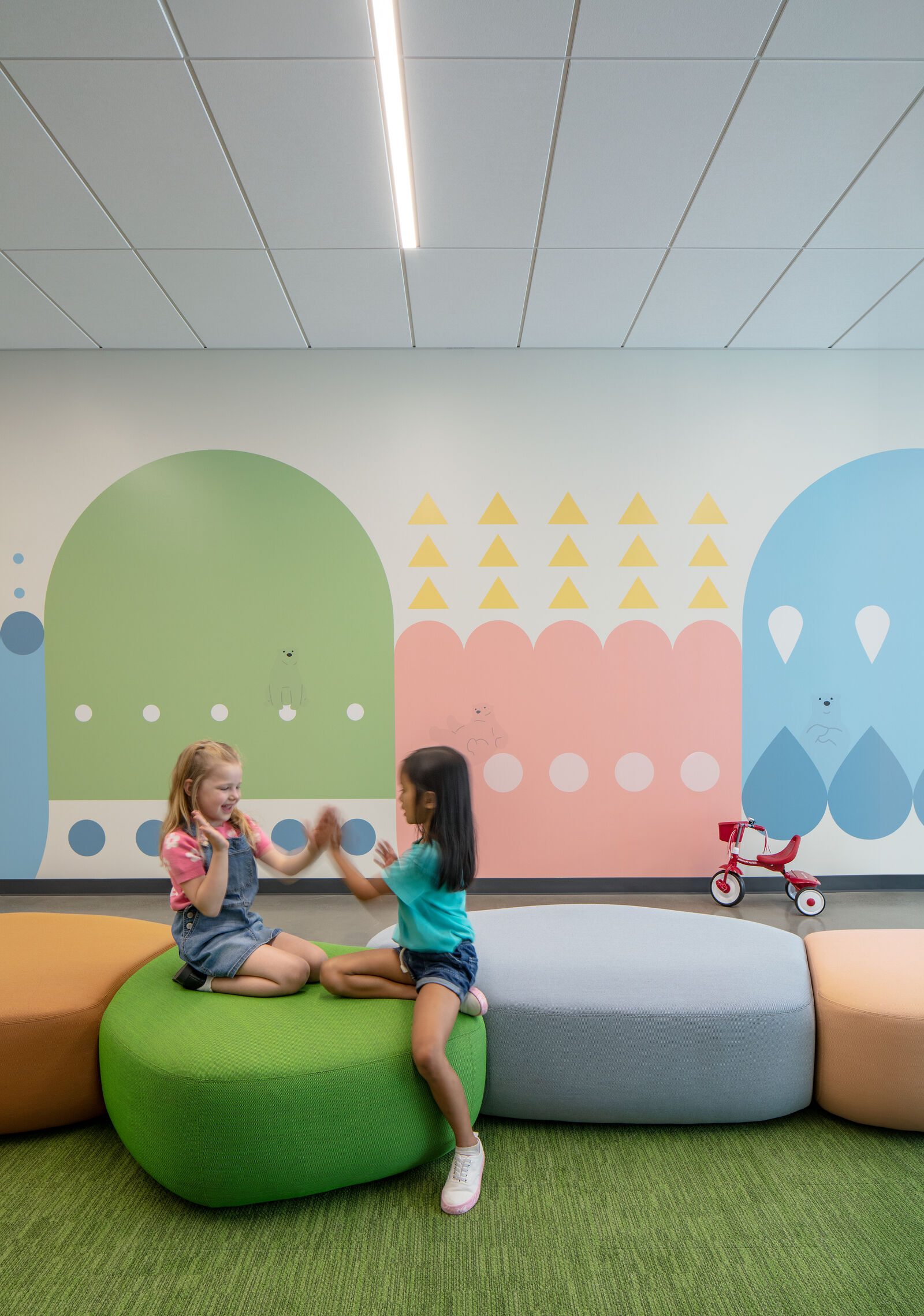 The California bear inspires environmental graphics throughout the campus to infuse both branding and subtle wayfinding. In the childcare entry, this is expressed in form of bear cub paws.