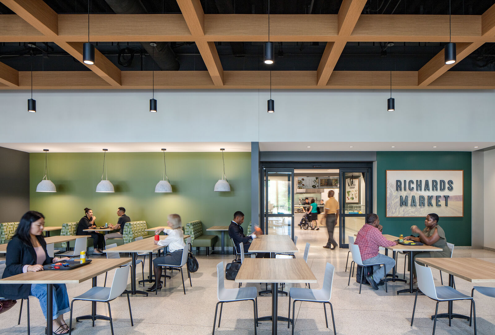 Serving as both a workplace for state employees and as a civic space, the site is designed to reinforce the development’s integration into the neighborhood. Retail space at the northeast corner will activate the complex along the urban edge of Richards Boulevard, while a full-service coffee shop at the south end of campus is accessed conveniently from the adjacent parking garage.