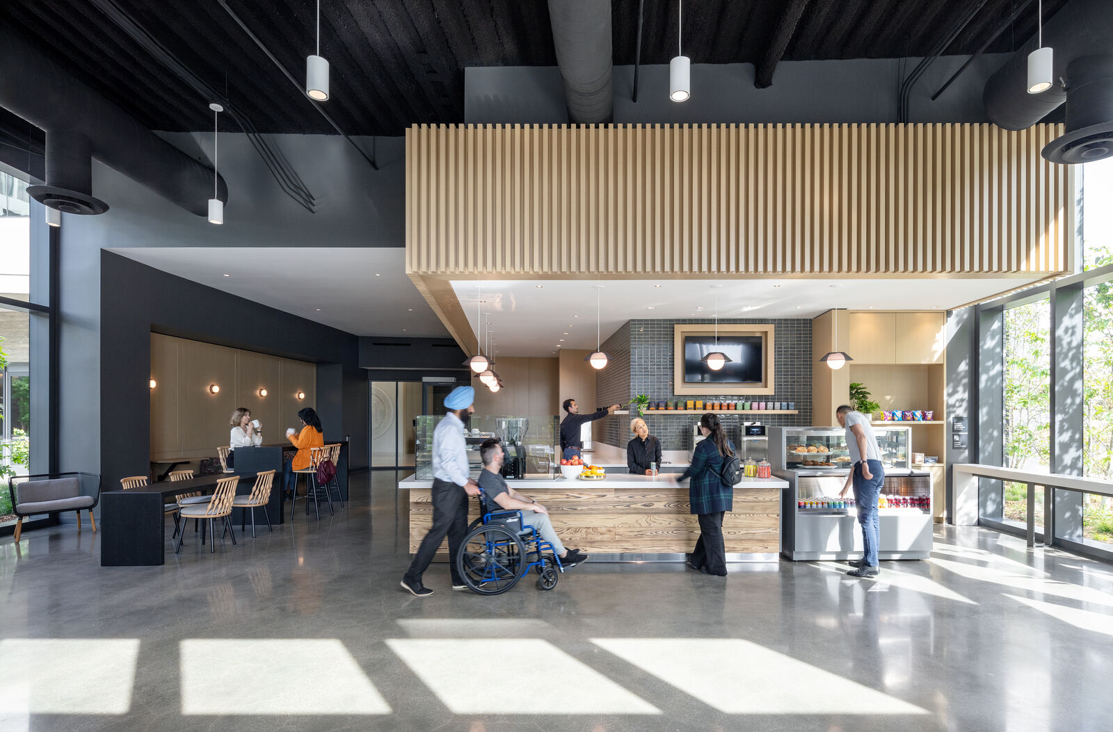 The scale of open space ensures the project resonates as an office building, a civic space, and a welcoming neighbor. The exterior palette is comprised of a family of industrial materials expressed in modern ways, including steel and mass timber.