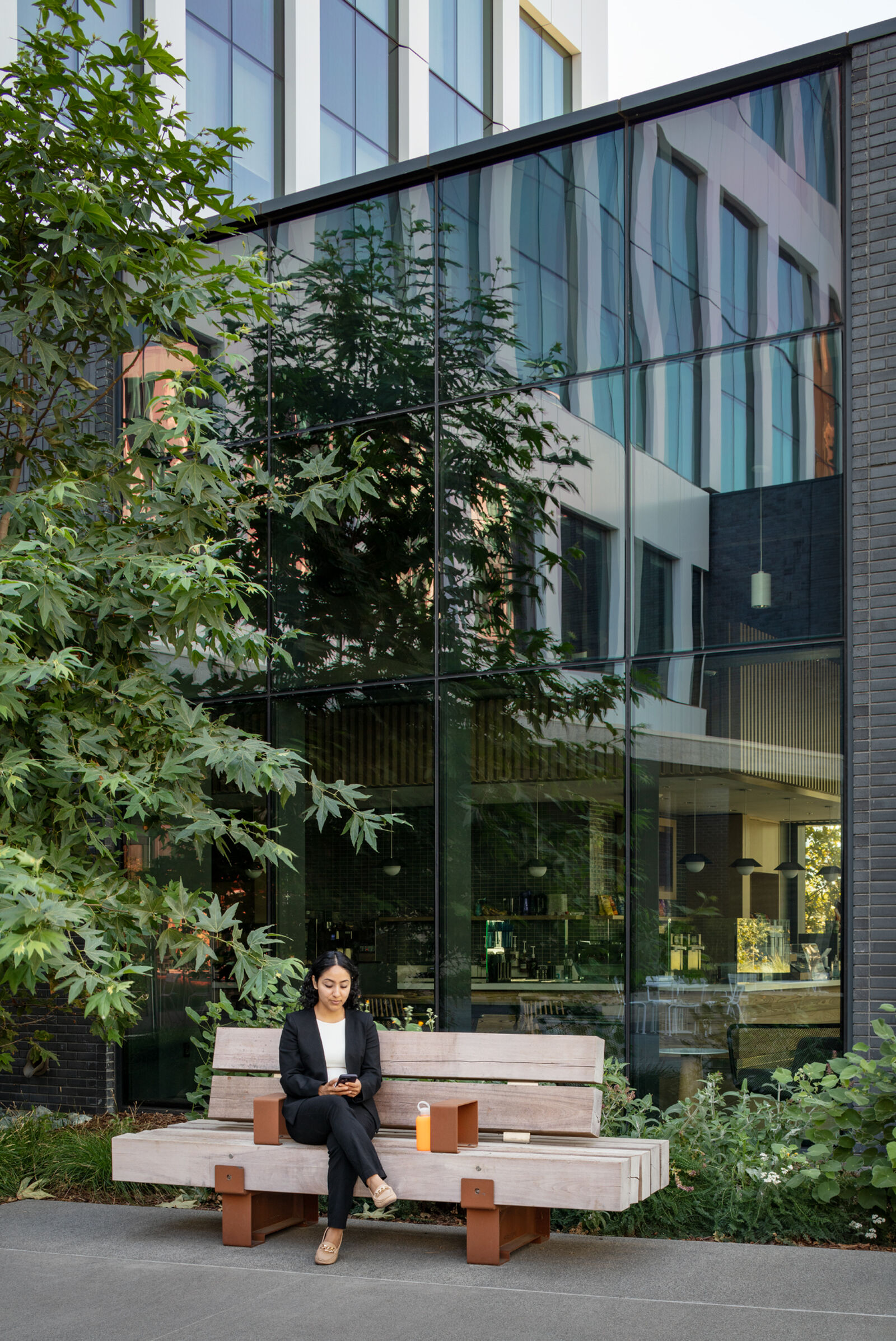 Sacramento’s tradition of tree-lined streets follows the grid and flows into the site, creating a seamless transition between old and new. A consistent tree canopy bounds the perimeter landscape, which blends the complex harmoniously into the River District and provides an ageless landscape of local flora and fauna. The interior of the development features a series of plazas connected by the north-south Green Pathway that link the Transit Plaza to the north, the central Town Square, and Bannon Street Plaza to the south. The Green Pathway is the main spine that connects the three parcels and allows pedestrians to circulate freely through campus, unifying the site into a single, cohesive whole. Flanked by trees on both sides, the design of the pathway prioritizes the pedestrian experience by providing outdoor shade and comfort year-round.