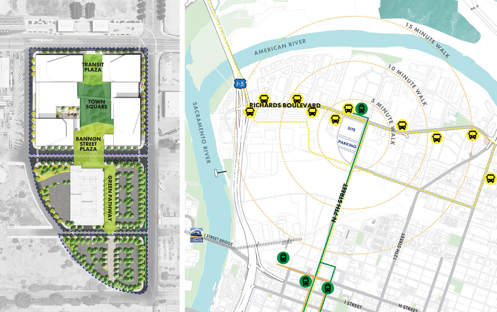 The May Lee State Office Complex site connects to Sacramento's downtown core via 7th street and is walkable to destinations within the River District.
