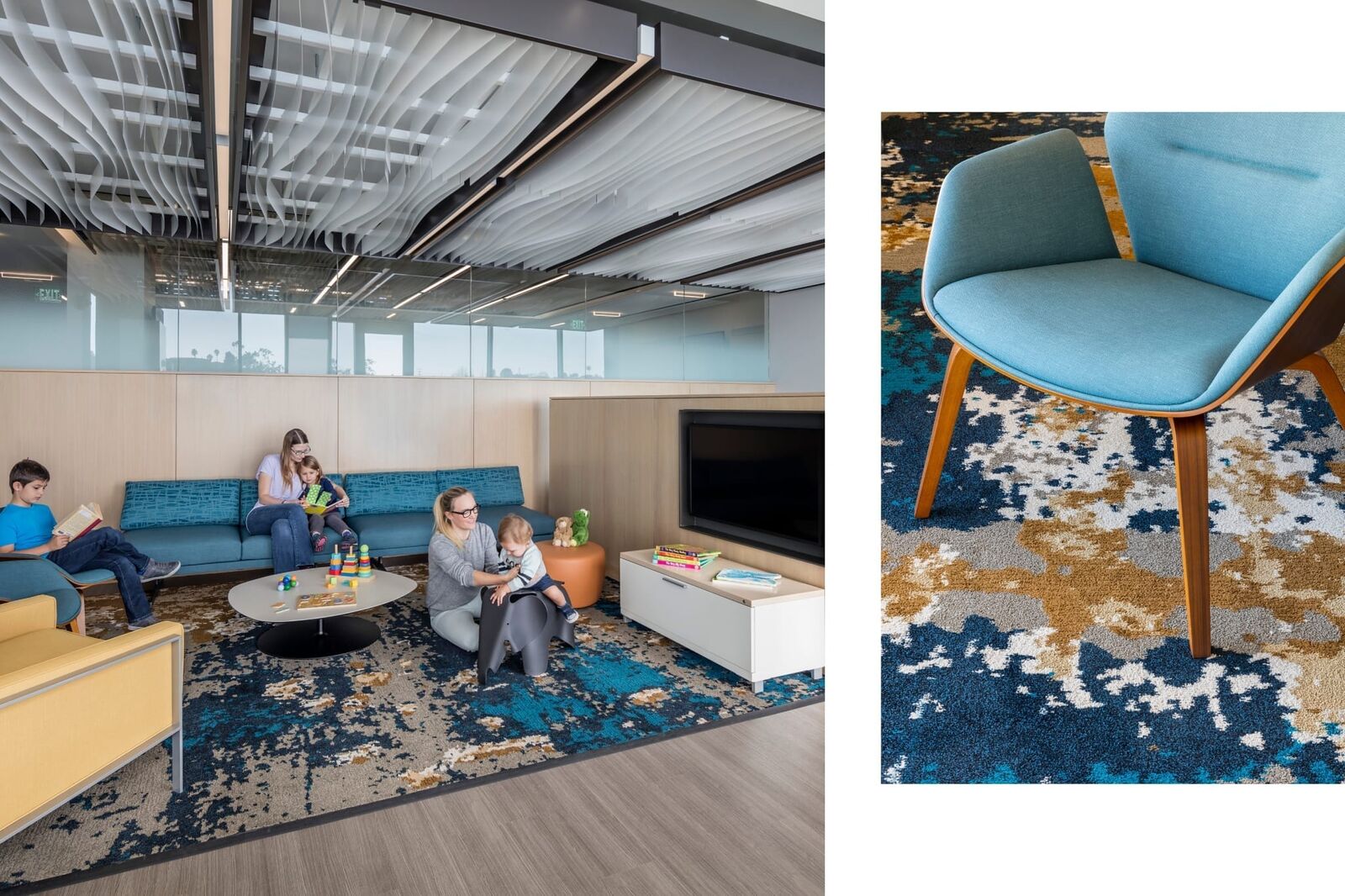 Inspired by the local coastal and wetland environment, graphic patterns are featured throughout the clinic, infusing a sense of biophilia into the space. These graphics, including environmental branding and wayfinding, were developed simultaneously with the interior design.