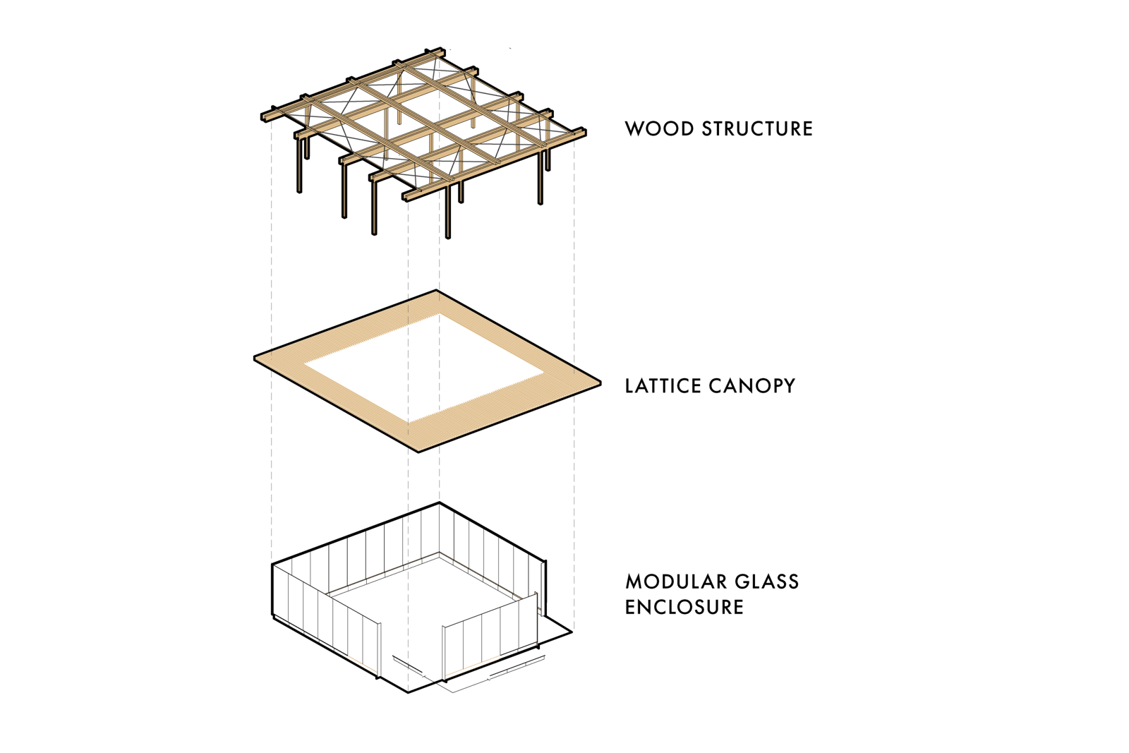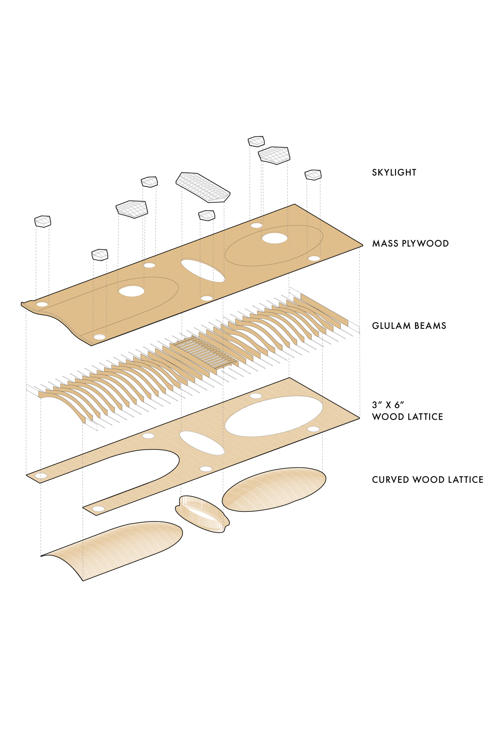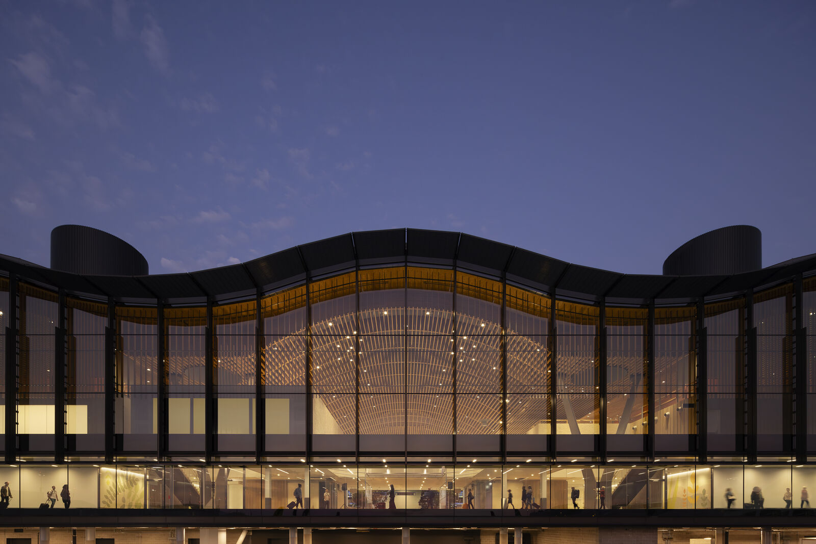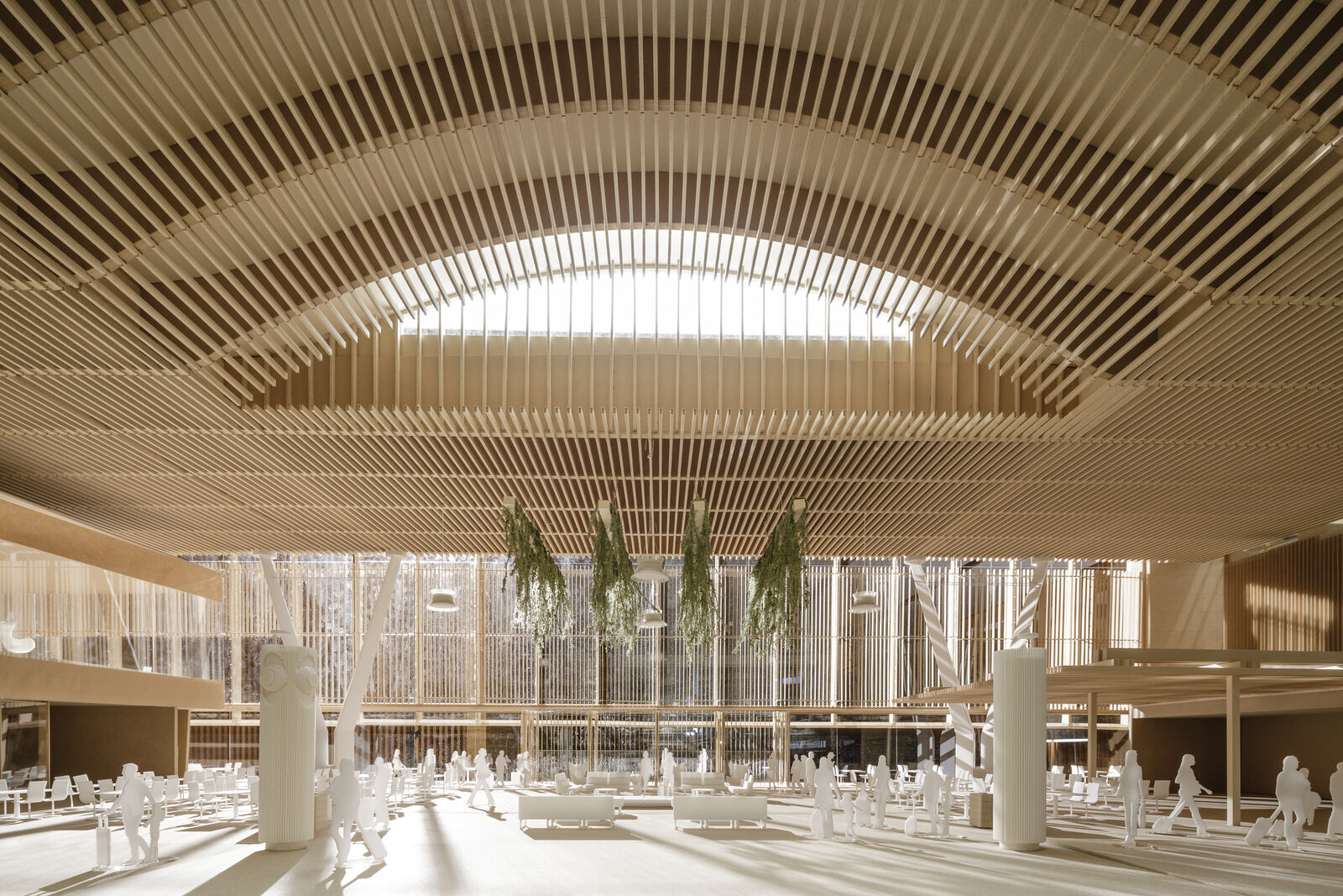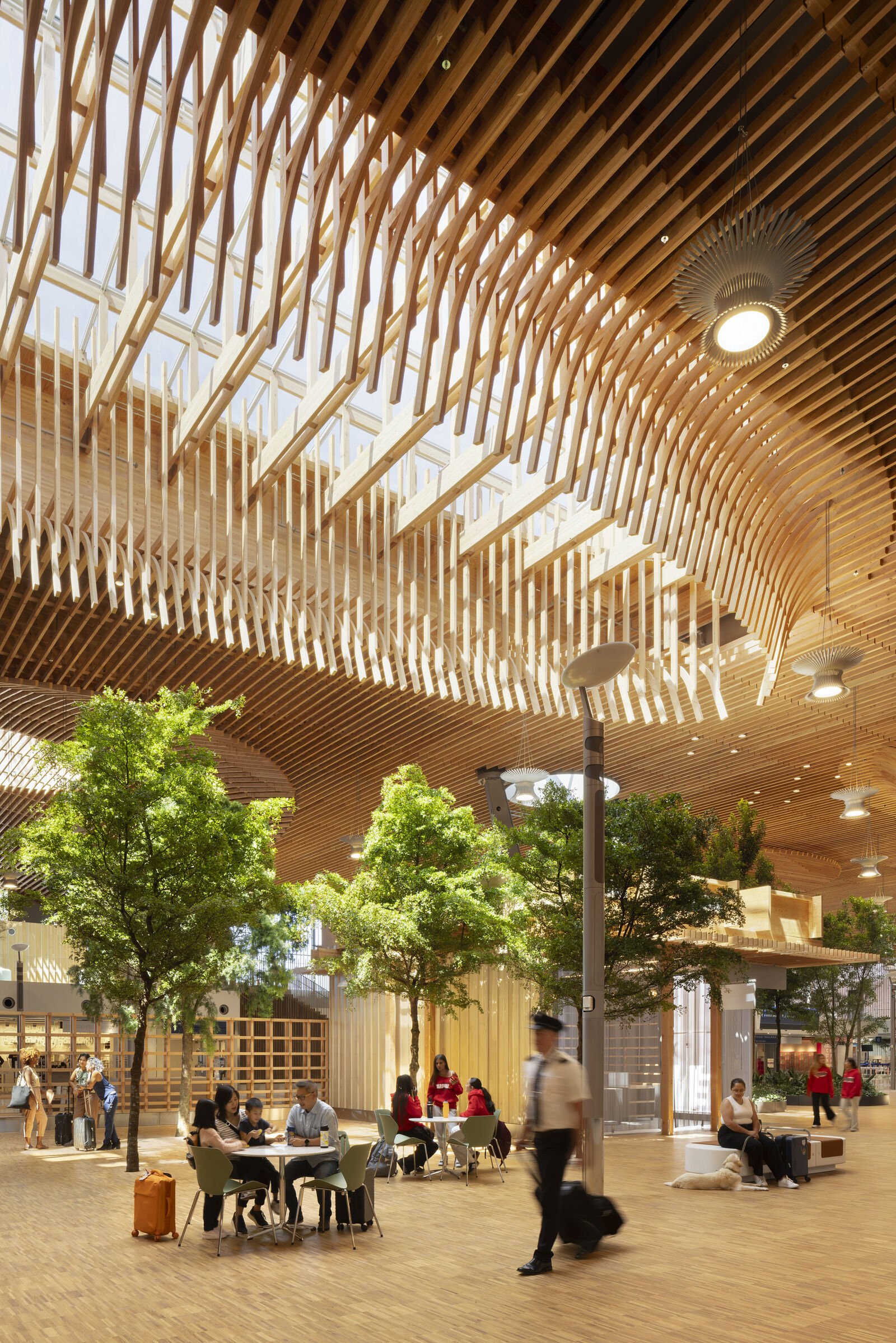 As passengers leave ticketing and enter the central threshold, daylight filters through the mass timber roof lattice and large skylight openings, like light filters through the trees within the protection of a tree canopy.