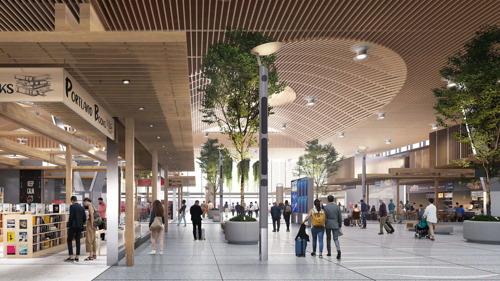 A central boulevard, inspired by the smaller scale of Portland’s city blocks, with cafe seating and urban furniture invites travelers to linger with trees and planters to help reinforce a neighborhood feel. Clear views, a high ceiling, and dappled light are critical to ensuring reduced stress and optimizing the overall passenger and retailer indoor environmental experience.