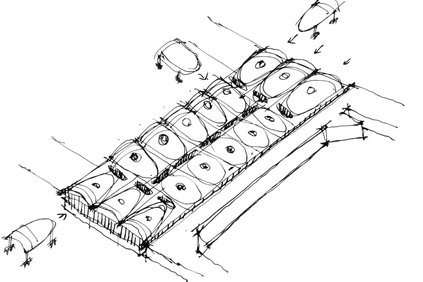 While the large-span roof structure of PDX Airport opens the space between columns for operational flexibility, the curvature also allows for a sequence of smaller independent structures below: concessions, offices, restrooms, and other airport services.