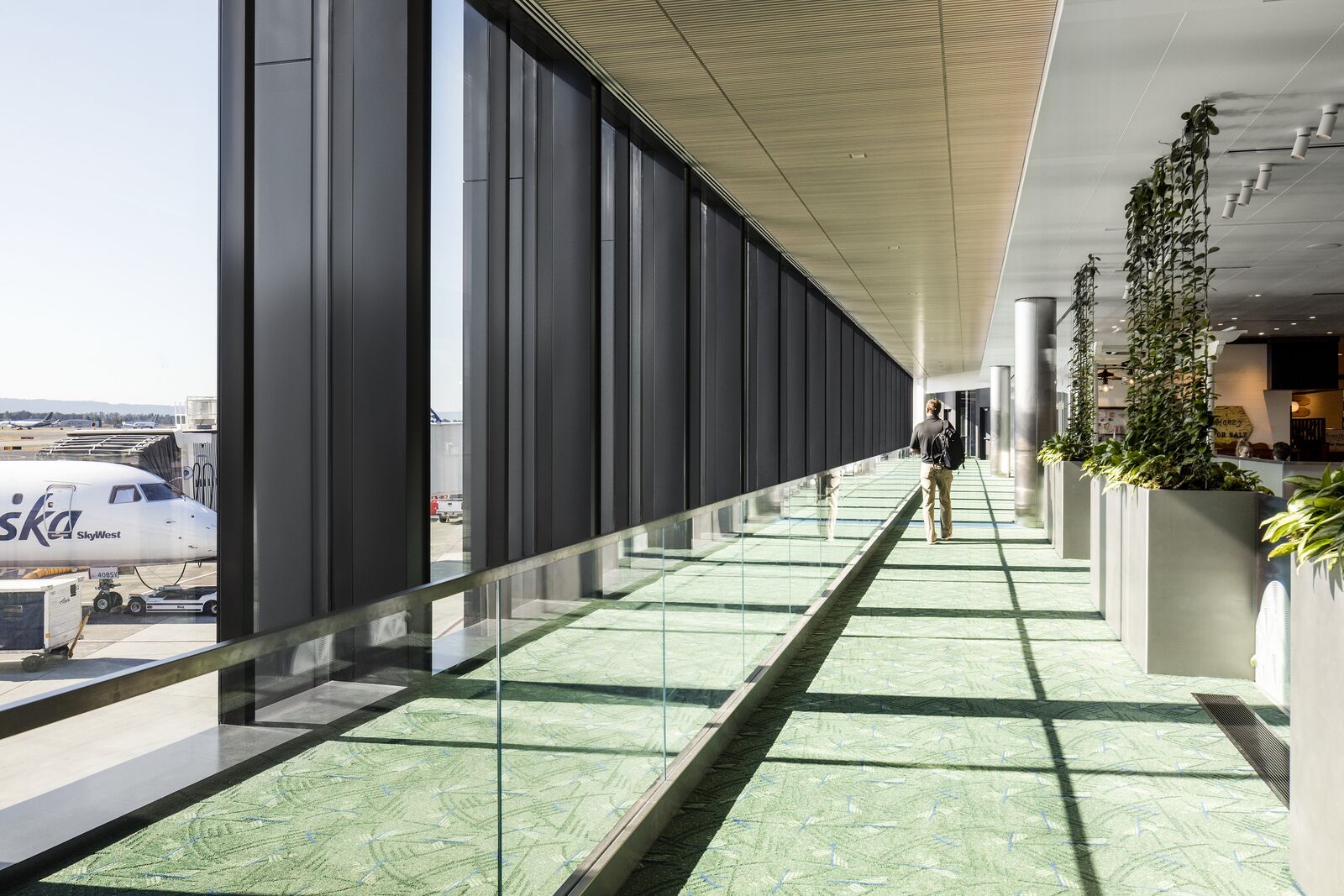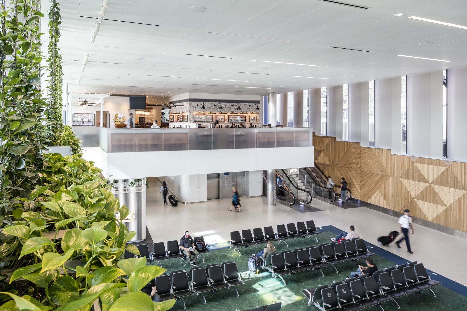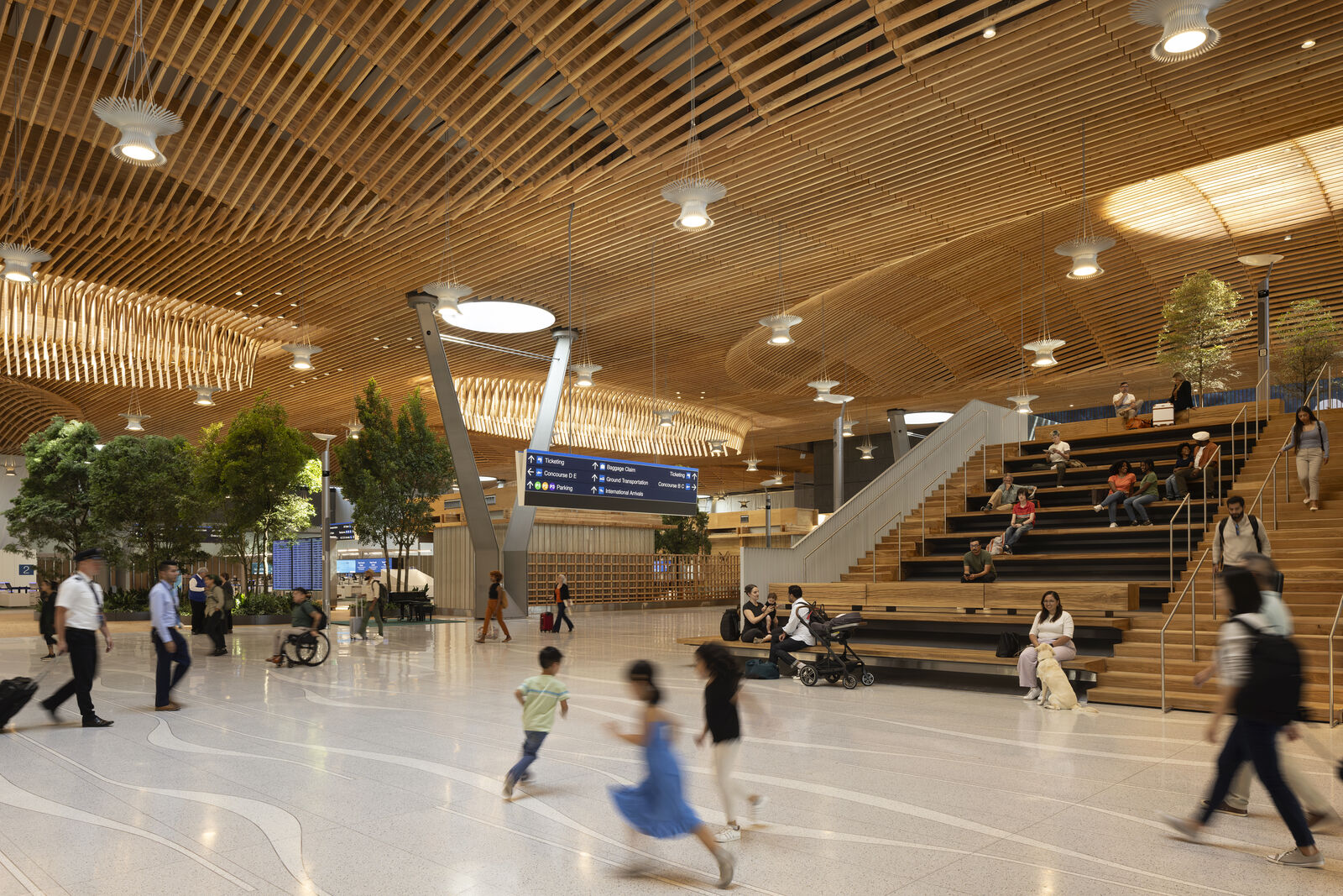 The landscaping provides a sense of wandering through a forest and serves double duty—acting as a wayfinding tool that guides passengers from security checkpoints to their ultimate destinations.